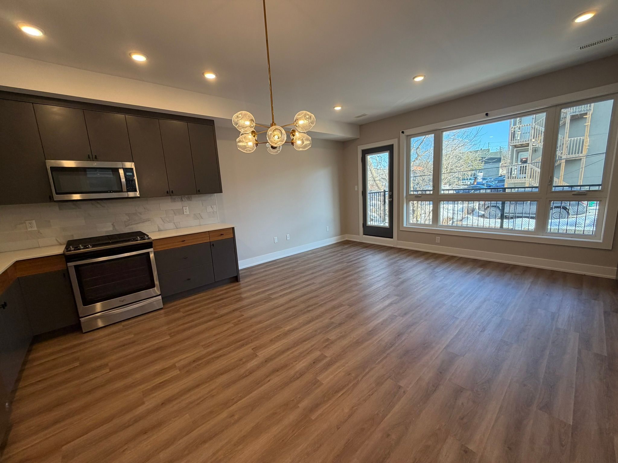 • Open concept living/dining with high ceilings and recessed lighting.