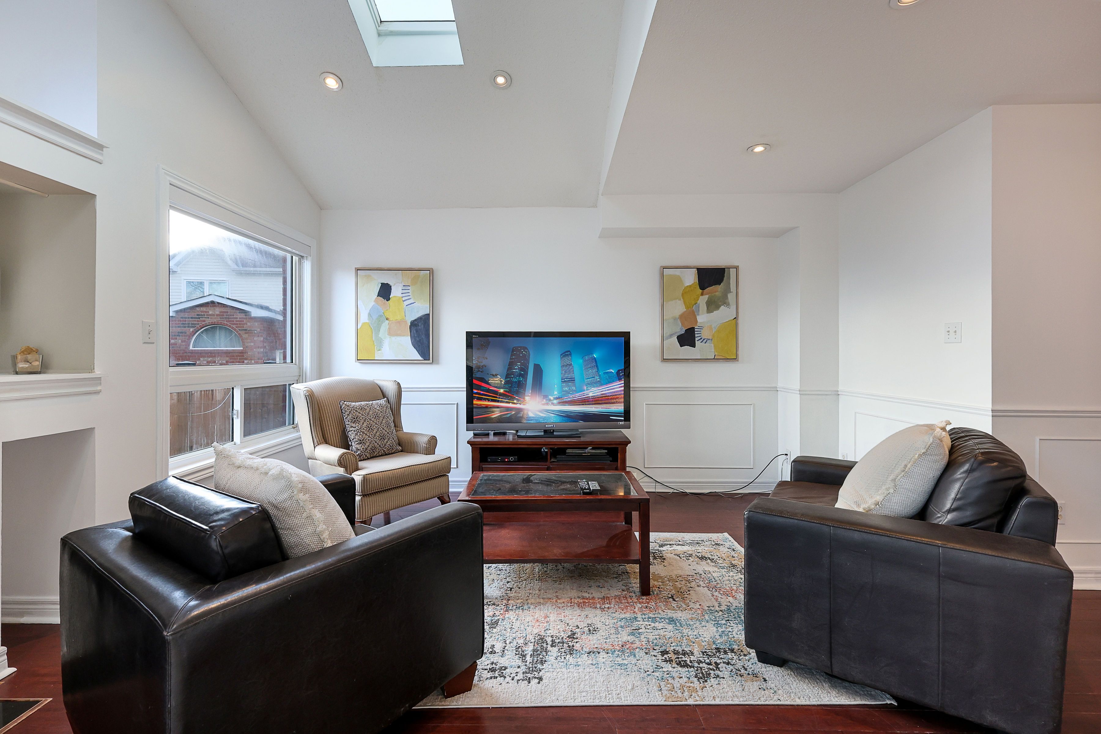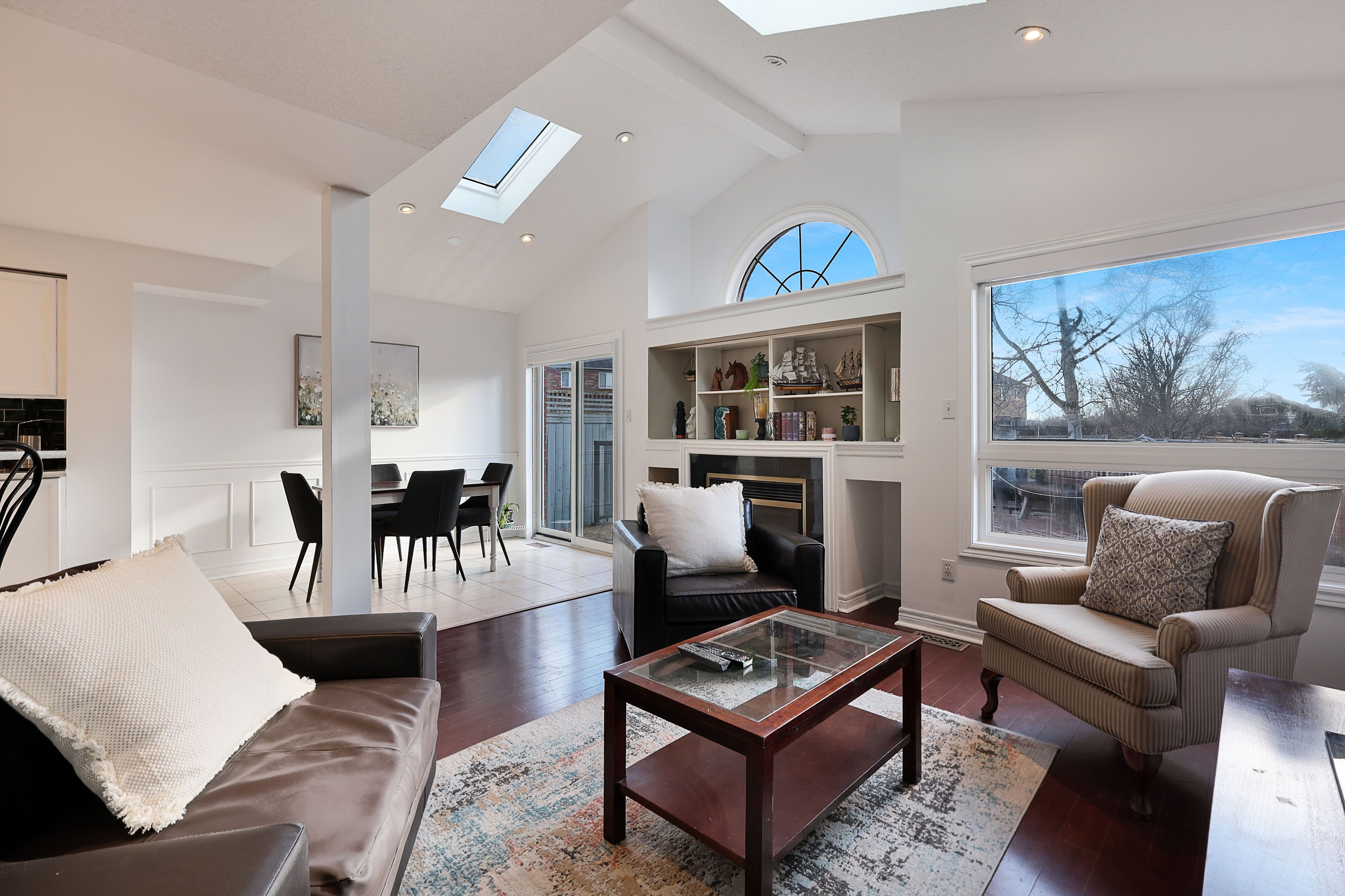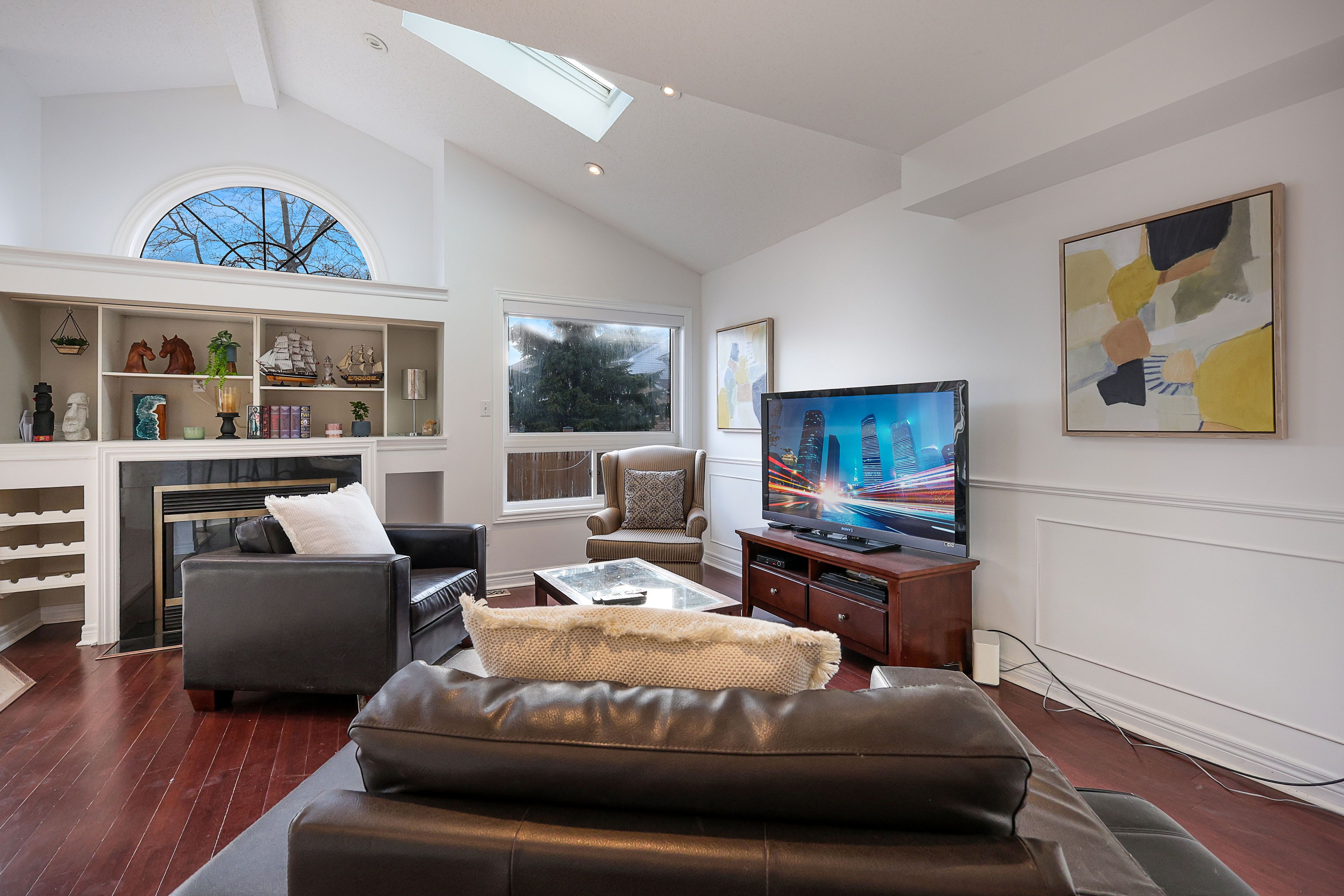 • Bright main floor family room featuring a gas fireplace and skylight.