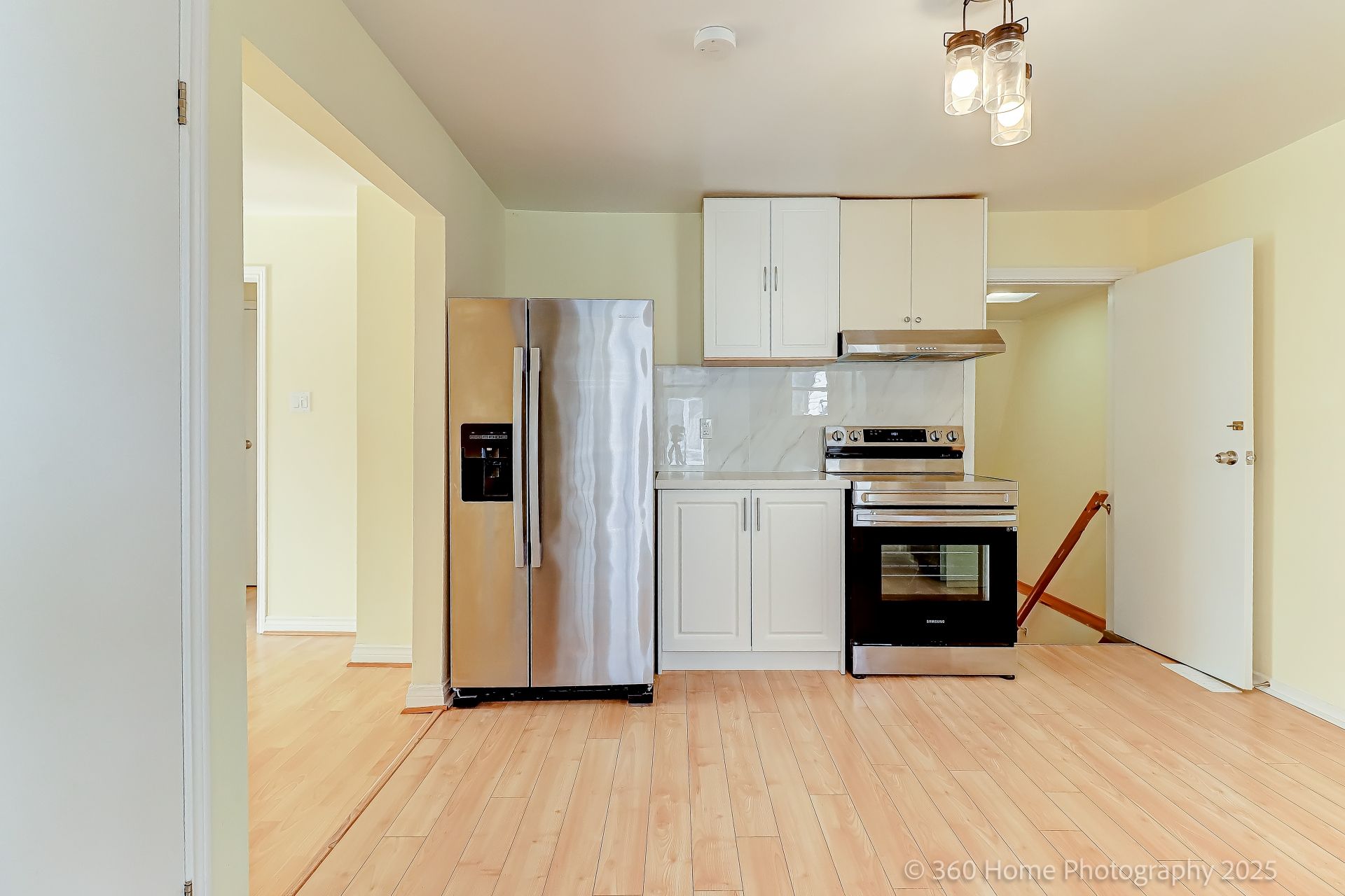 • Open concept kitchen with modern finishes and stainless steel appliances.