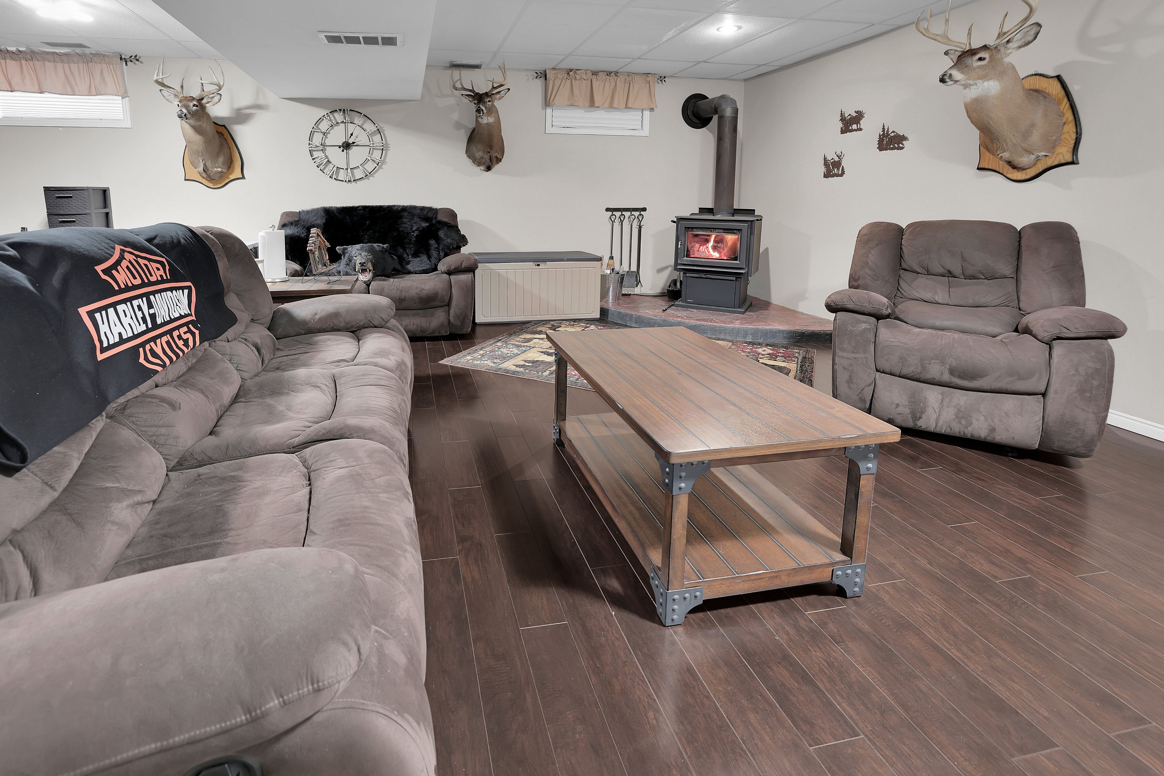• Finished basement featuring a recreation room with woodstove and storage options.
