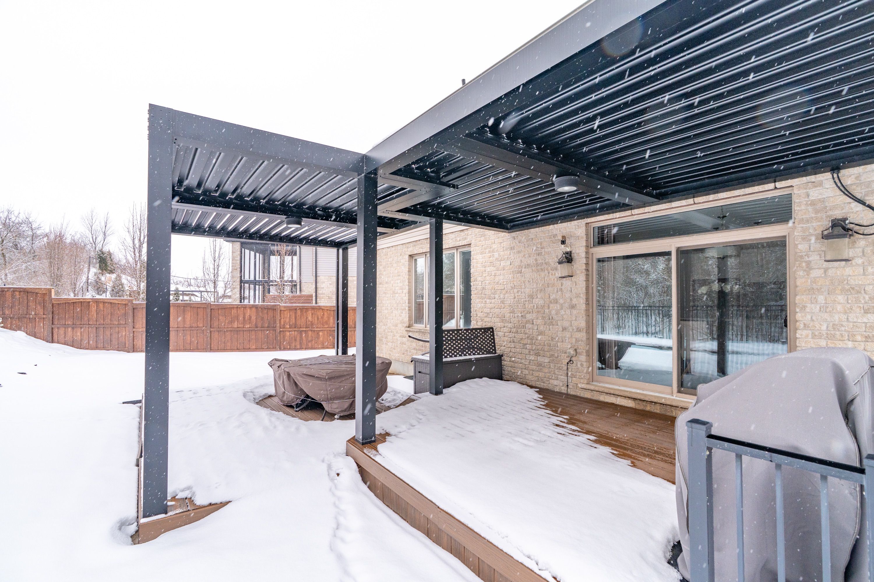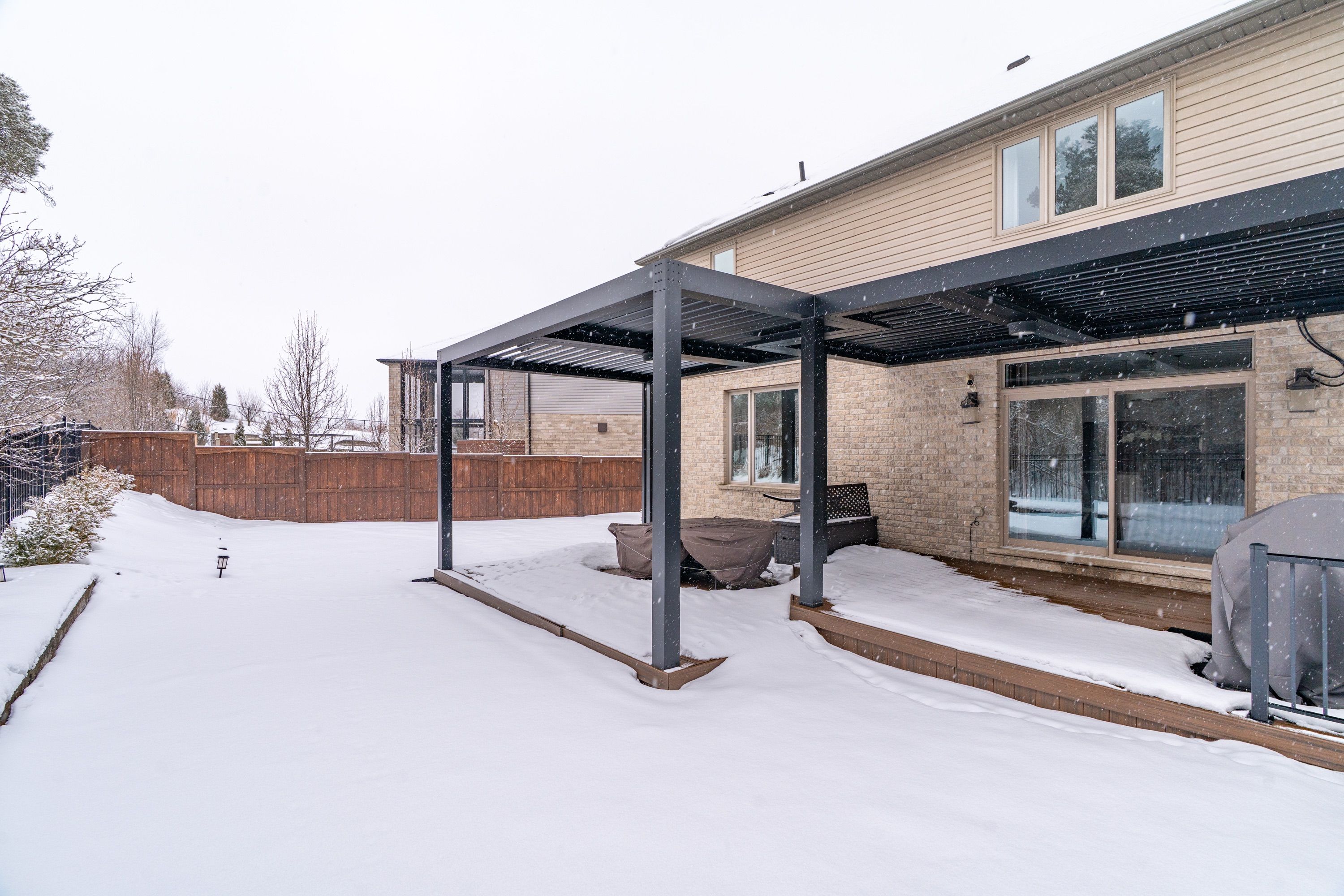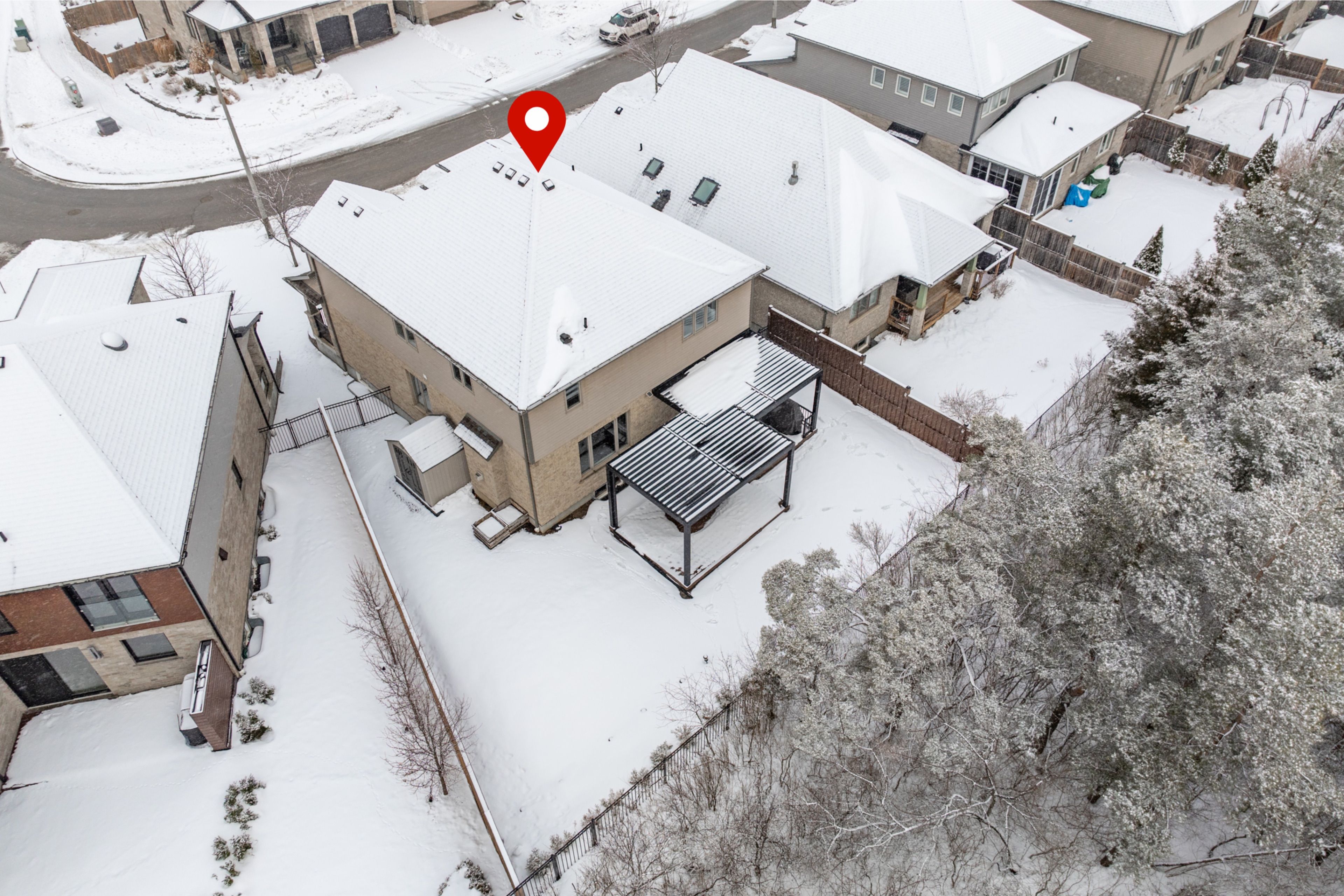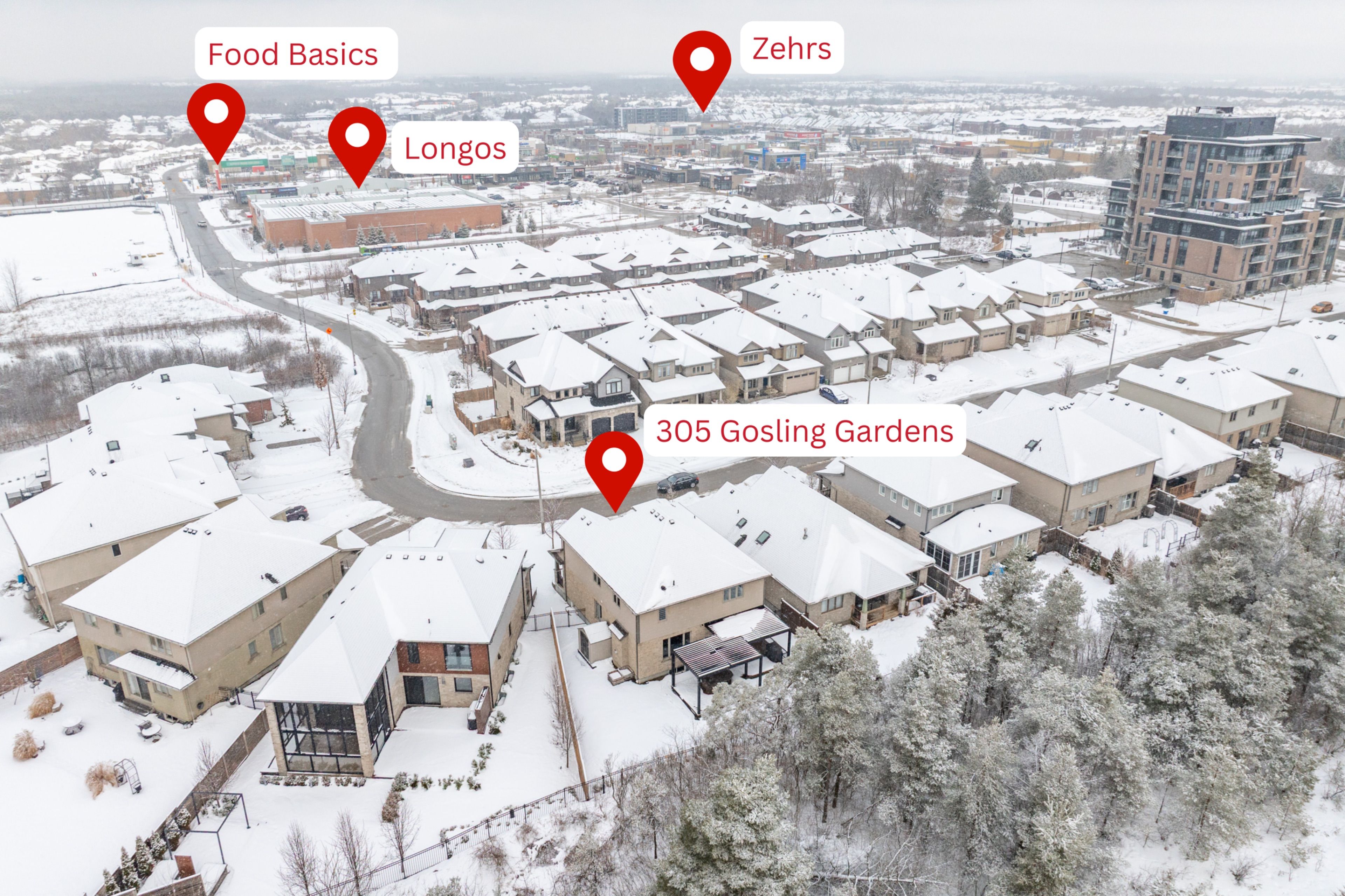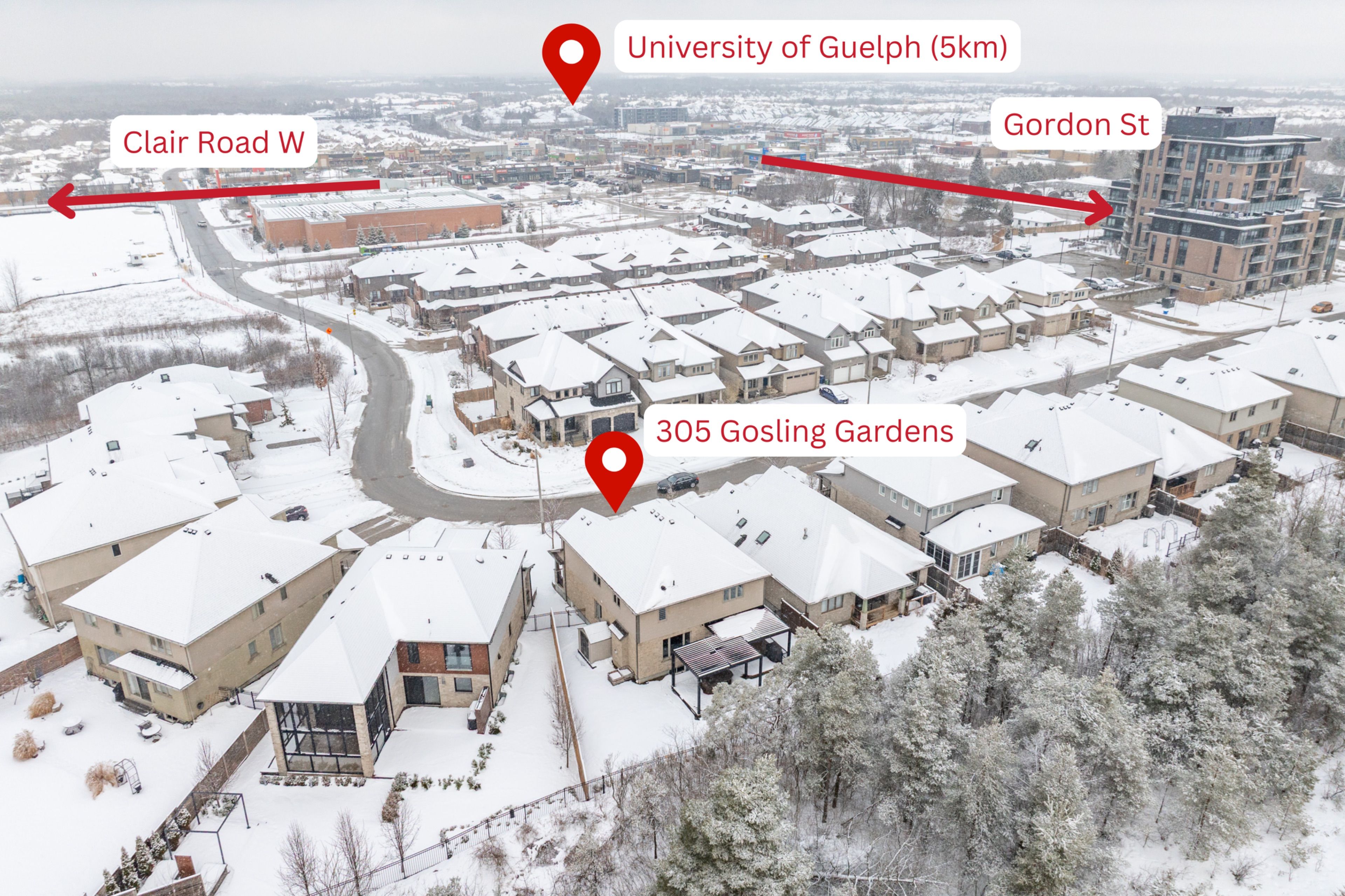 Welcome to 305 gosling gardens, a beautifully crafted home offering over 2,600 sq ft of living space, built by the reputable thomasfield homes. This residence showcases timeless design, thoughtful upgrades, and meticulous care throughout. Curb appeal is immediately evident with a double-car garage, a concrete-finished driveway accommodating up to four vehicles, a wide front porch, and a beautifully landscaped front garden. Step inside to a striking open-to-above foyer that fills the home with natural light and creates an impressive sense of space. The main level features a warm and inviting family room with a built-in fireplace. The kitchen is both elegant and highly functional, featuring a cooktop stove, premium bosch appliances, and a large centre island. The bright breakfast area overlooks the backyard, making it ideal for family meals and entertaining. A formal dining room, living room, laundry room, and powder room complete this well-designed main floor. Upstairs, a rare open-to-below home office overlooks the foyer, offering a bright and inspiring work-from-home space. The primary bedroom retreat boasts a spacious walk-in closet and a well-appointed ensuite with double sinks. Two additional generously sized bedrooms share a jack-and-jill bathroom, creating an ideal layout for families. Step outside to enjoy a rare pie-shaped lot fully fenced yard, highlighted by double decks with a professionally built, remote-controlled motorized gazebo, nearly $4k investment and offering adjustable shade for comfortable, all-season outdoor enjoyment. Ideally located in guelph's sought-after south end, this home is close to everyday amenities and future growth, including the upcoming south end community centre and bishop macdonell catholic secondary school, with quick access to highway 401 for commuters. A true hidden gem combining quality construction, elegant design, and an exceptional location-305 gosling gardens is a home you'll be proud to call your own.