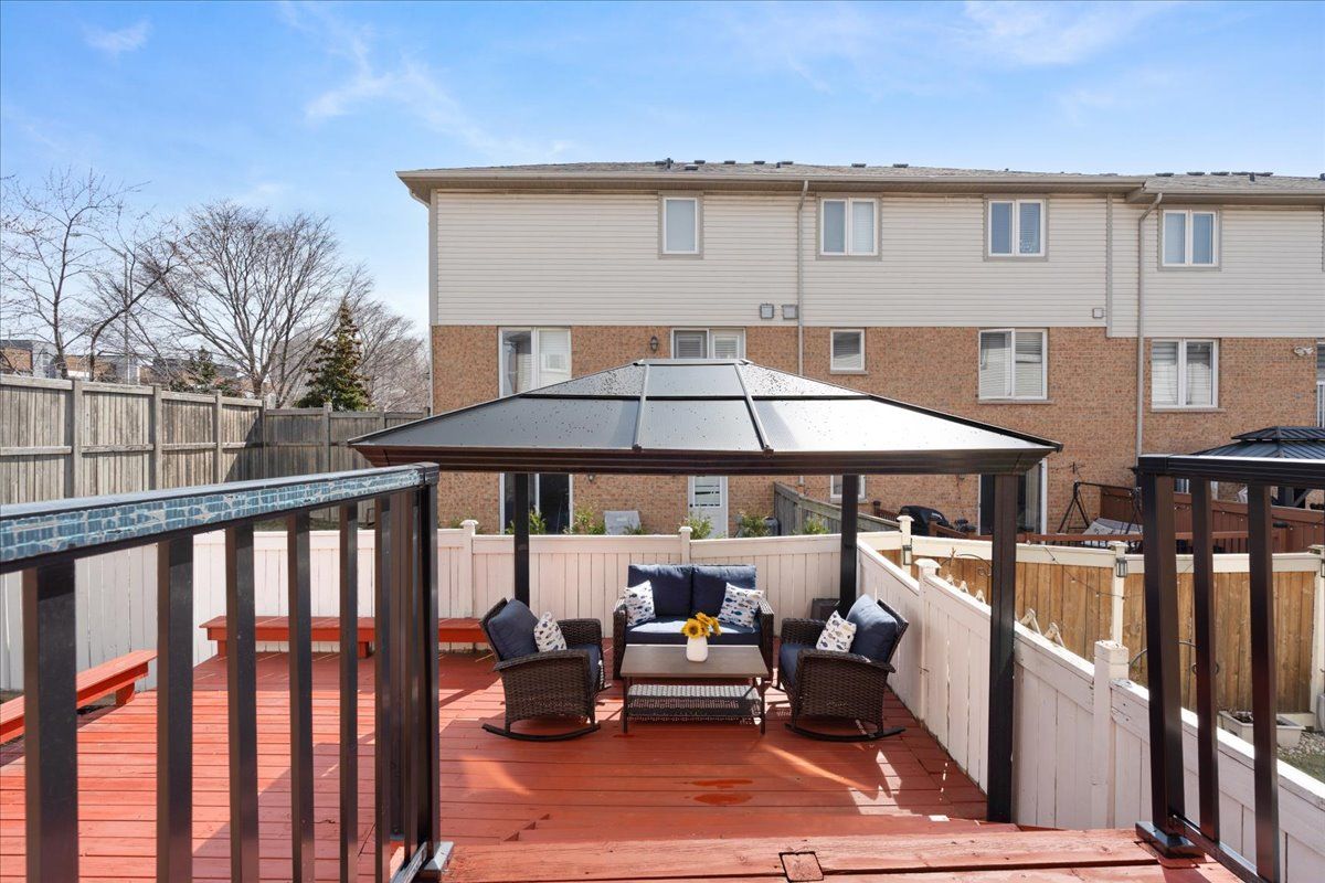 The crown jewel of bronte creek, this rare corner-unit feels like a semi-detached home. Approximately 2,600 square feet of living space across all levels on the street featuring a secluded private front porch, unmatched curb appeal and architectural presence in one of oakville's most prestigious communities. Prime location: ideally situated within walking distance to top-rated schools, places of worship and famous 'elephant park' splash pad. You are also minutes away from bronte creek provincial park, the hospital, and major transit routes (407/qew/go station). Enjoy total peace of mind with recent upgrades: renovated primary ensuite (2026), washer and dryer (2026), refrigerator (2023), lennox high-efficiency furnace (2022), and a/c (2021). A rare main-level floor plan defining functional luxury. Enjoy the versatility of separate living and family rooms-perfectly tailored for both formal hosting and cozy daily life. Zero carpet. Total luxury. High-end flooring on every level, designed for a clean, healthy, and effortless lifestyle. Triple-exposure light fills the interior, highlighting a gourmet kitchen and premium fridge. California shutters and dual-pane windows ensure quiet, climate-controlled comfort. The professionally finished basement, with new flooring & tiles (2026), includes a secondary kitchen, bedroom, 3-pc bath, and a spacious living area, making it ideal for extended family living or an in-law suite. A backyard like no other. Escape to a private, sun-drenched sanctuary featuring a grand gazebo and an expansive deck designed for epic summer gatherings. Complemented by a dedicated ev-ready garage, this property defines modern sustainability and outdoor luxury.