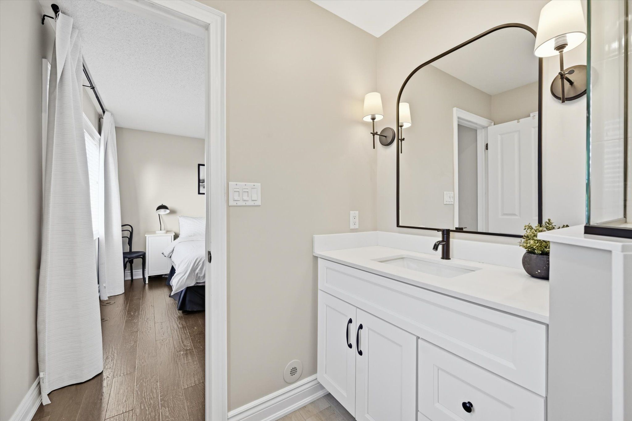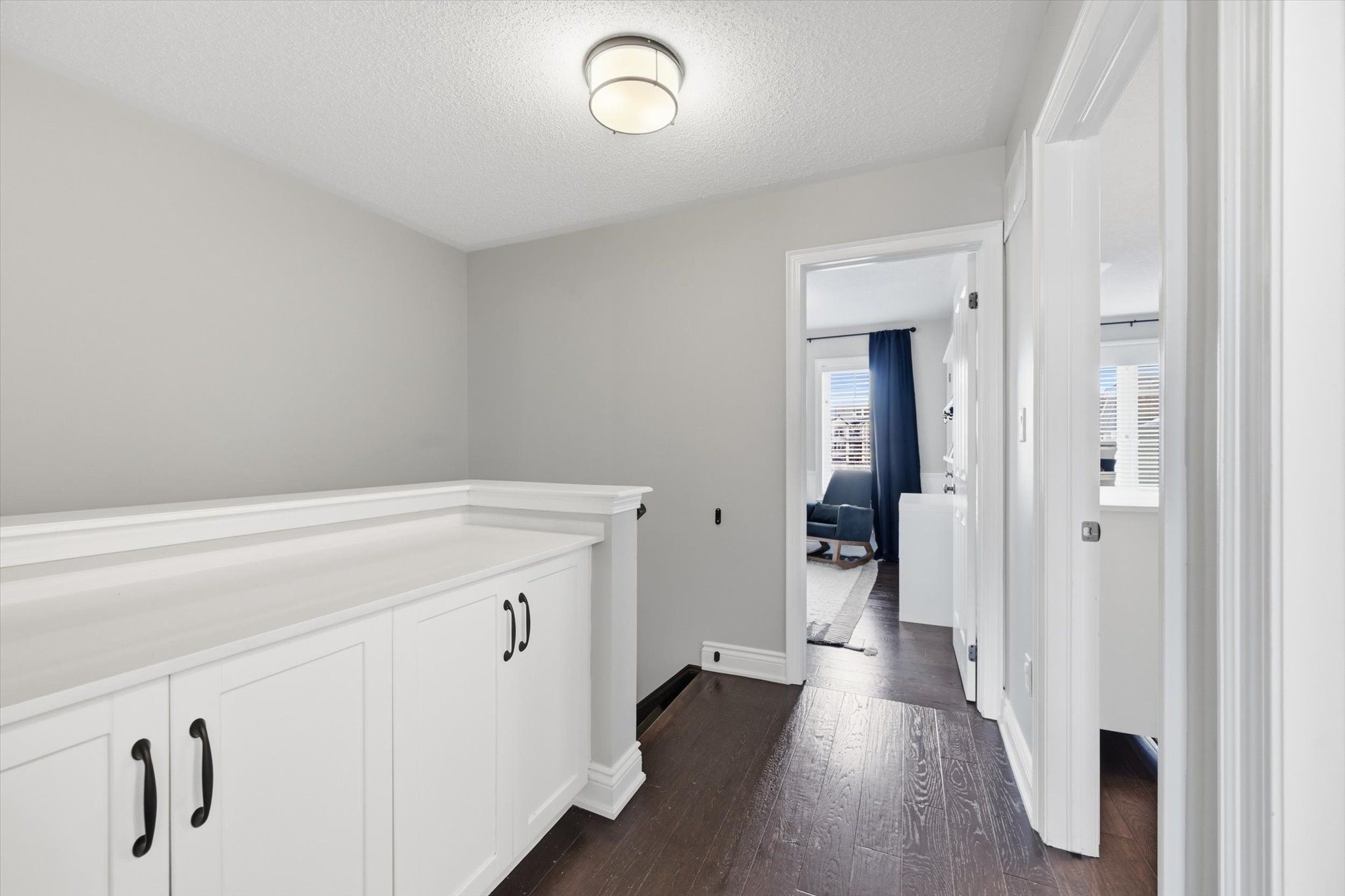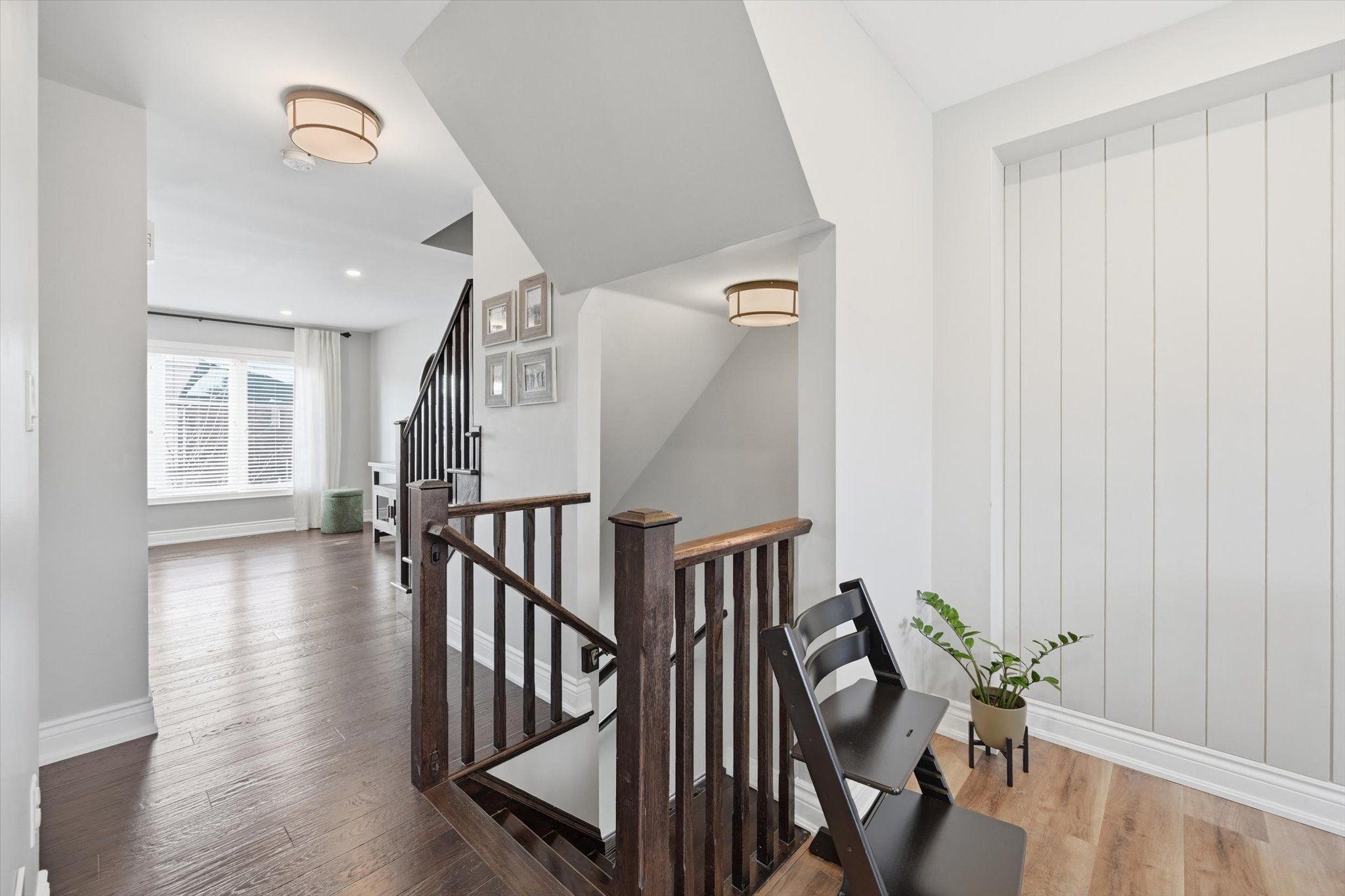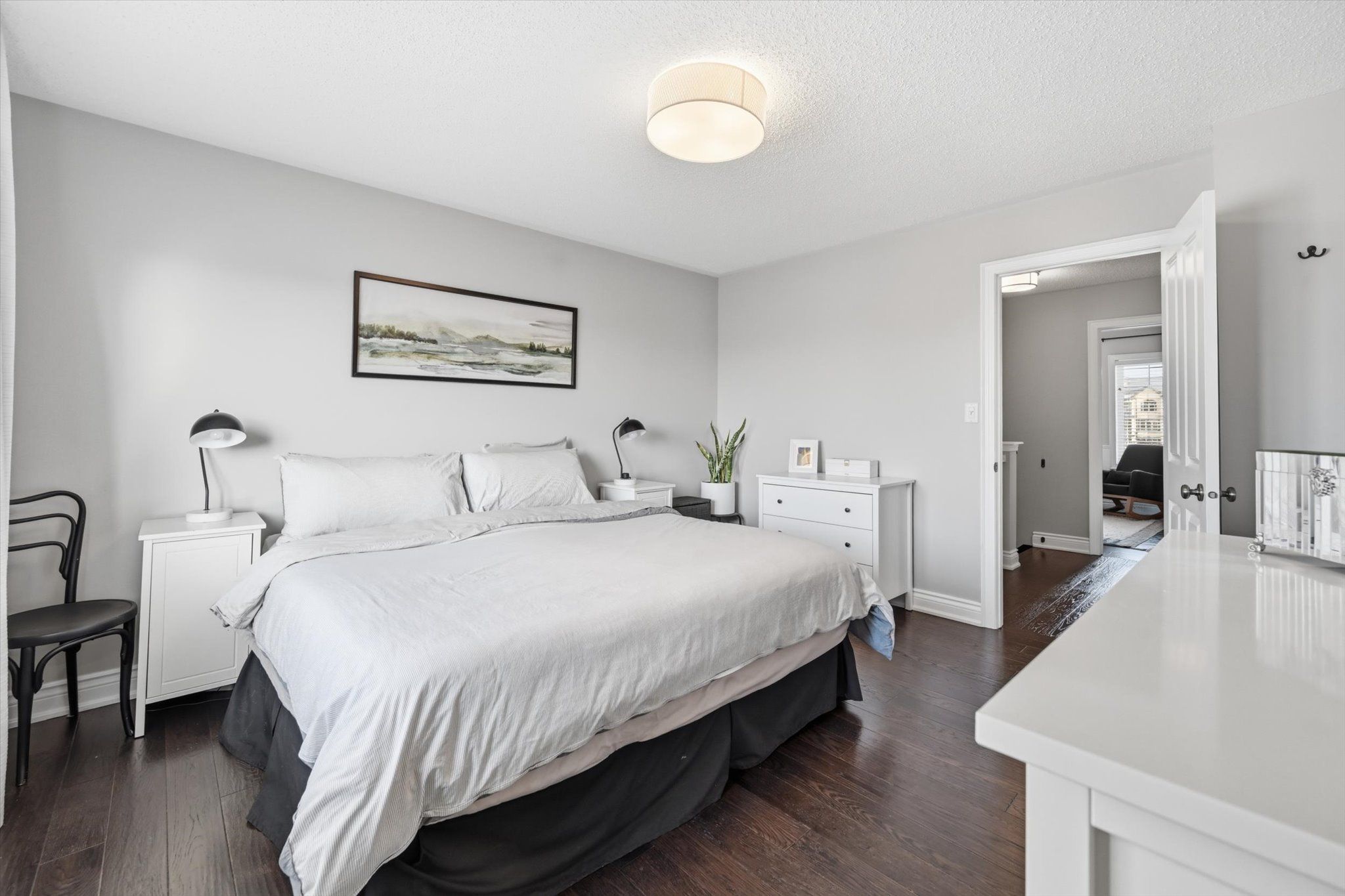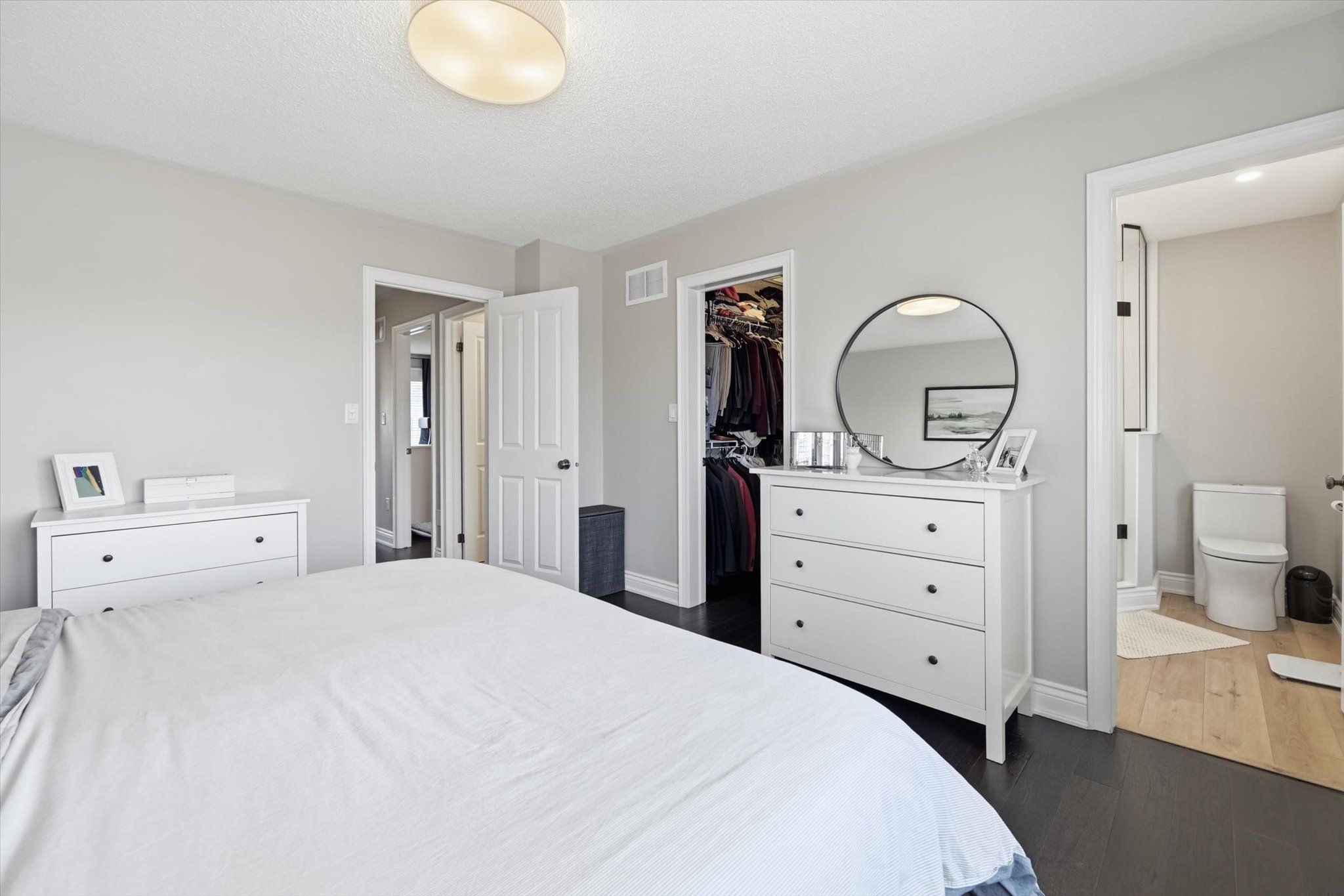 Finally! A completely renovated 3 bed, 3 bath townhouse in alton village! Which brings me to the top 7 reasons to buy #26: 1. The essential 2 full bathrooms on the bedroom level with extensive upgrades in all three bathrooms including new toilets, tiling, vanities, light fixtures, flooring, mirrors, and master ensuite shower glass enclosure with matching black accents. 2. Sought after alton village/burlington location with top schools featuring alton village elementary ranked 94th percentile in on, and dr. Frank j. Hayden secondary ranked 88th percentile in on. Short walk from the farm boy/starbucks/shoppers drug mark plaza, and only 10-15 min drive to the qew and appleby go train station. 3. Large and modern, open concept kitchen features refinished white cabinets, upgraded matte black hardware, upgraded backsplash, s/s appliances, upgraded matching black faucet, stone counters, and the coveted kitchen island with a trendy green accent color. 4. Landscaped low-maintenance backyard retreat features a deck covered in turf for proper drainage and maximum utility; a very expensive upgrade. 5. High-end finishes throughout include gorgeous engineered hardwood on the main and top floor with matching wood stairs and updated flooring across all 3 levels. Custom built-in library shelving, upgraded light fixtures incl pot lights, board and batten kitchen decor, heated floors on lower-level, eco bee smart thermostat, and a fresh coat of paint ('25). 6. Private community/laneway with private playground; includes ample visitor parking and unparalleled safety with no public access to the property. 7. Modern construction with concrete slab-on-grade (no basement leaks), copper electrical, modern plumbing, 2017 roof, and vinyl (never-rot) windows. Nothing to do but move in and enjoy! But don't hesitate, book your showing today, as when it sells there likely won't be another one like it as these models are rare!