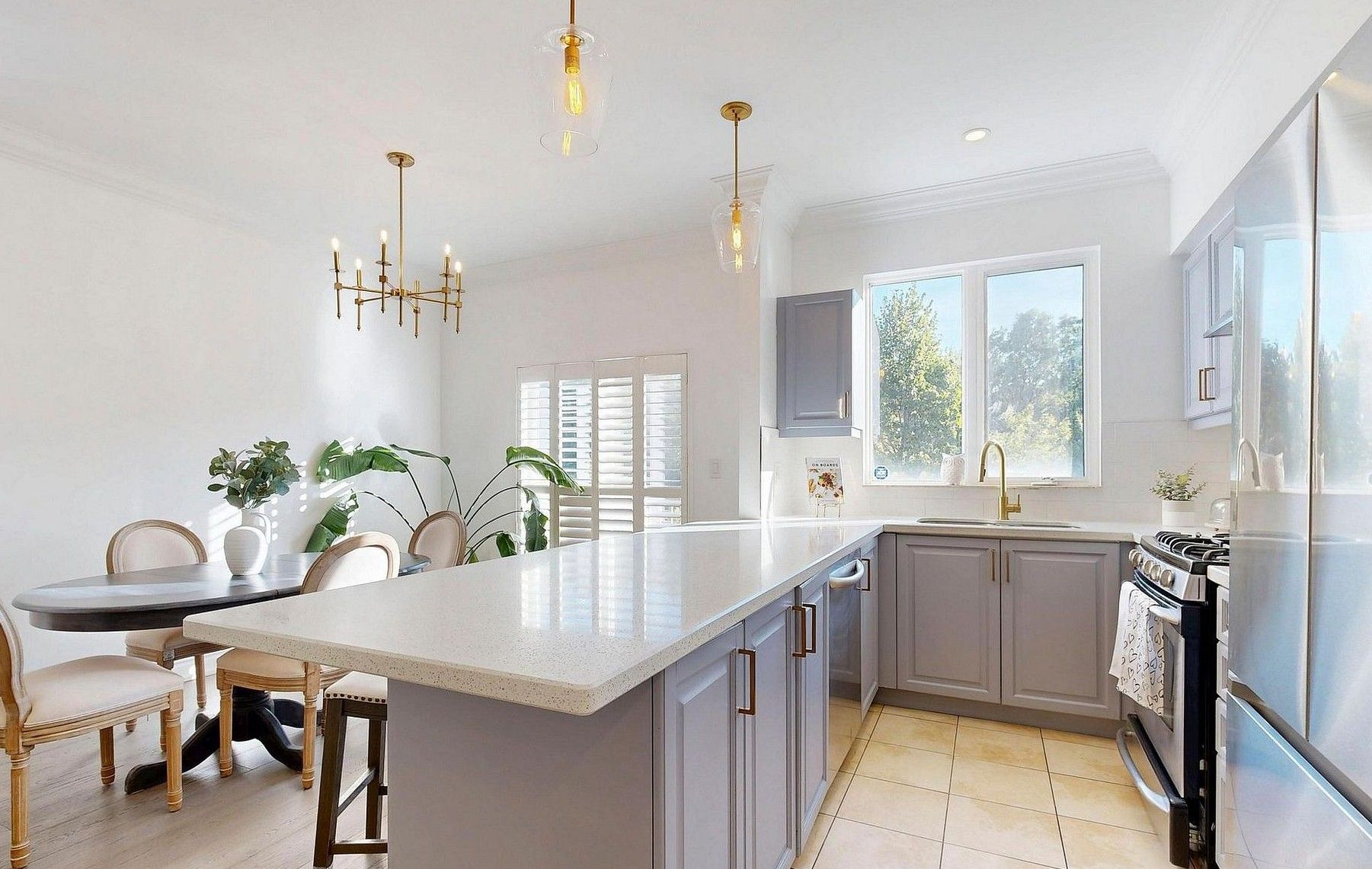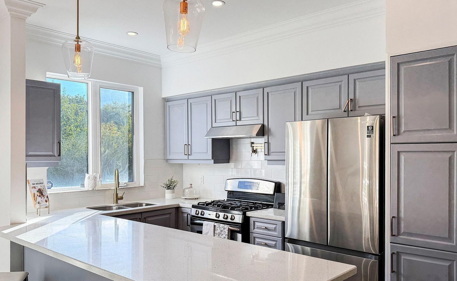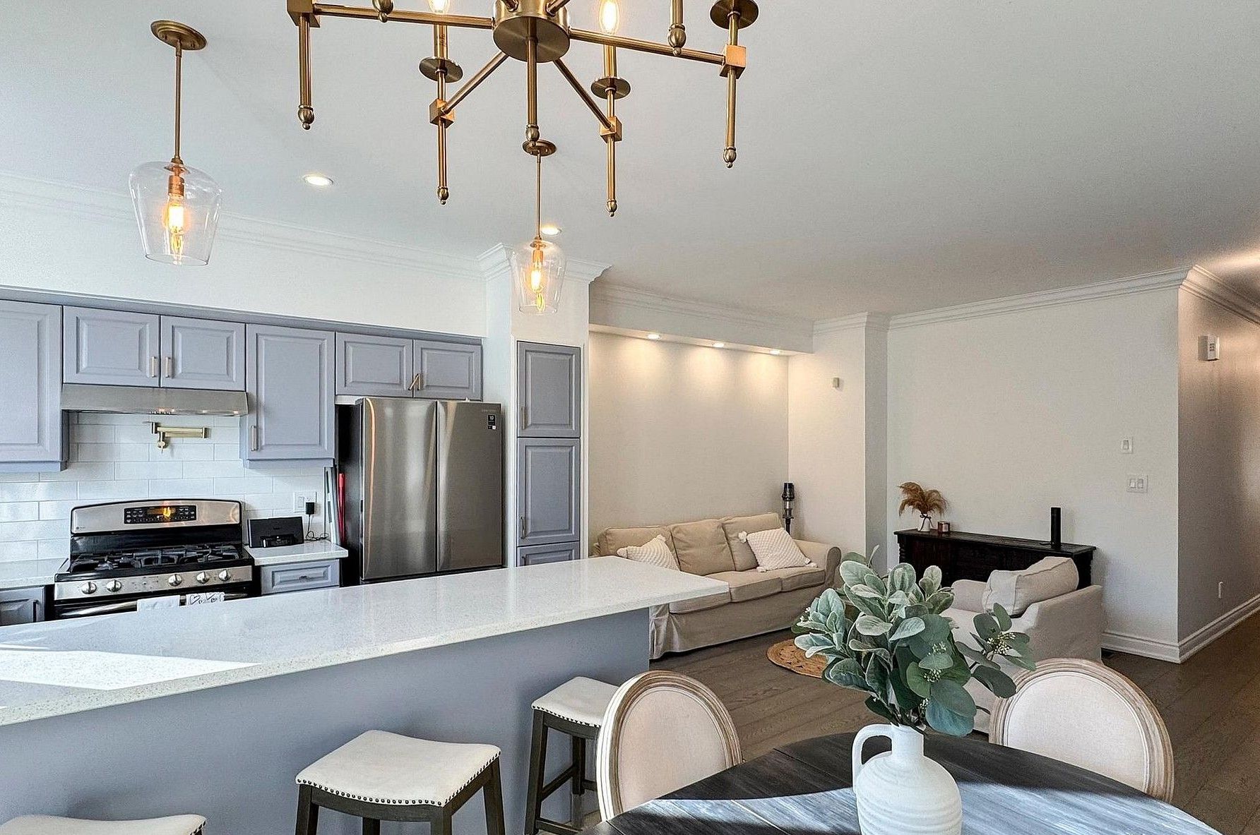 • Modern kitchen with stainless steel appliances and ample storage space.