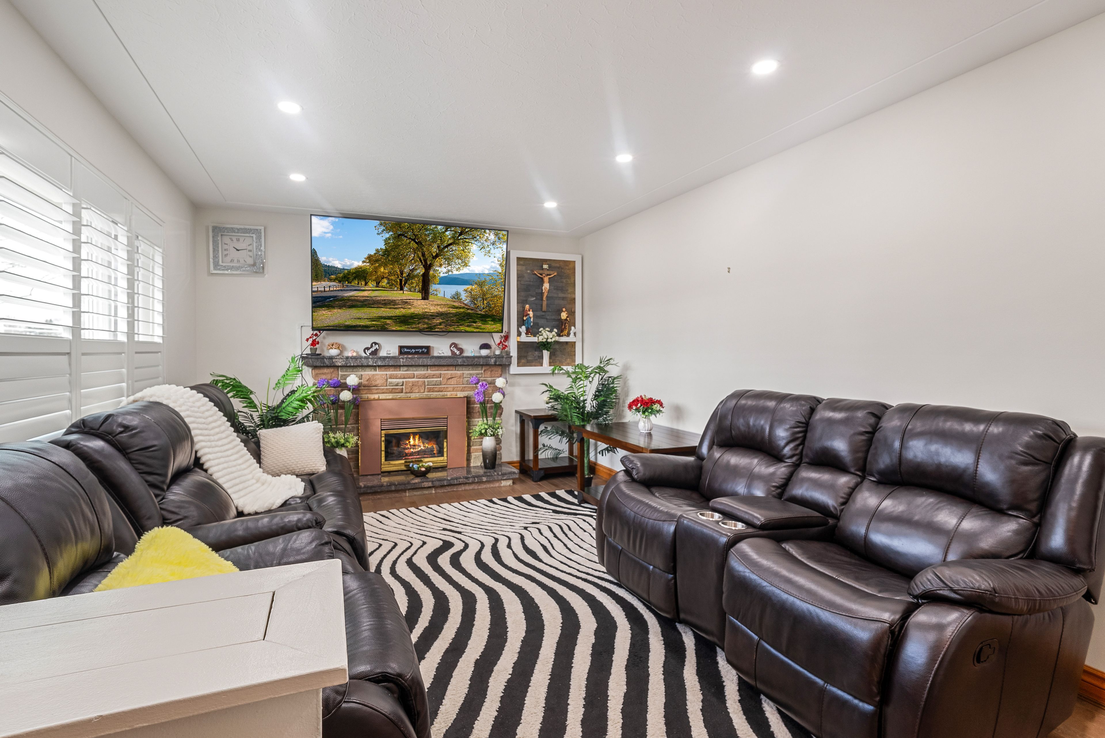 • Bright living room with large windows and cozy gas fireplace.