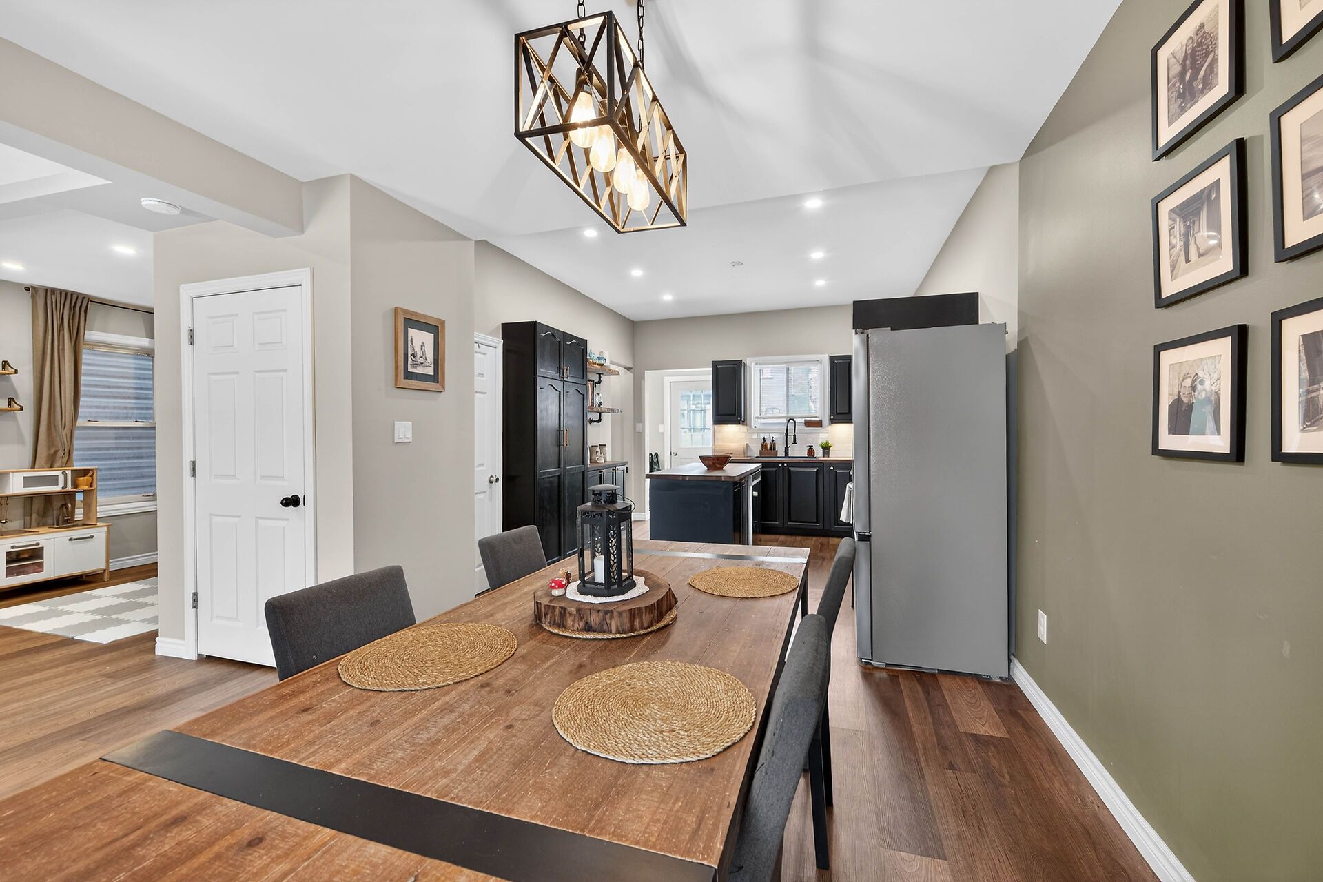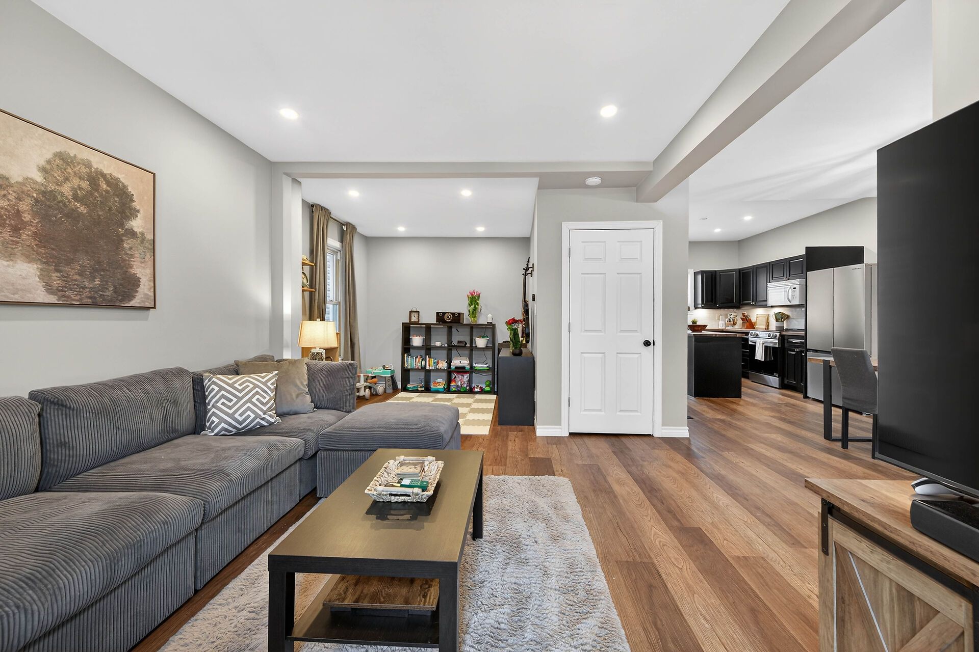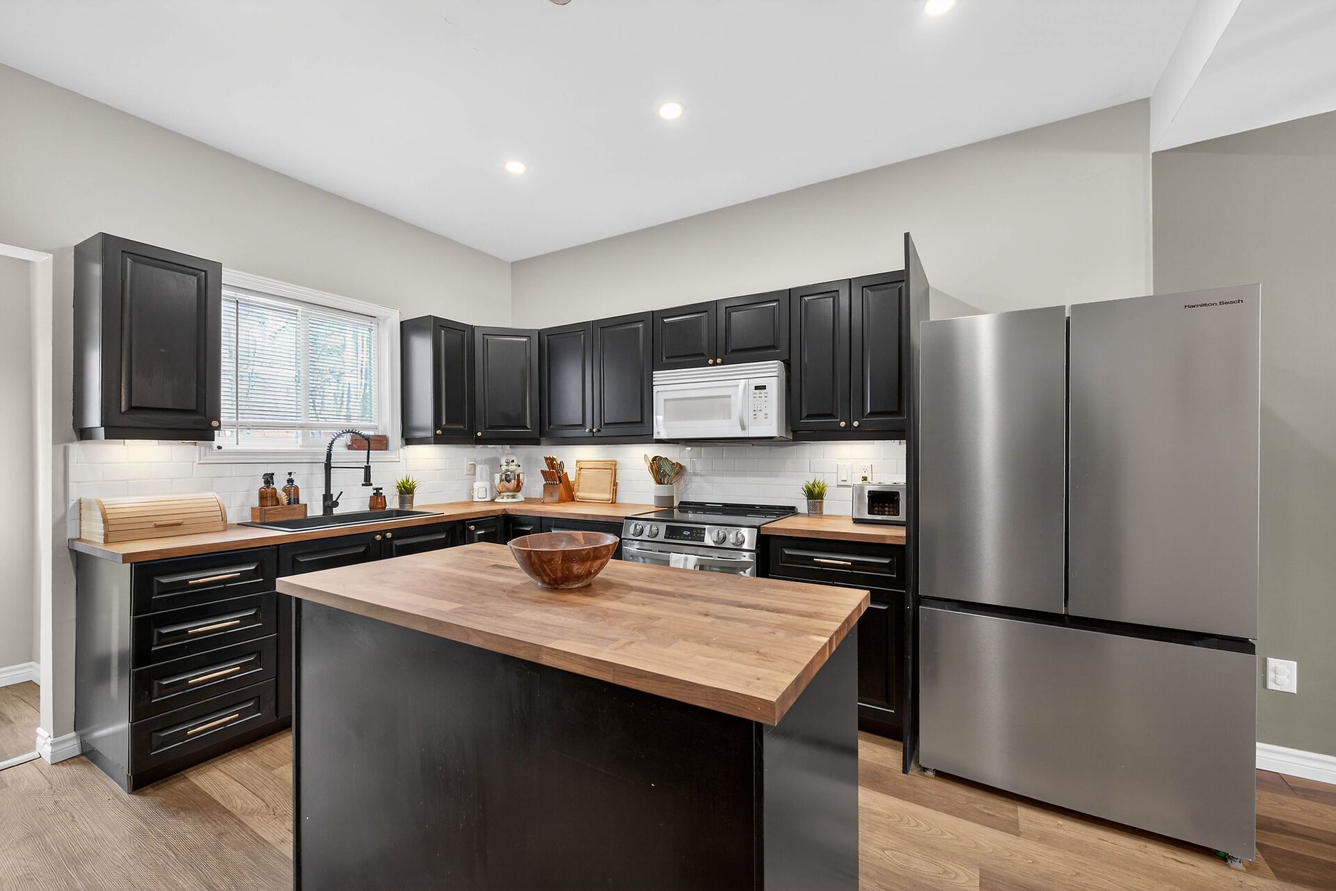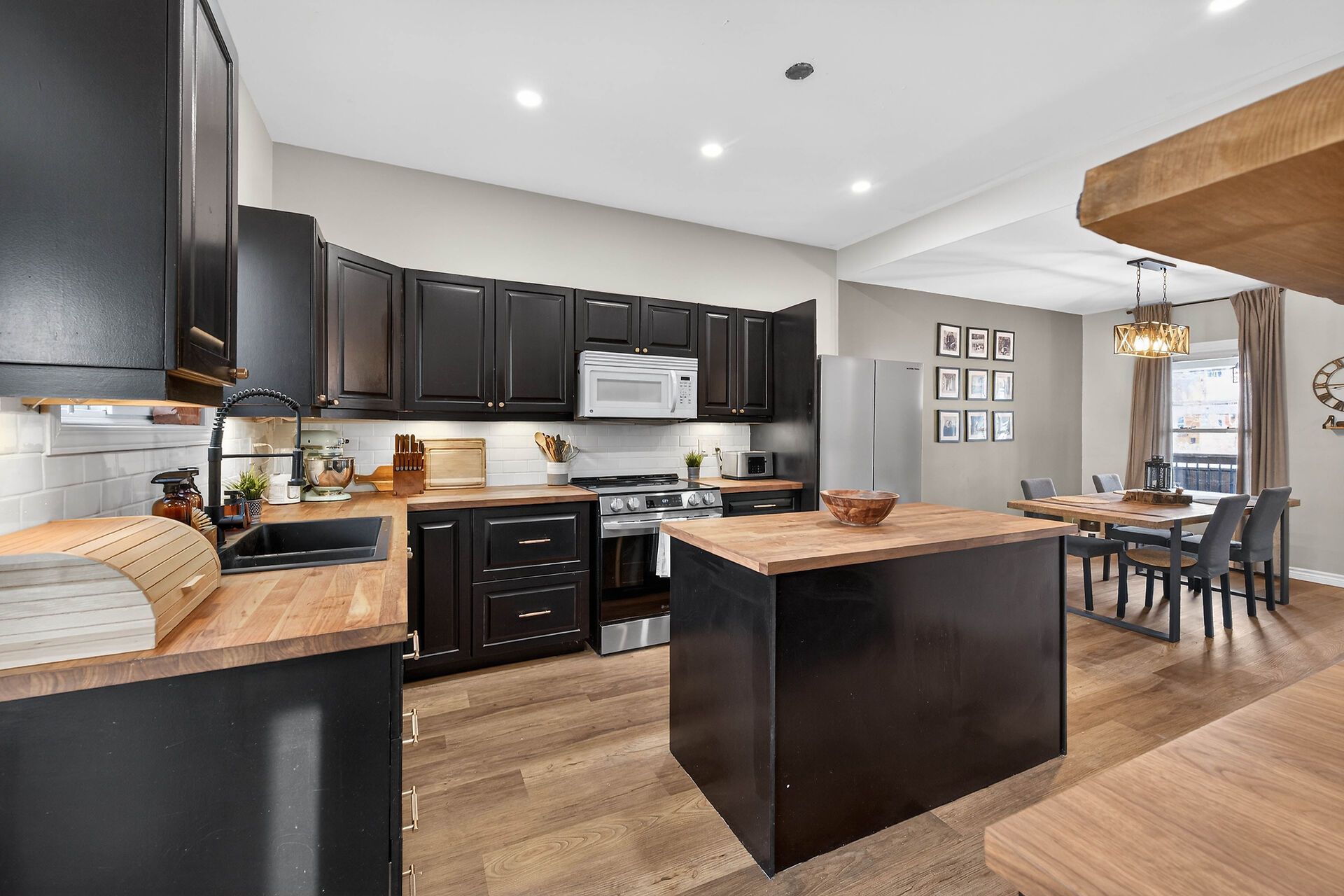 • Updated kitchen features a large island and modern appliances.