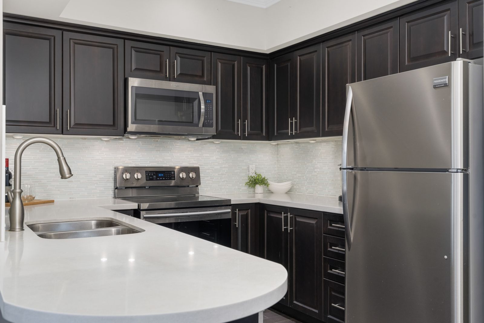 • Open-concept layout with stainless steel appliances and quartz countertops.