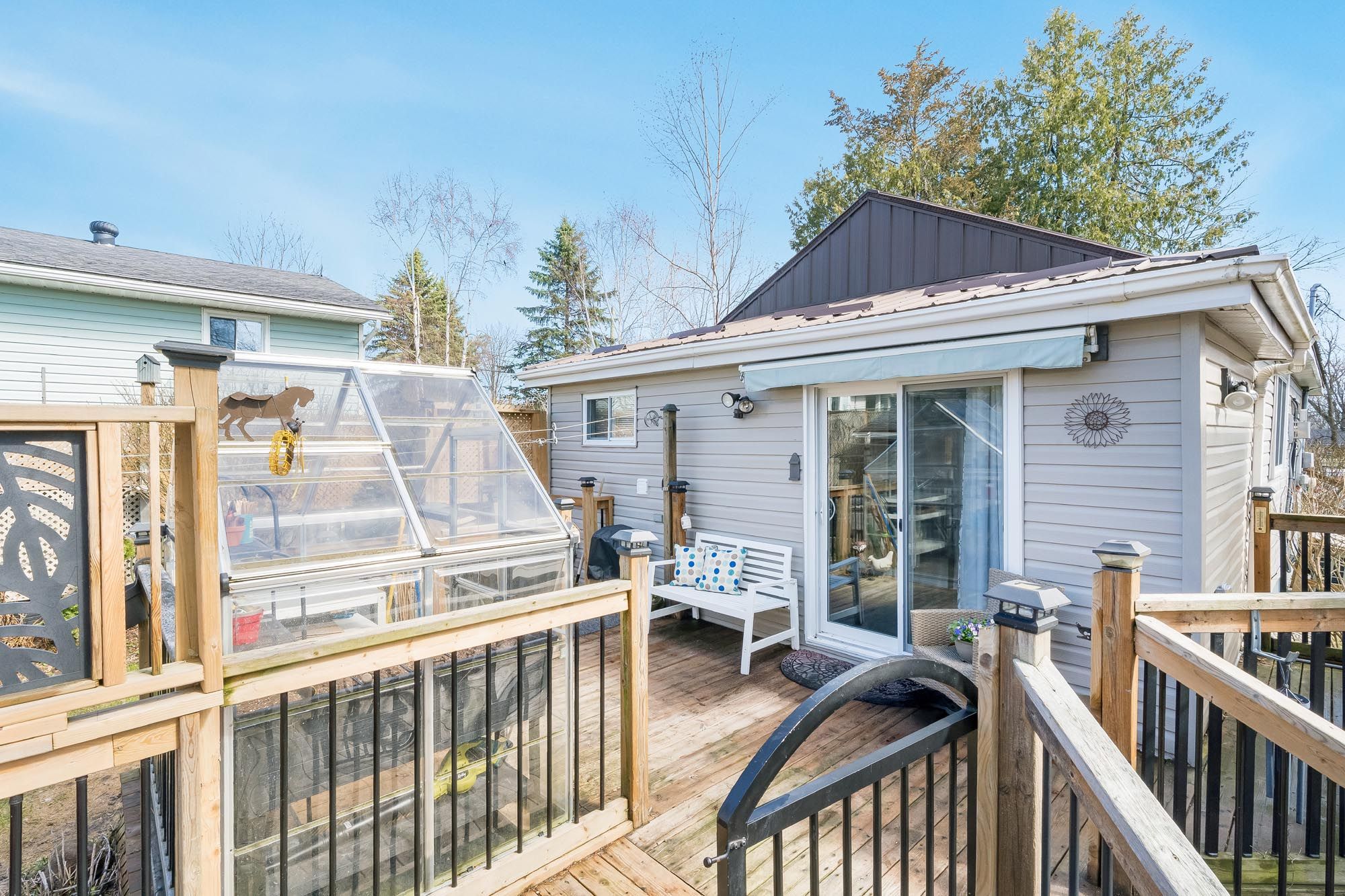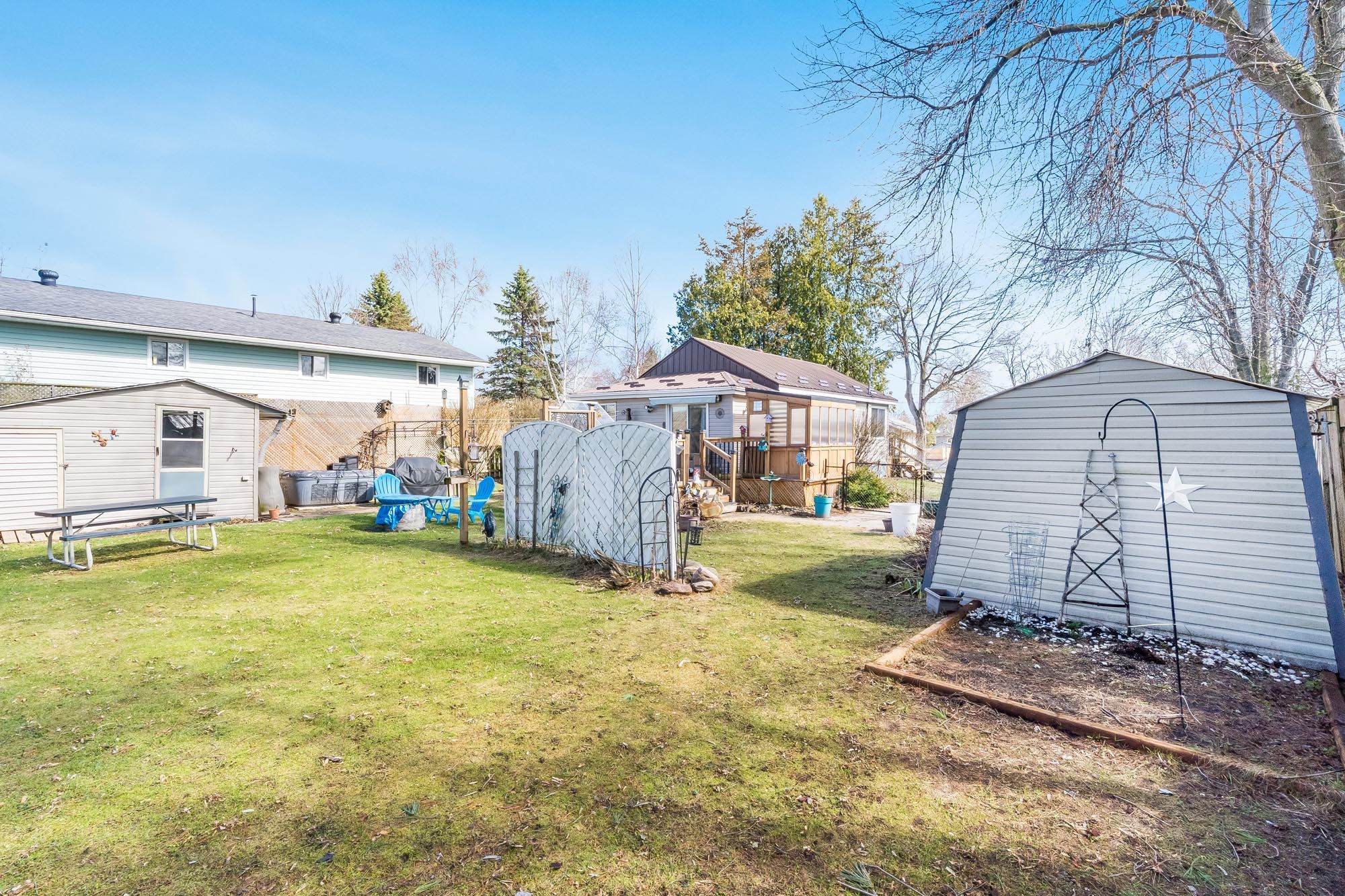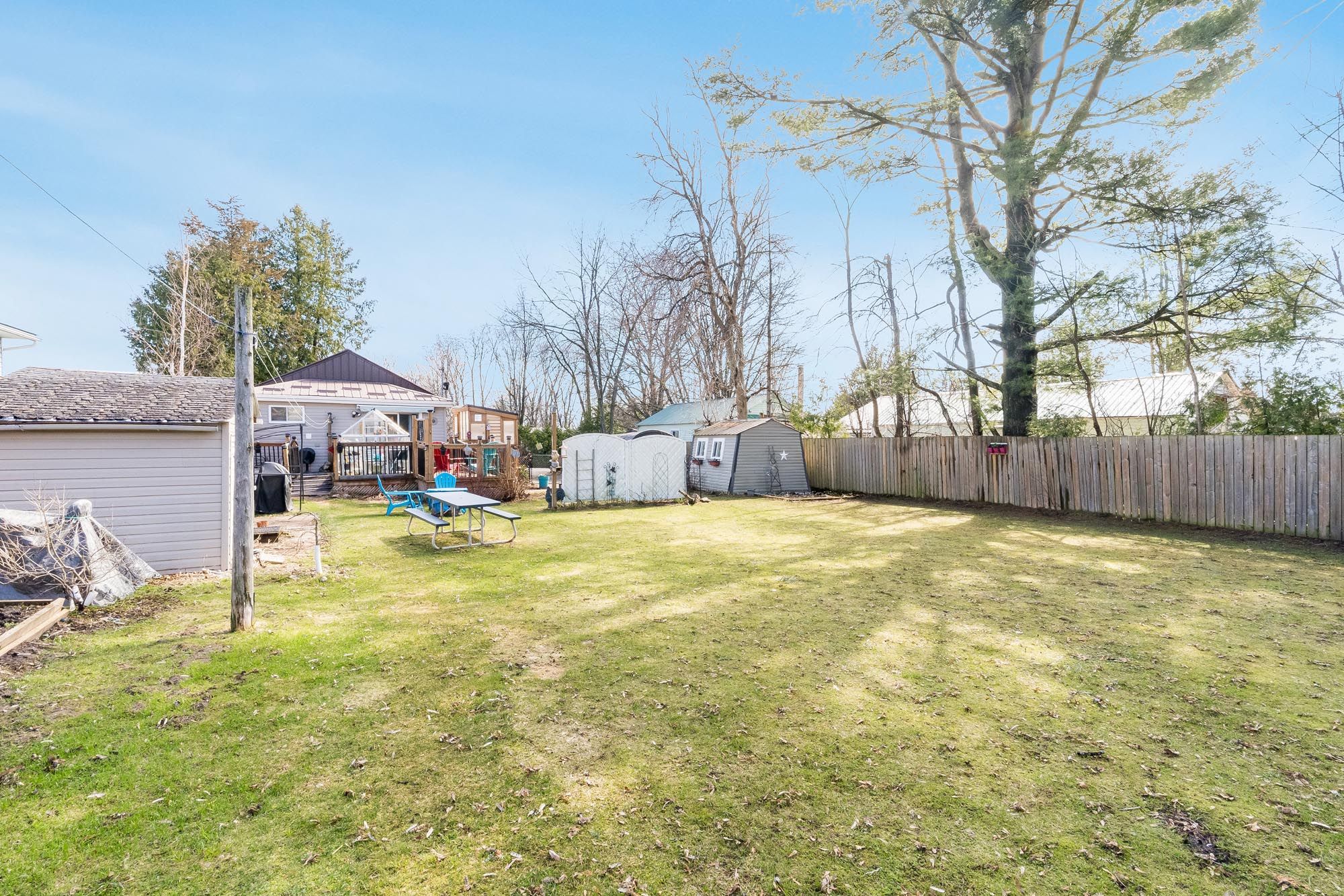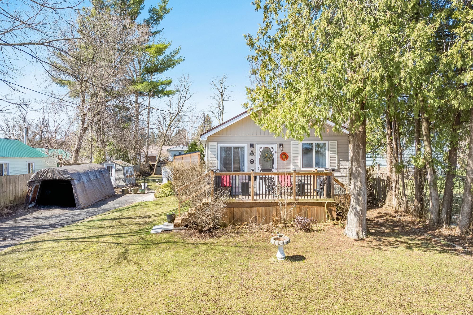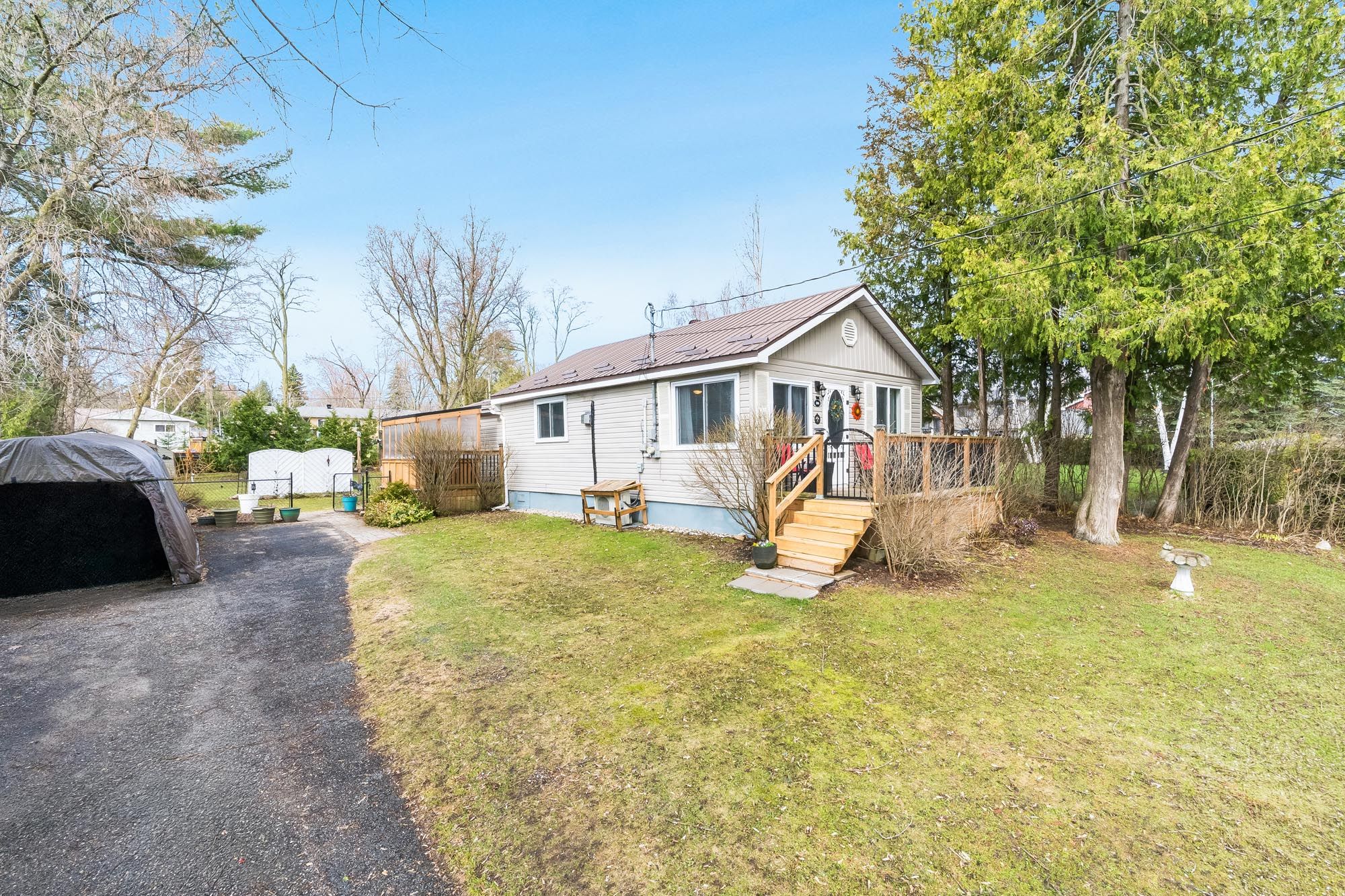Top 5 reasons you will love this home: 1) set in a peaceful, low-traffic location, this property is defined by its lush quarter-acre lot, where mature greenery and outdoor space create a private, park-like setting ideal for relaxation and refined outdoor living 2) enjoy the ease of single-level living in this charming, beautifully maintained home, full of warmth and character, complemented by the comfort of air conditioning, exceptionally low property taxes, and the convenience of municipal water for effortless everyday living 3) ideally located with convenient access to highway 400, this property is just moments from the shores of georgian bay, with local essentials including the lcbo available right in town, with midland only 20 minutes away and barrie just 30 minutes 4) the property is exceptionally well-equipped with an electrified bunkie, a small workshop, dedicated office space, and a greenhouse, complemented by multiple decks and an abundance of outbuildings for versatile storage, all set within a fully fenced yard that's ideal for dogs and kids to play 5) extensively upgraded throughout, this home showcases nearly $30,000 in thoughtful improvements, including a water heater, fridge, microwave, second fridge, kitchen stove, gas fireplace, sliding doors, and a stacked washer and dryer, all reflecting exceptional care, added functionality, and true pride of ownership. 825 fin. Sq. Ft.