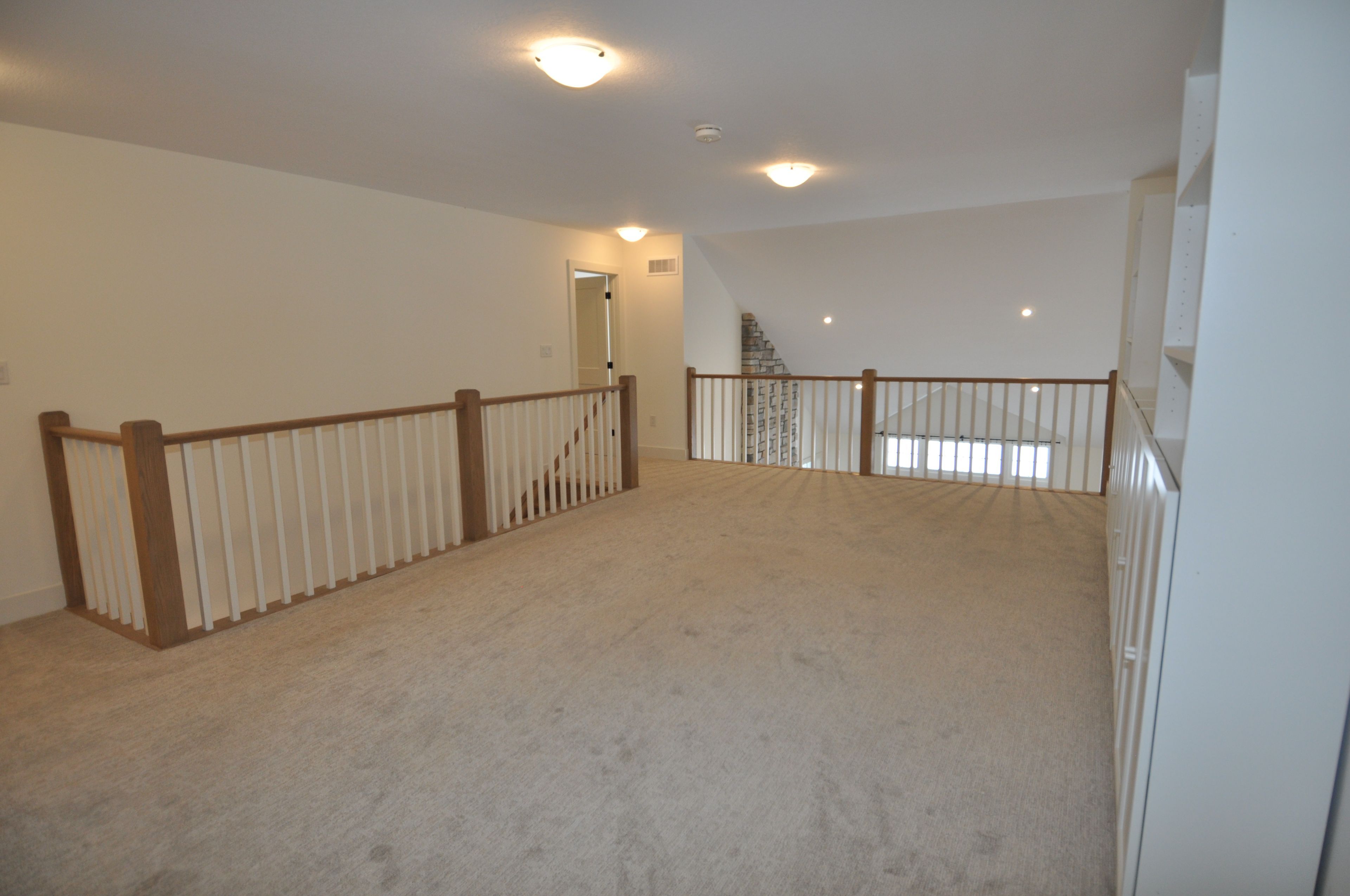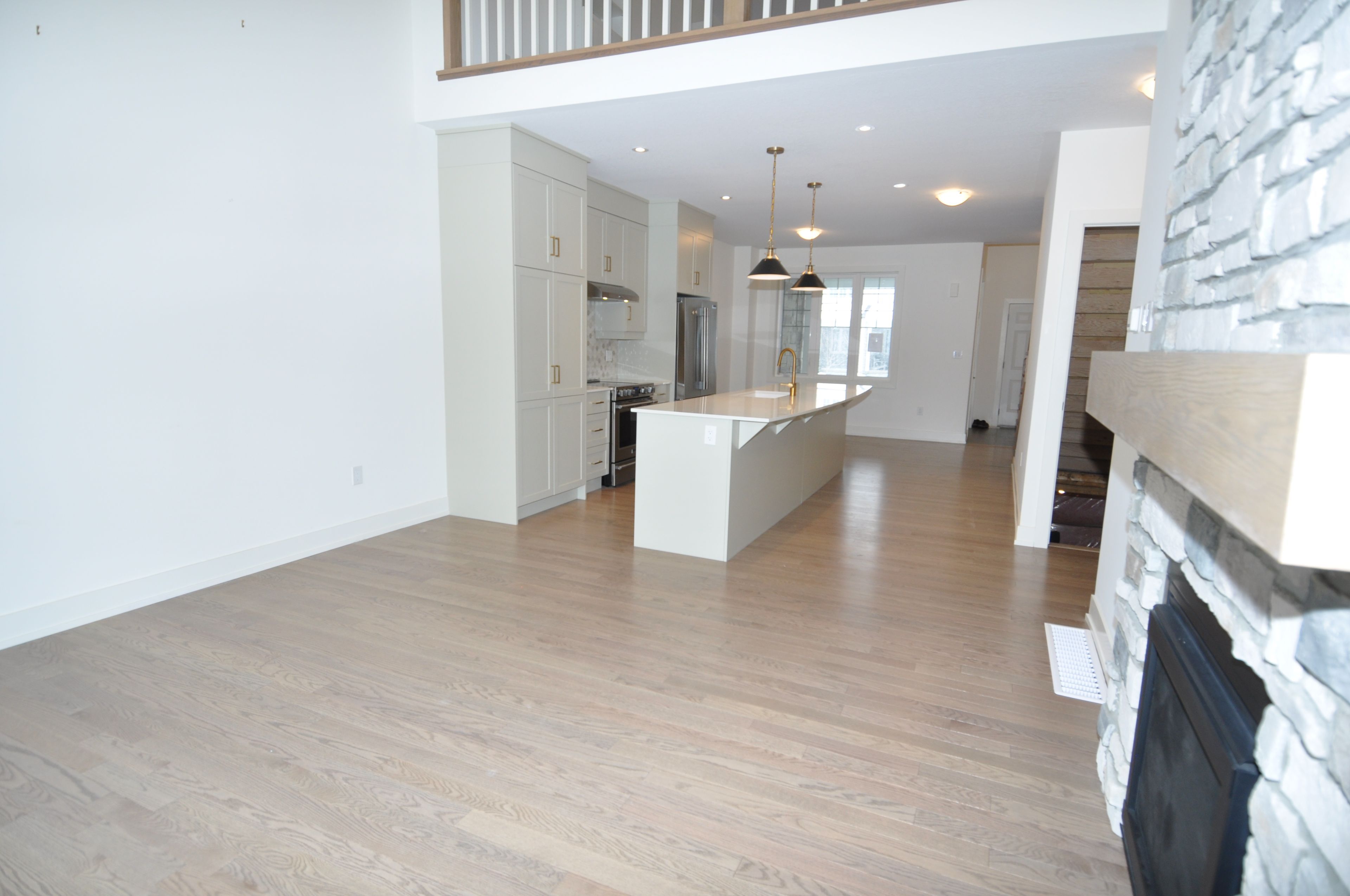 • Open-concept layout with engineered hardwood and a dramatic stone gas fireplace.