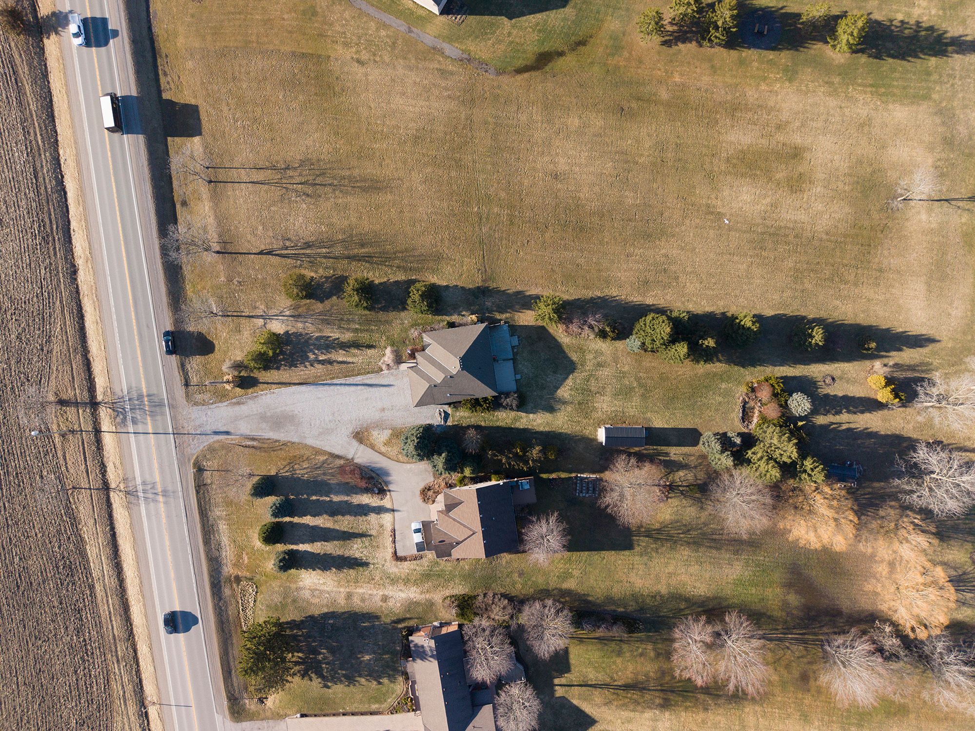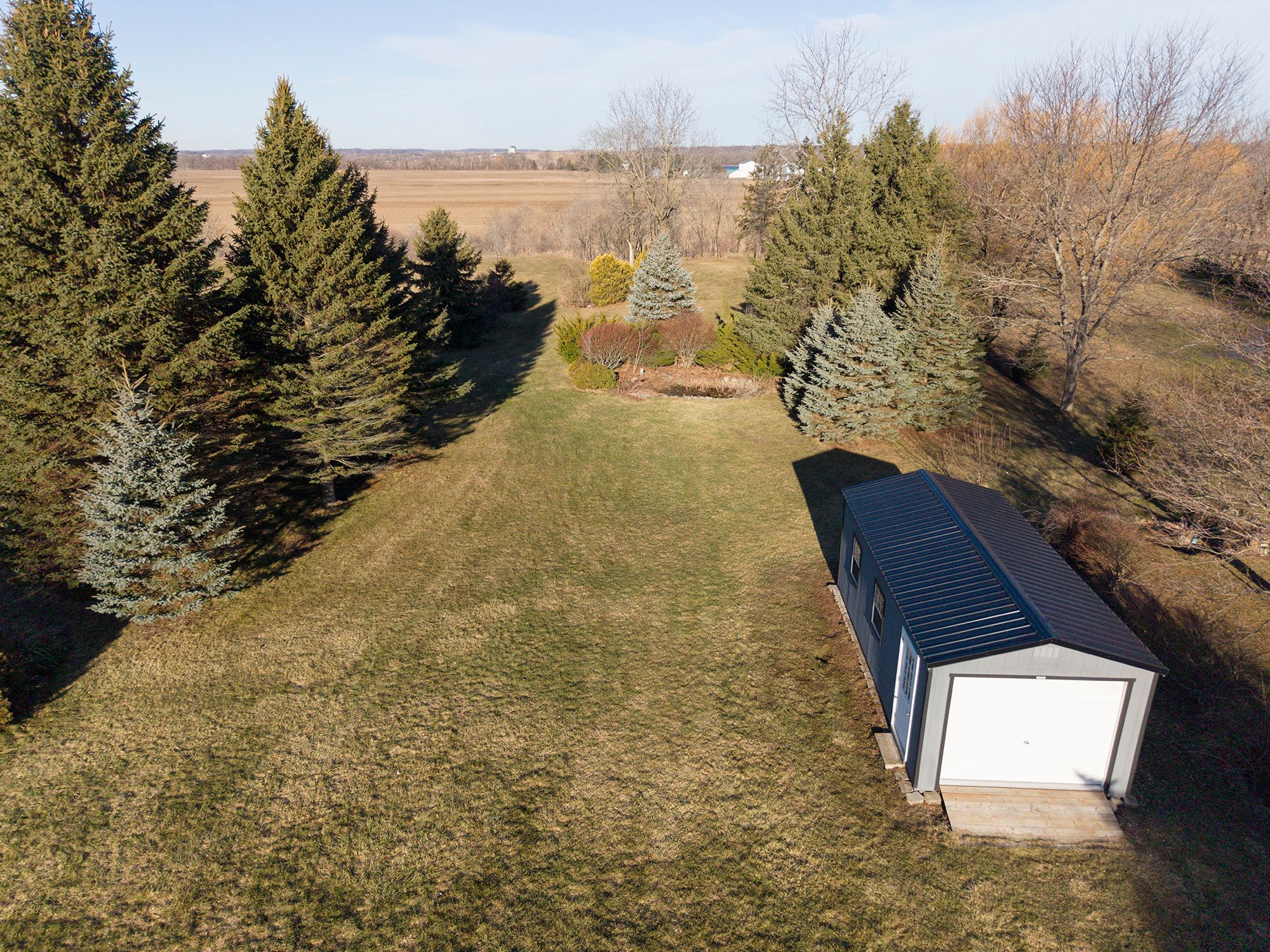 • Large lot with mature trees, landscaped grounds, and multiple outbuildings.