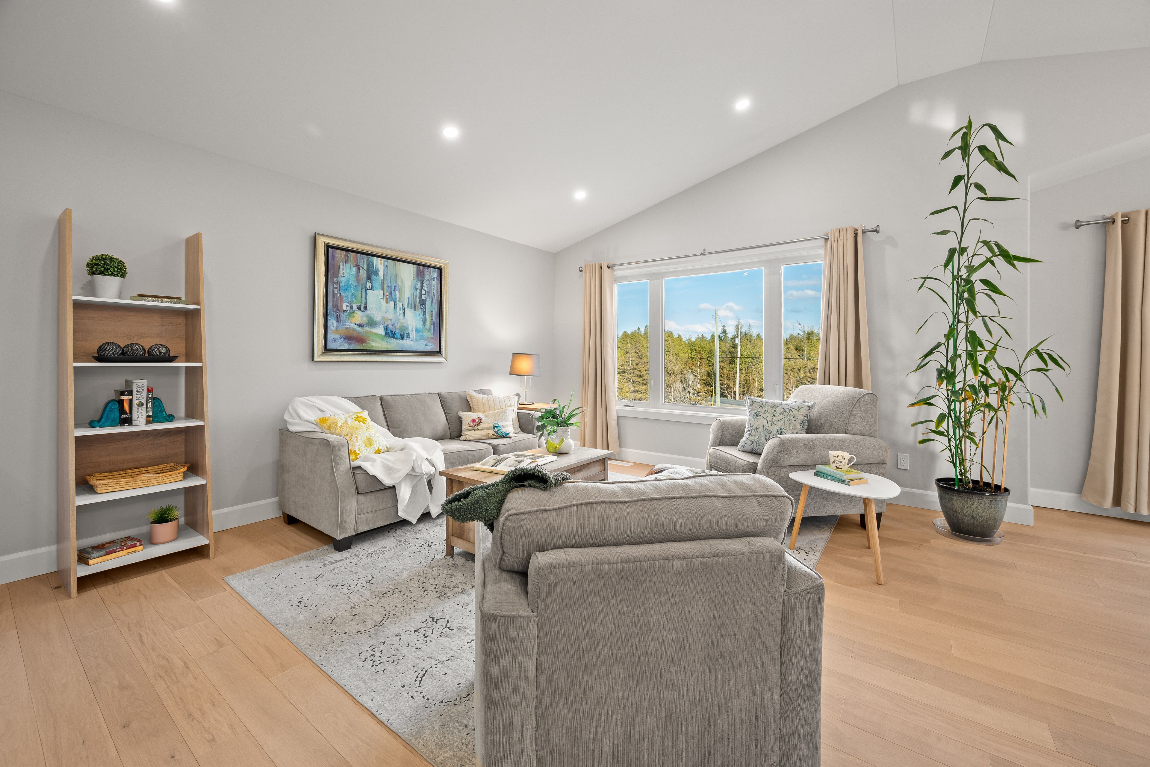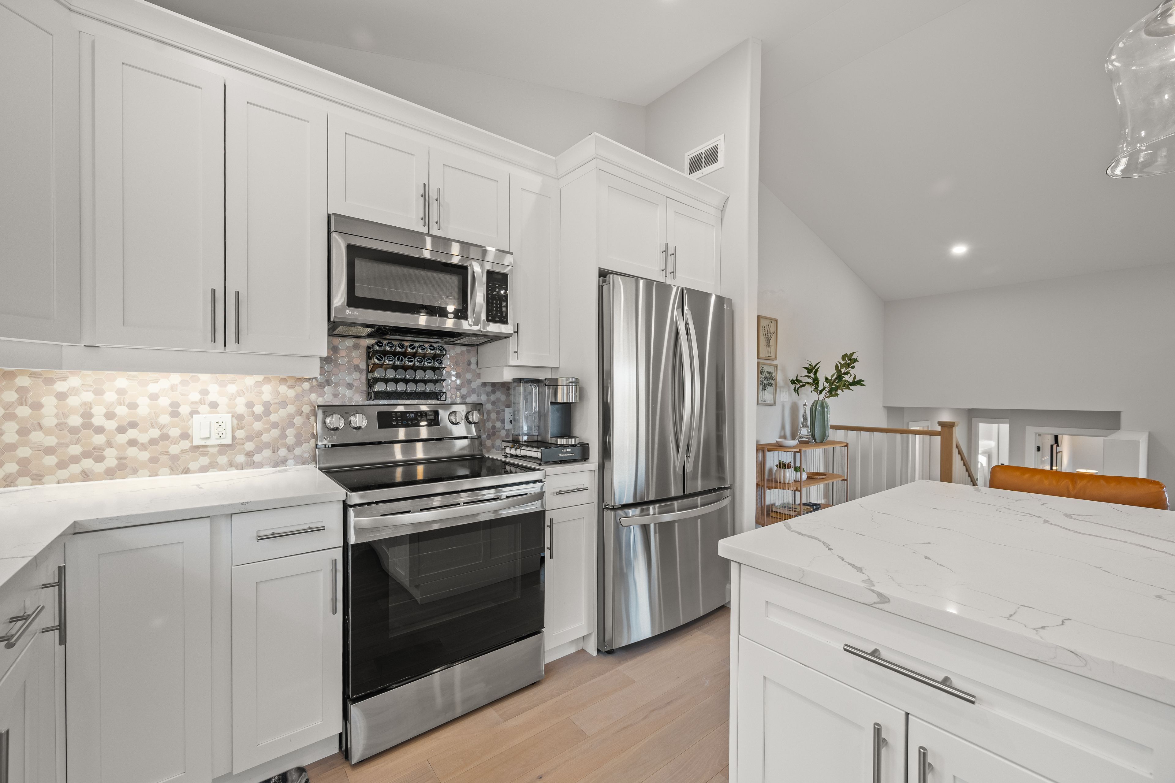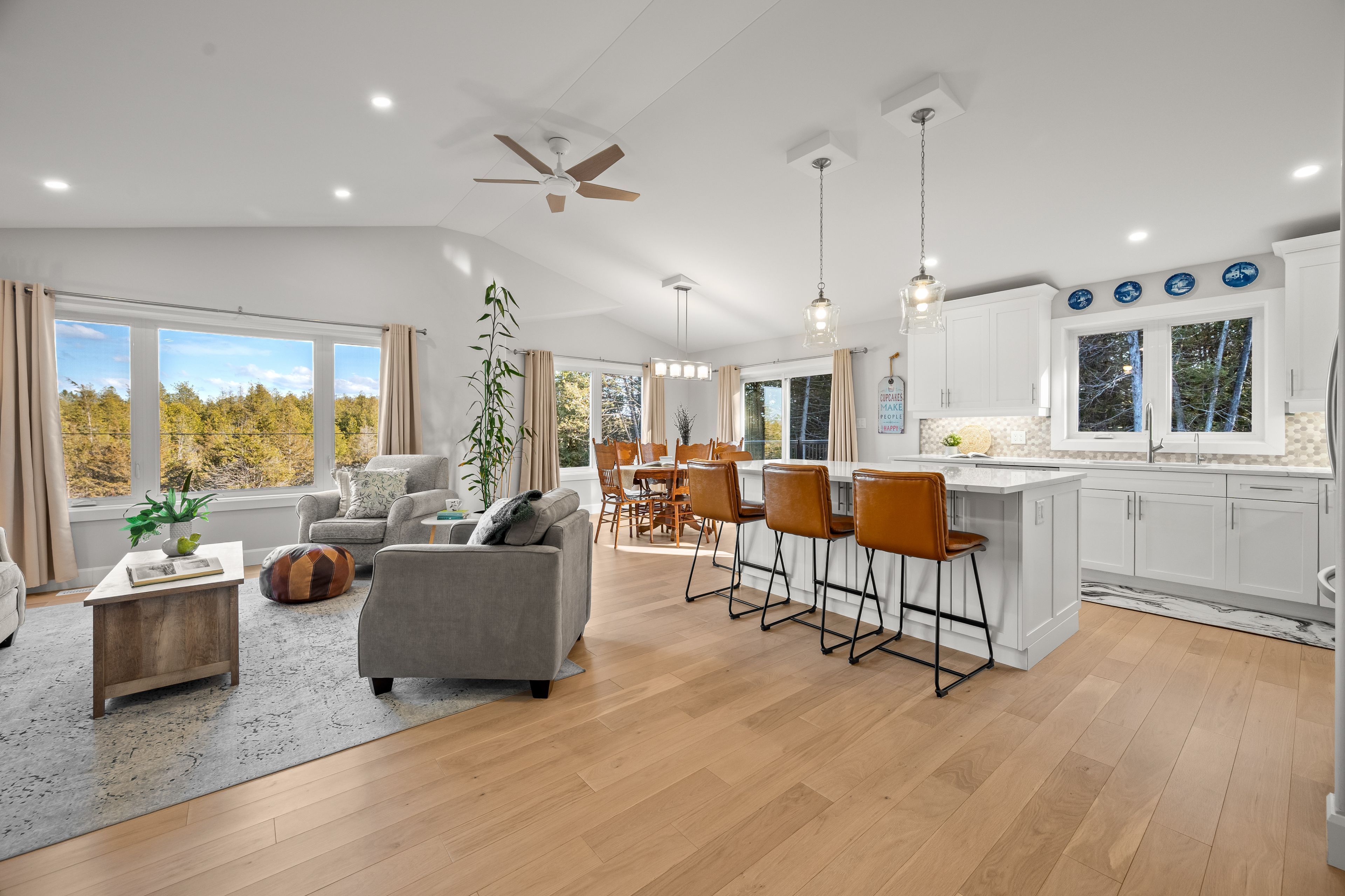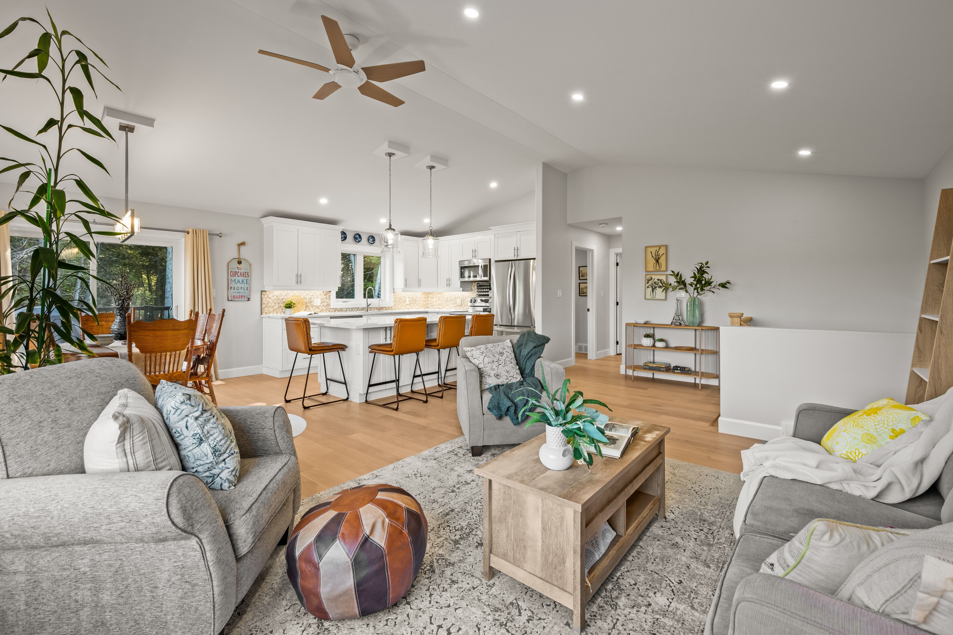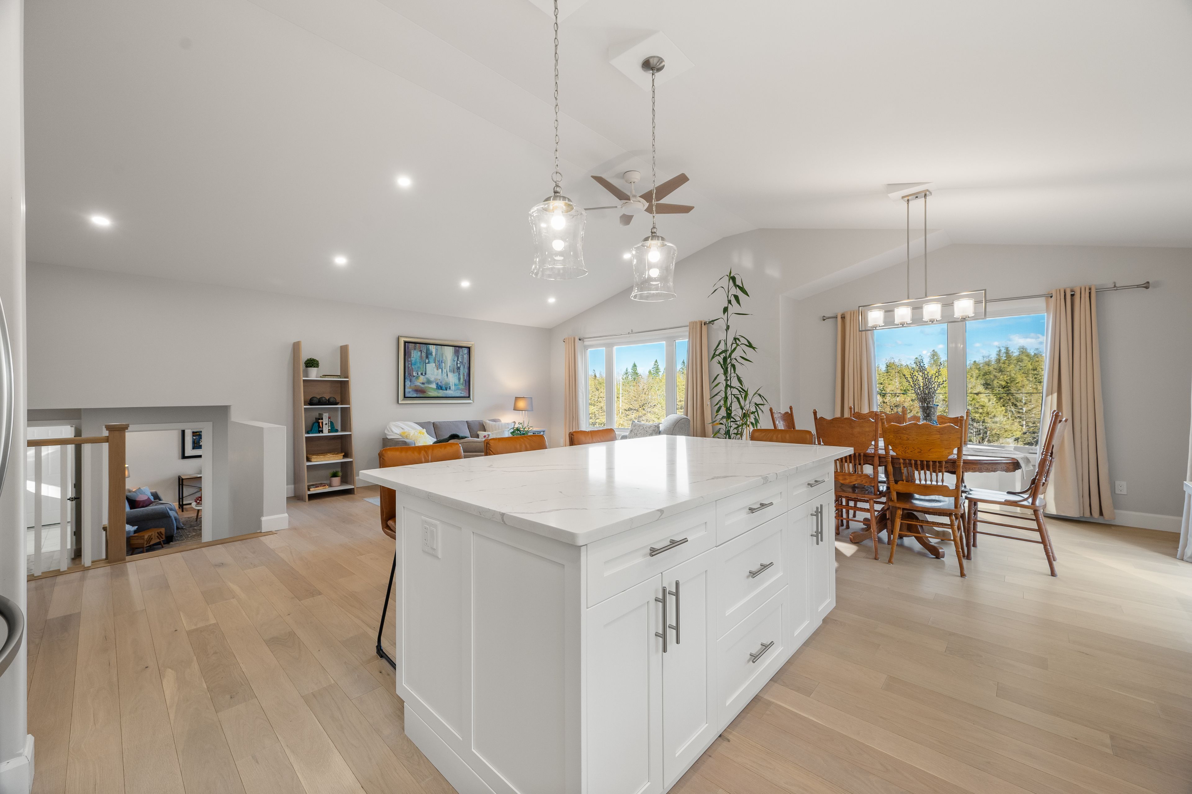 • Bright, open-concept upper level with vaulted ceilings and large windows.