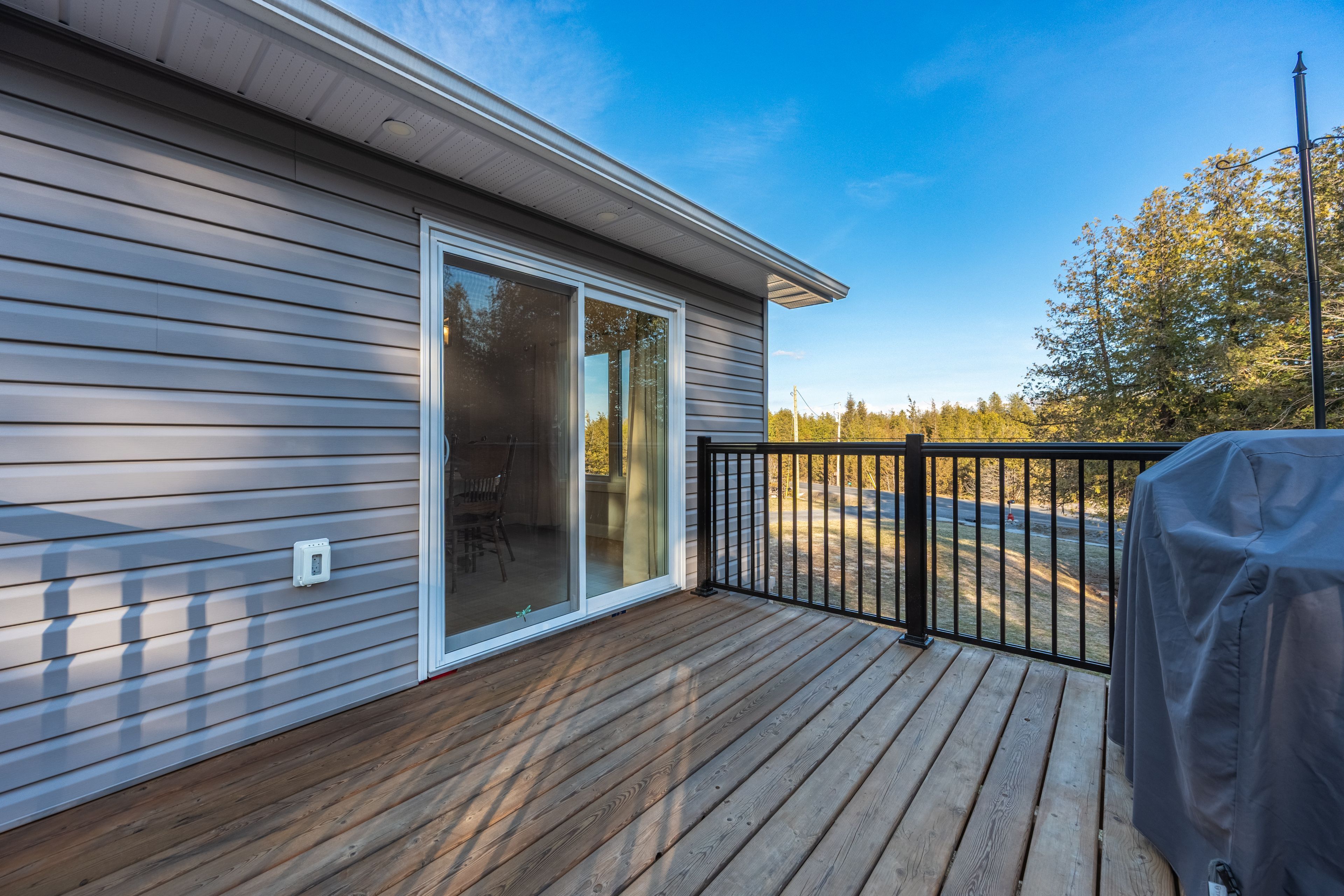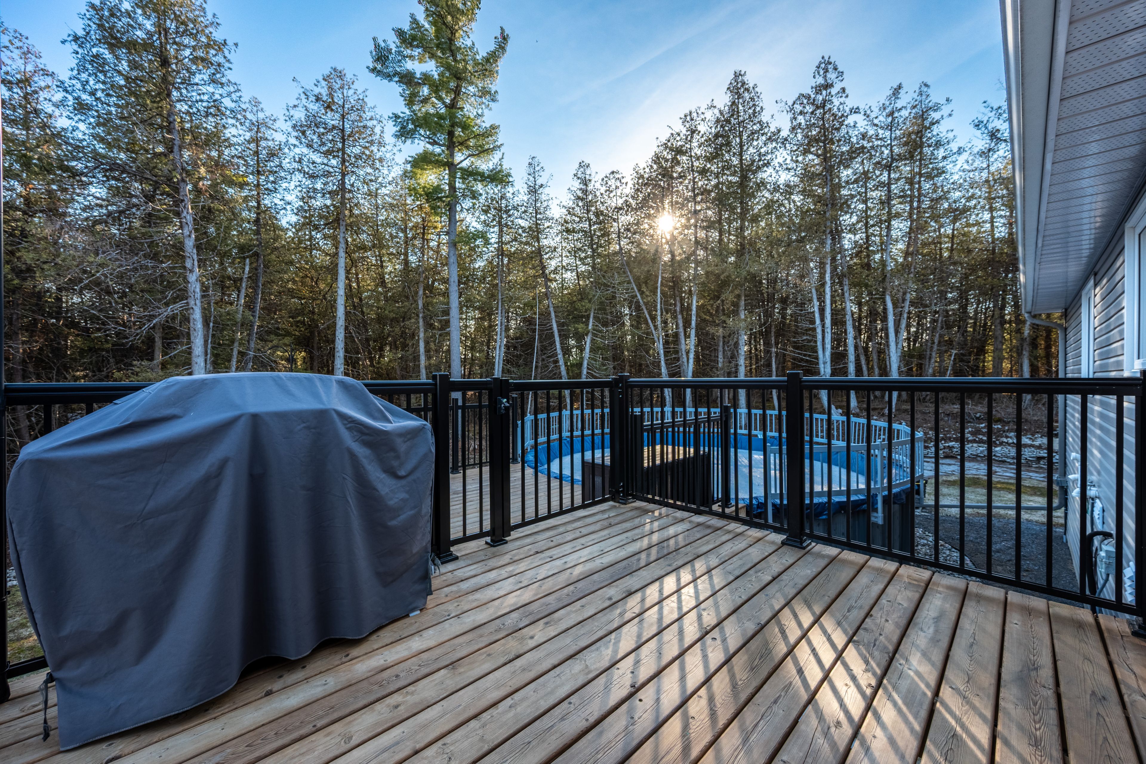 • Elevated deck overlooking backyard with pool and fire pit area.