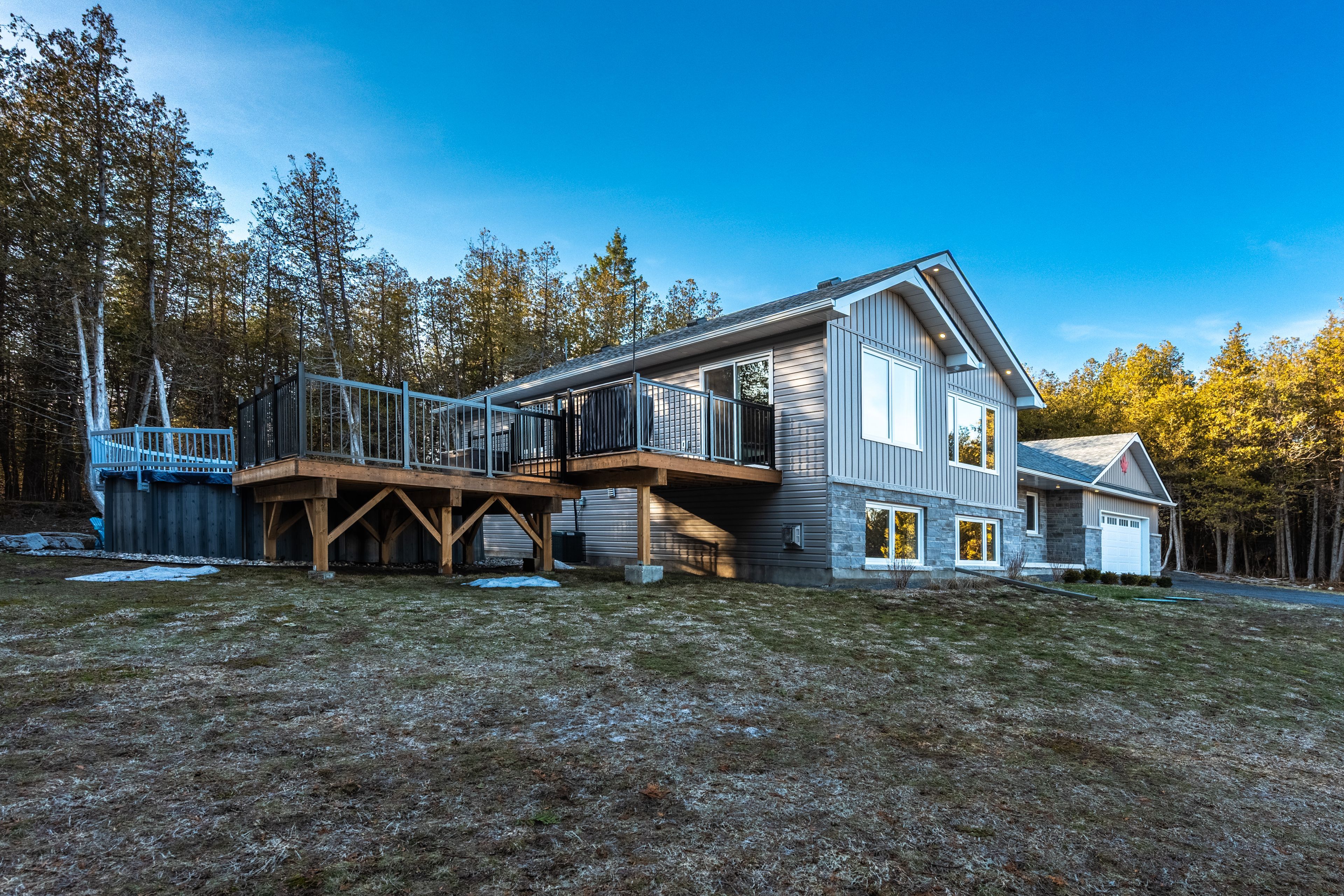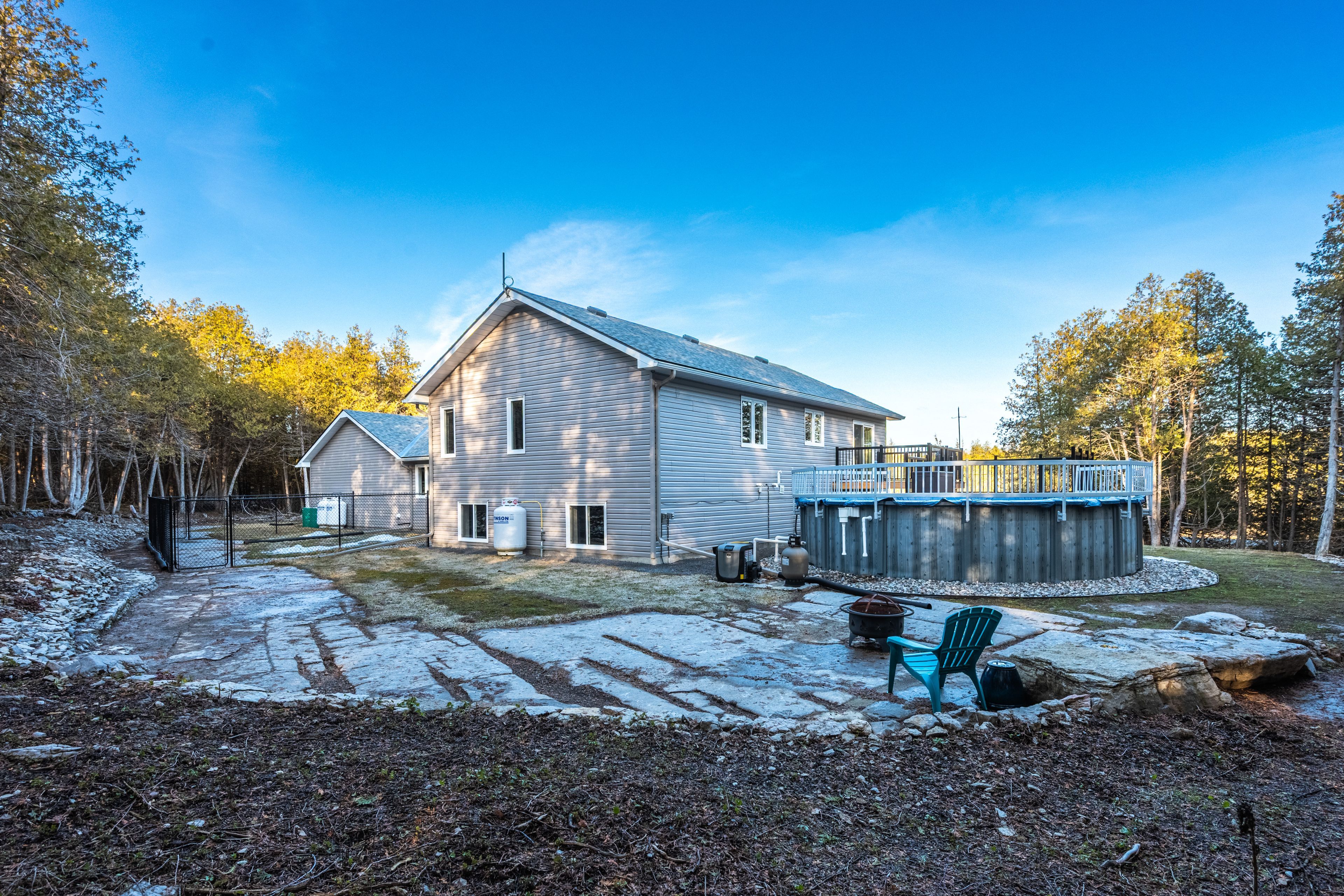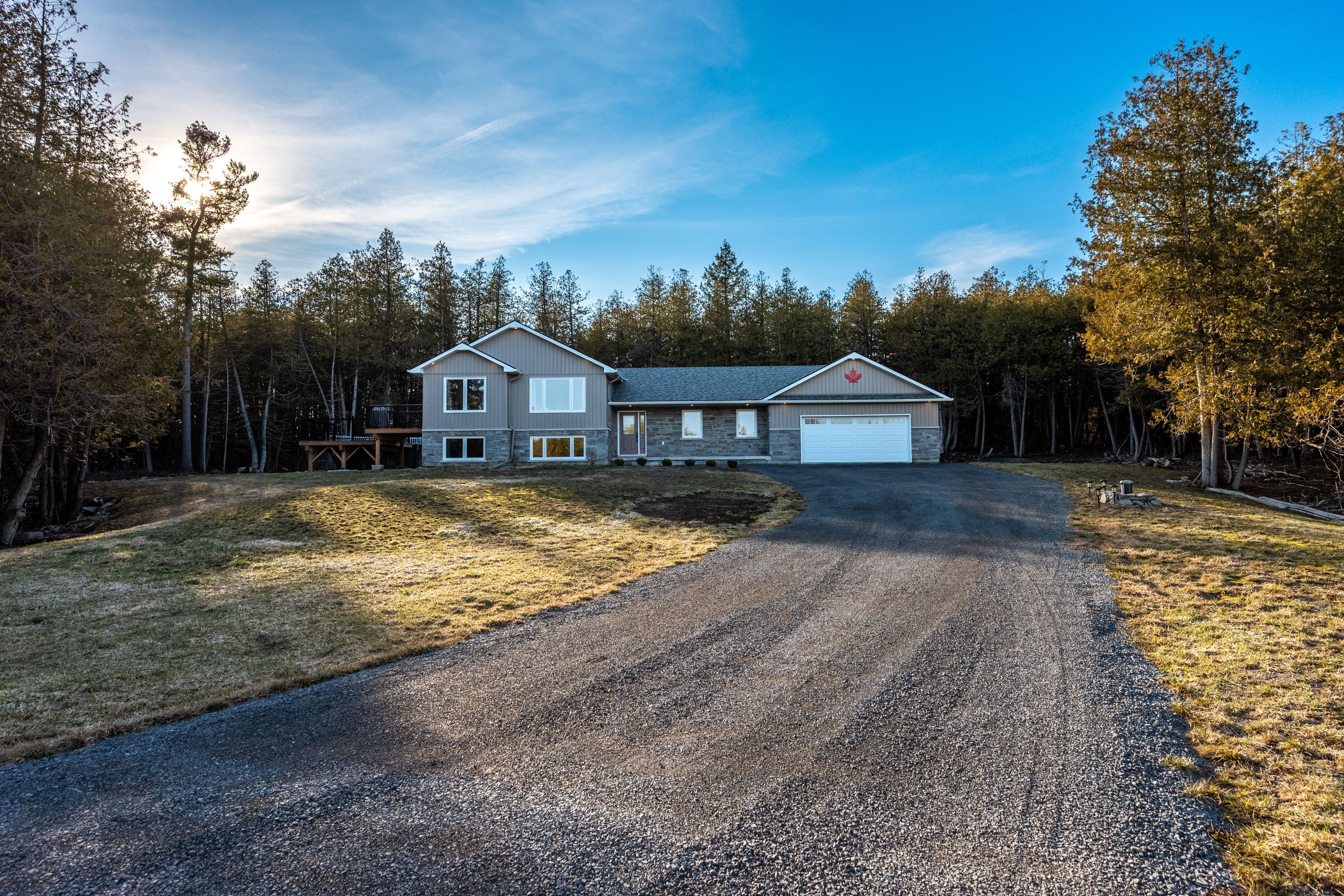 Set on a private, tree-lined lot, this well-executed newer side-split delivers a strong combination of functional design & usable space across every level. From the moment you arrive, the scale is evident with a wide driveway, oversized double car garage, & a setting framed by mature trees that carries throughout the property. Inside, the upper level is defined by its vaulted ceilings & open-concept layout, creating a bright, expansive feel across the living & dining areas. Large windows draw in natural light, while direct access to the elevated deck extends the living space outdoors. The kitchen is anchored by a substantial center island with seating, ample quartz counter space, & full-height cabinetry, positioned to overlook the main living area. The primary suite is both spacious & well-appointed, featuring a walk-in closet & a 3pc cheater ensuite. A second bedroom completes the upper level. The main level is thoughtfully laid out with a dedicated office, a full laundry room, & a 4pc bath, along with interior access to the double car garage creating a functional separation of space within the home. The basement extends the home with a substantial amount of additional living space, highlighted by a large rec room with a propane fireplace, along with two bedrooms, & multiple storage & utility areas. The scale of this level allows for a wide range of uses, from family living to guest accommodation. Outdoors, the property continues to deliver. The elevated deck overlooks a private backyard complete with an above-ground pool, a defined fire pit area, & open green space fully usable & framed by mature trees. A property that stands on its own defined by its scale, its setting, & a layout that delivers from the moment you walk in.