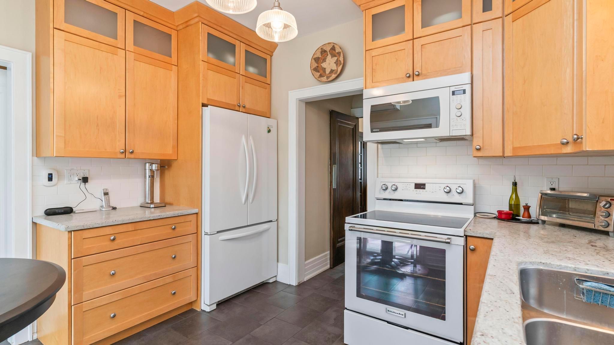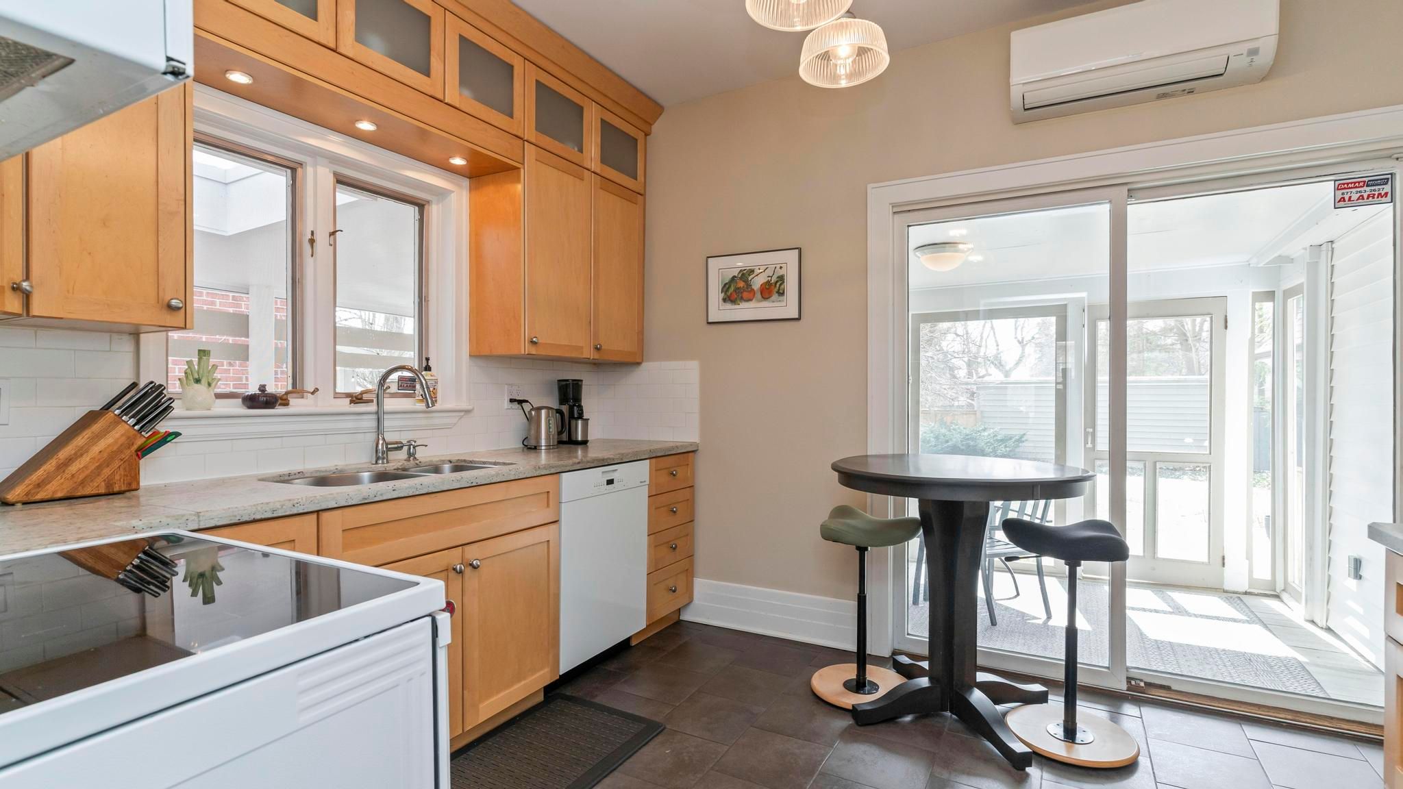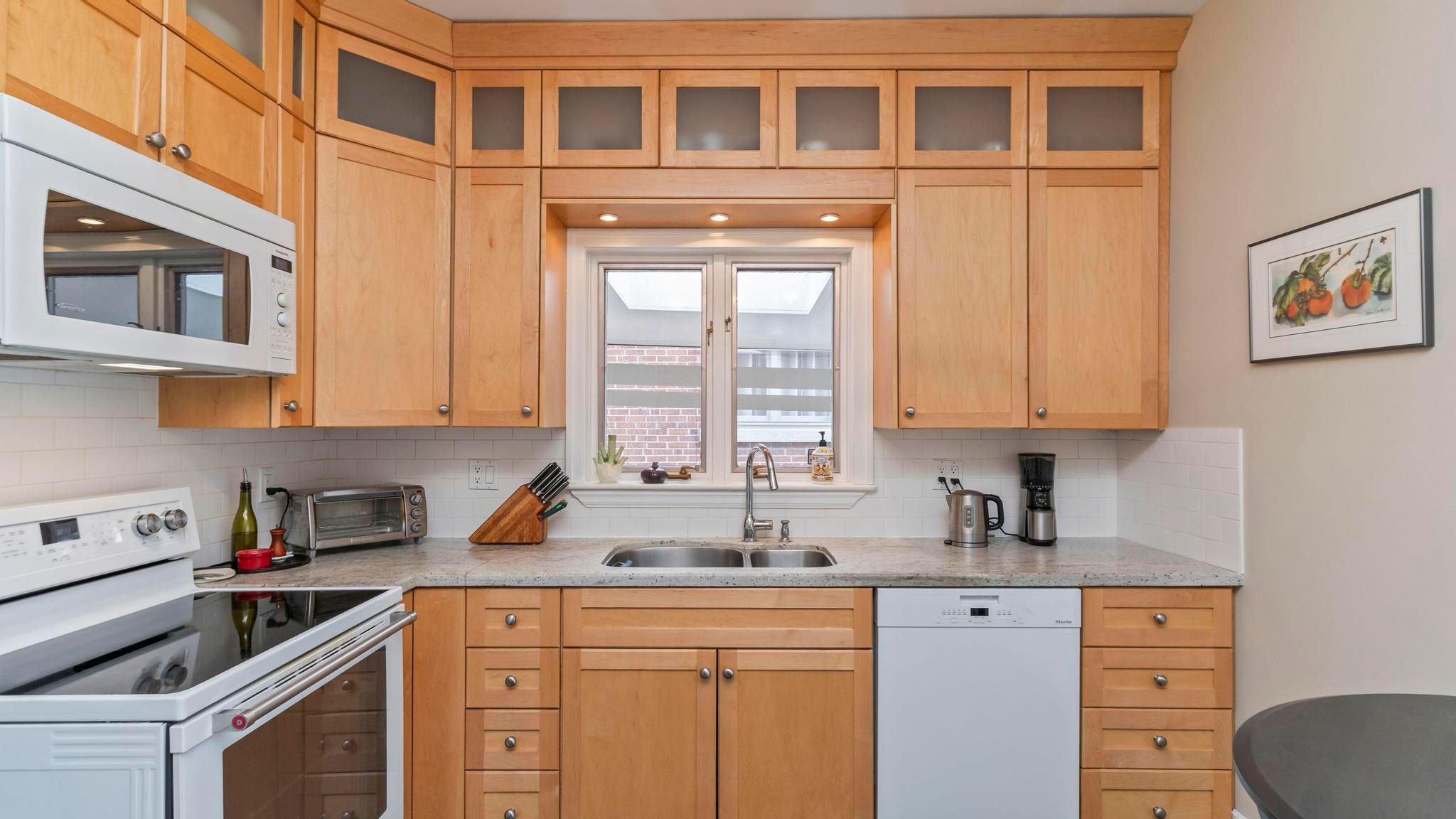 • Updated kitchen and bathrooms with heated floors for comfort.