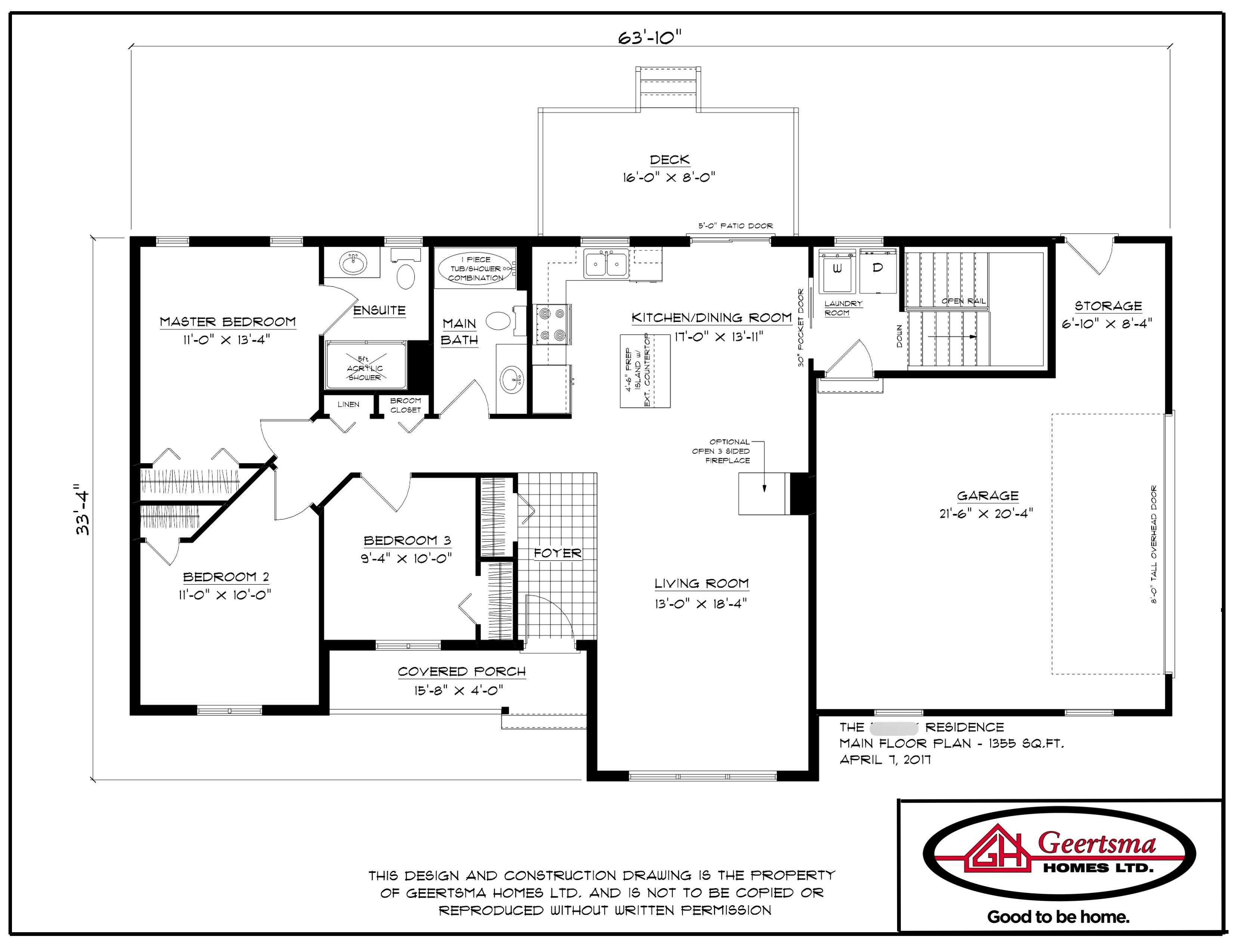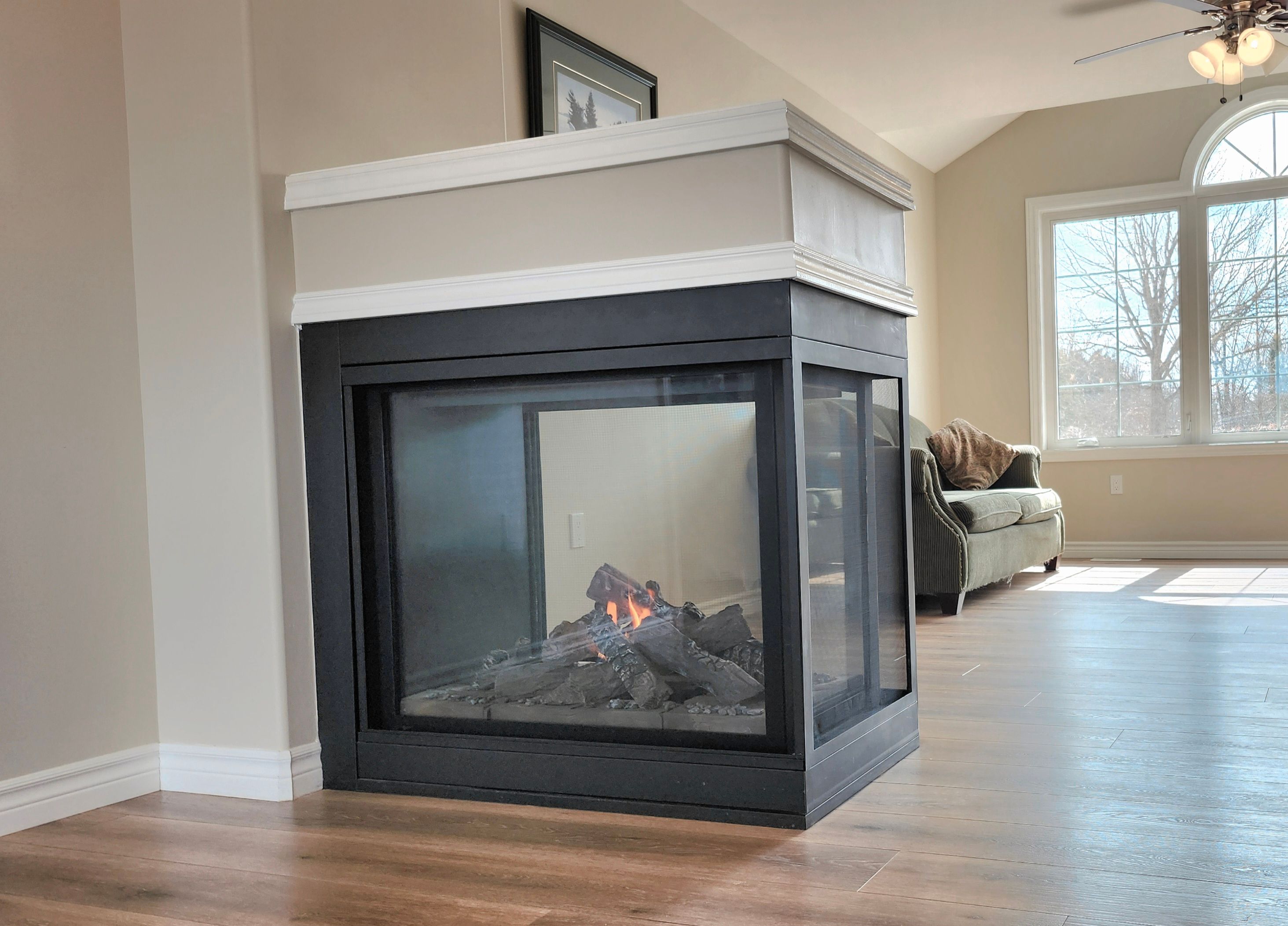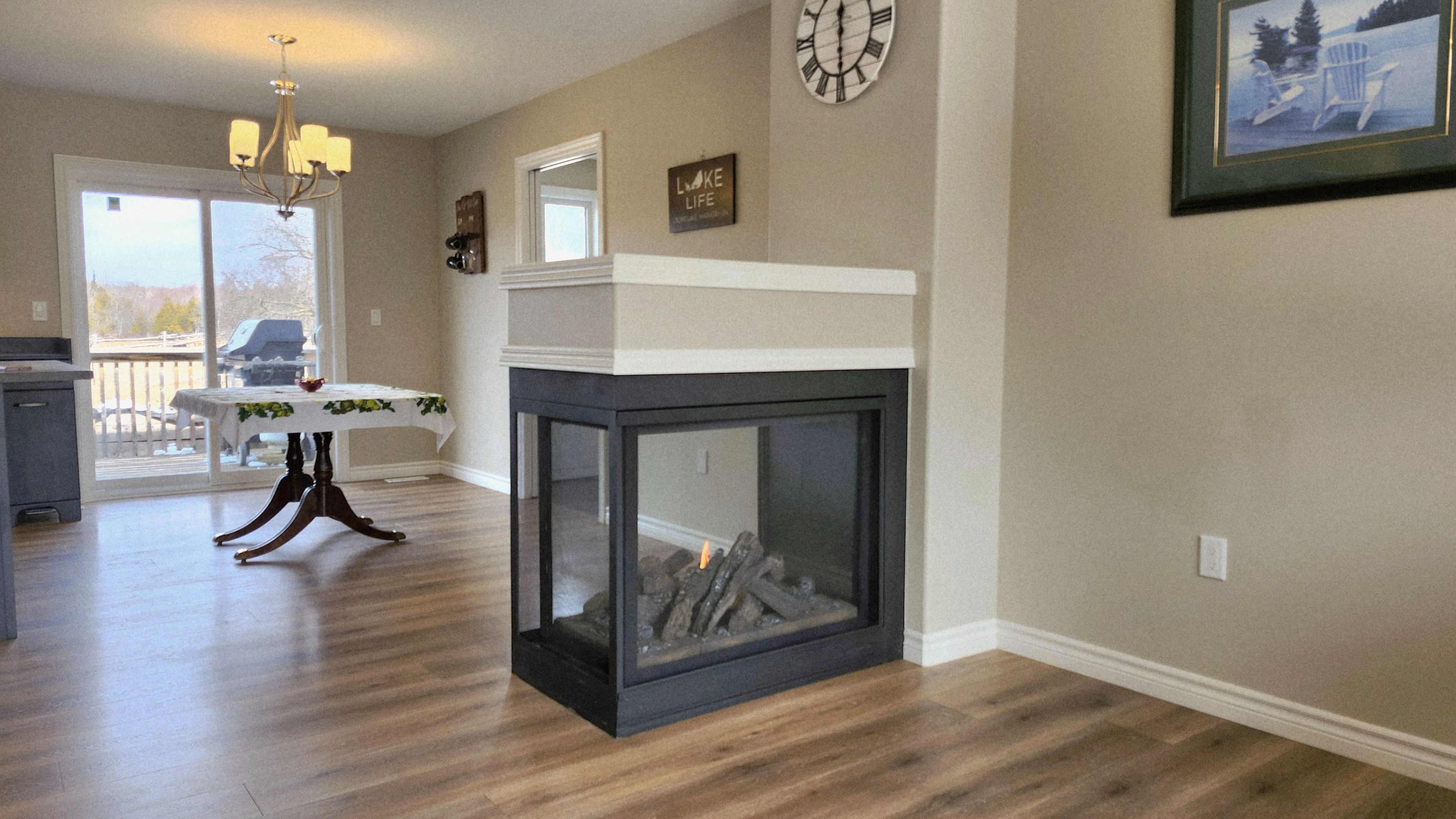 • Bright and spacious open concept main floor with a three-sided fireplace.