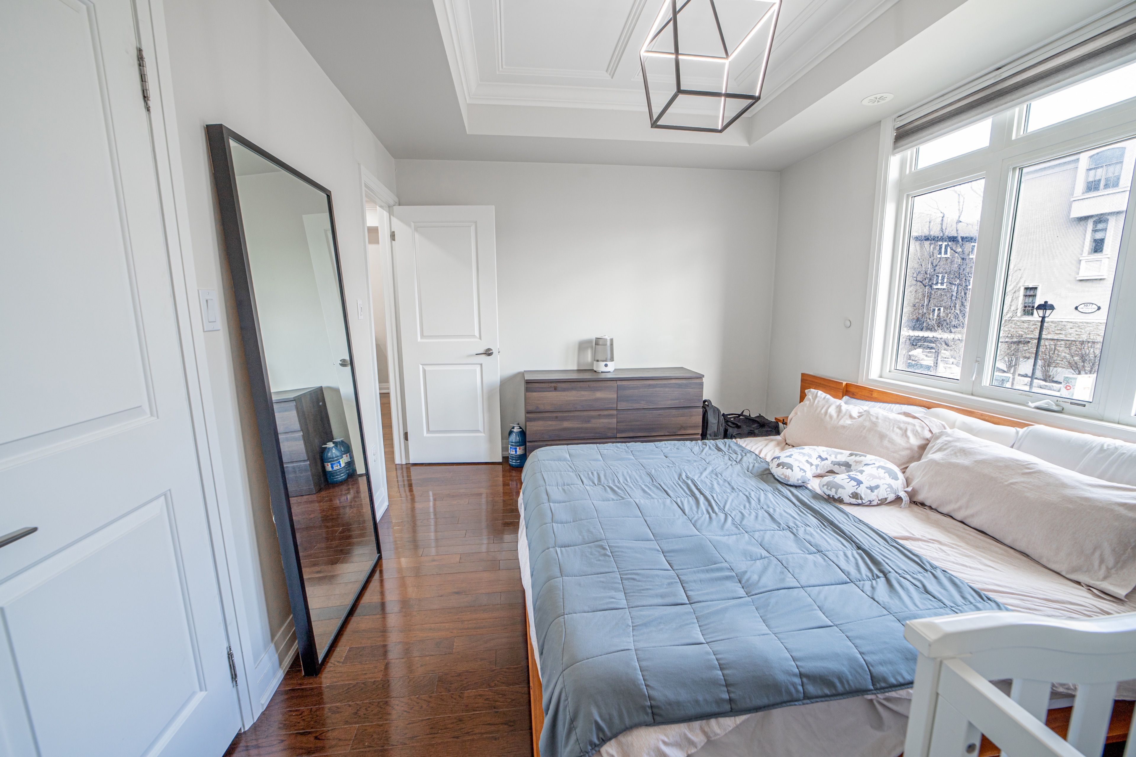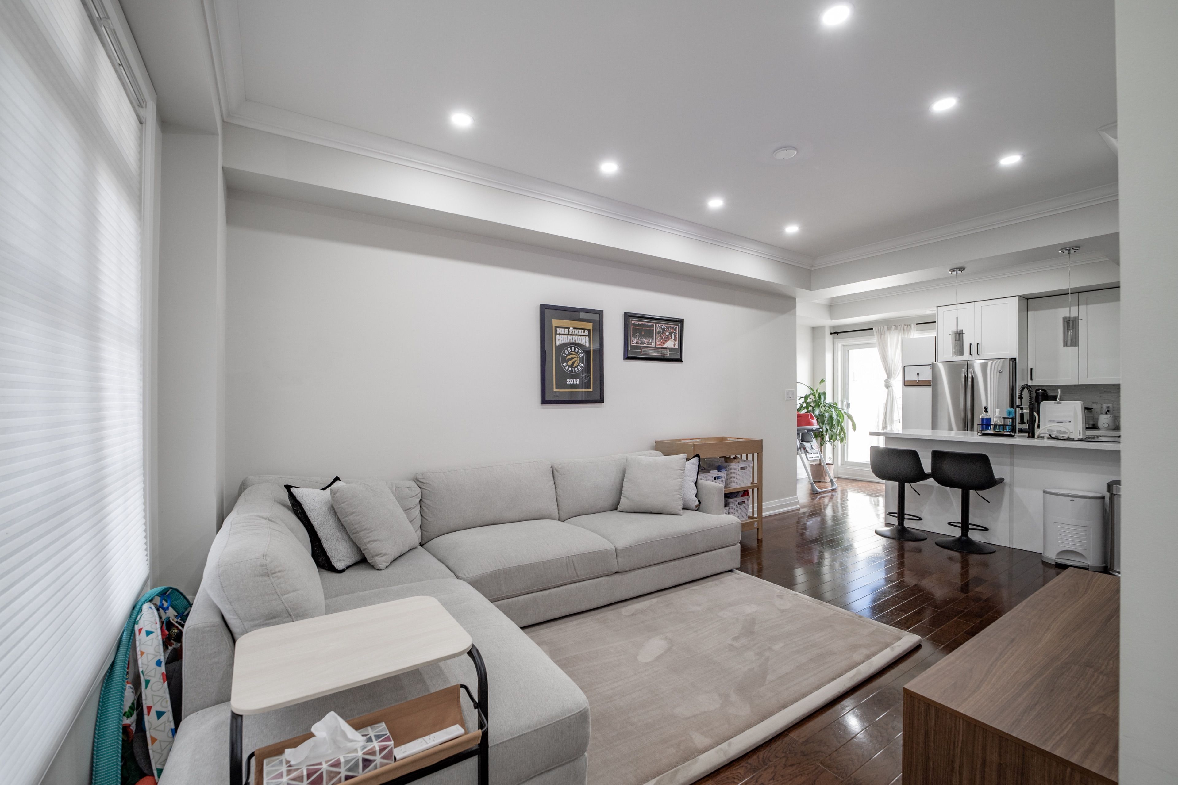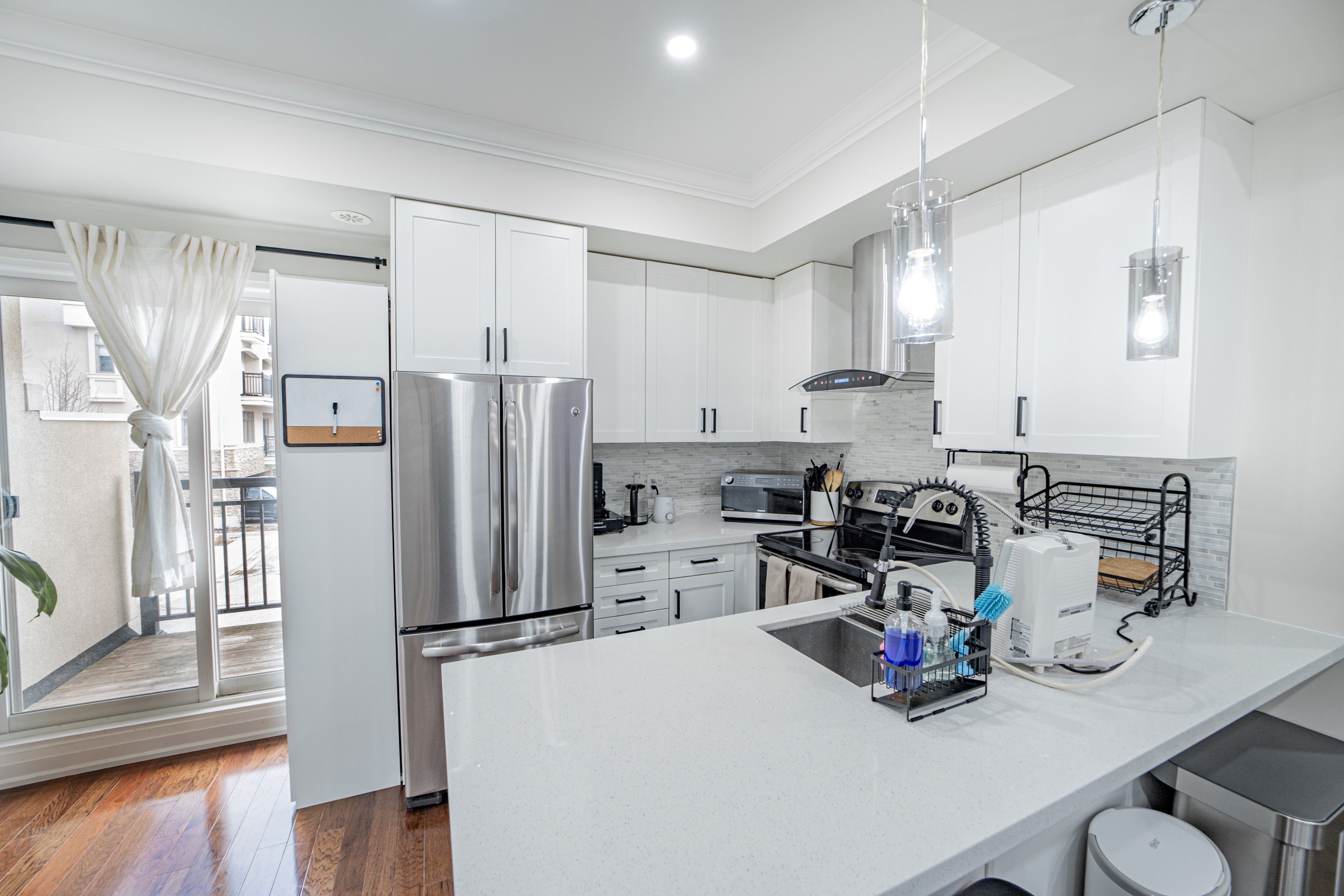 Executive living at its finest. Beautiful and functional 1-storey townhouse offering a spacious open concept layout with high ceilings and plenty of natural light. The main living area flows seamlessly into the kitchen featuring a breakfast bar, perfect for entertaining or everyday living. This luxury 1 bedroom, 1 bathroom home features a stunning marble bathroom and high end finishes throughout. Enjoy approximately 800 sq ft of combined indoor and outdoor living space in a well maintained unit designed for comfort and convenience. Includes ensuite washer and dryer plus rare 2 car parking with one driveway space and one built-in garage. Excellent location with easy access to hwy 403, 401, 410 and the qew, convenient public transit with one bus to the subway. Status certificate available. Perfect for first time buyers, professionals or investors looking for a stylish and low maintenance home in a great location.
