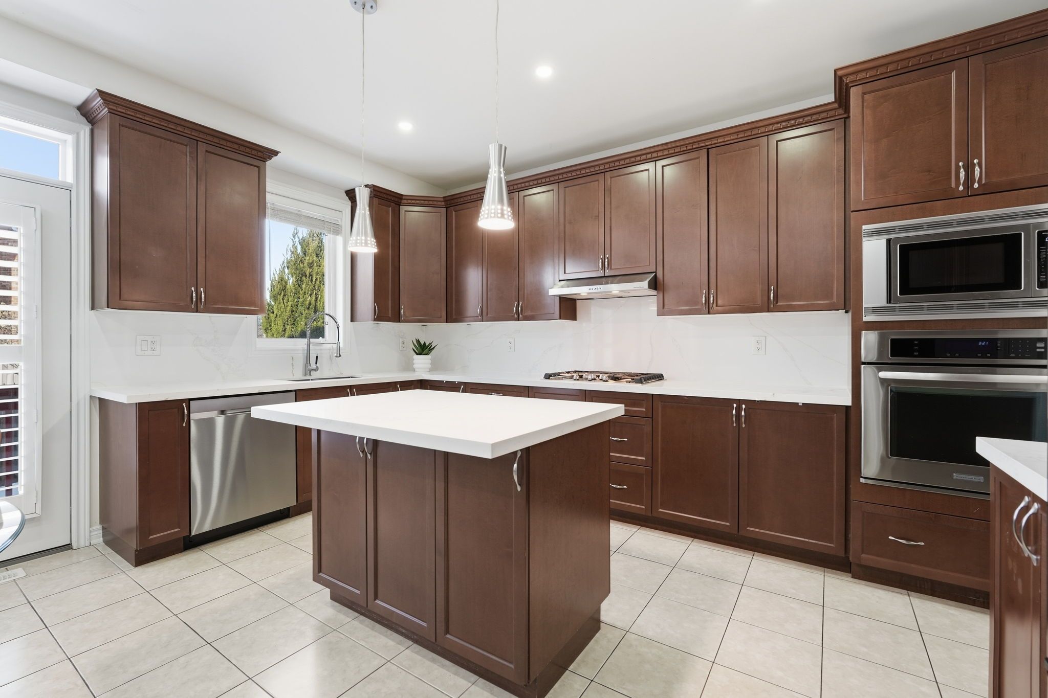 • Spacious kitchen with stone countertops, stainless steel appliances, and butler's pantry.