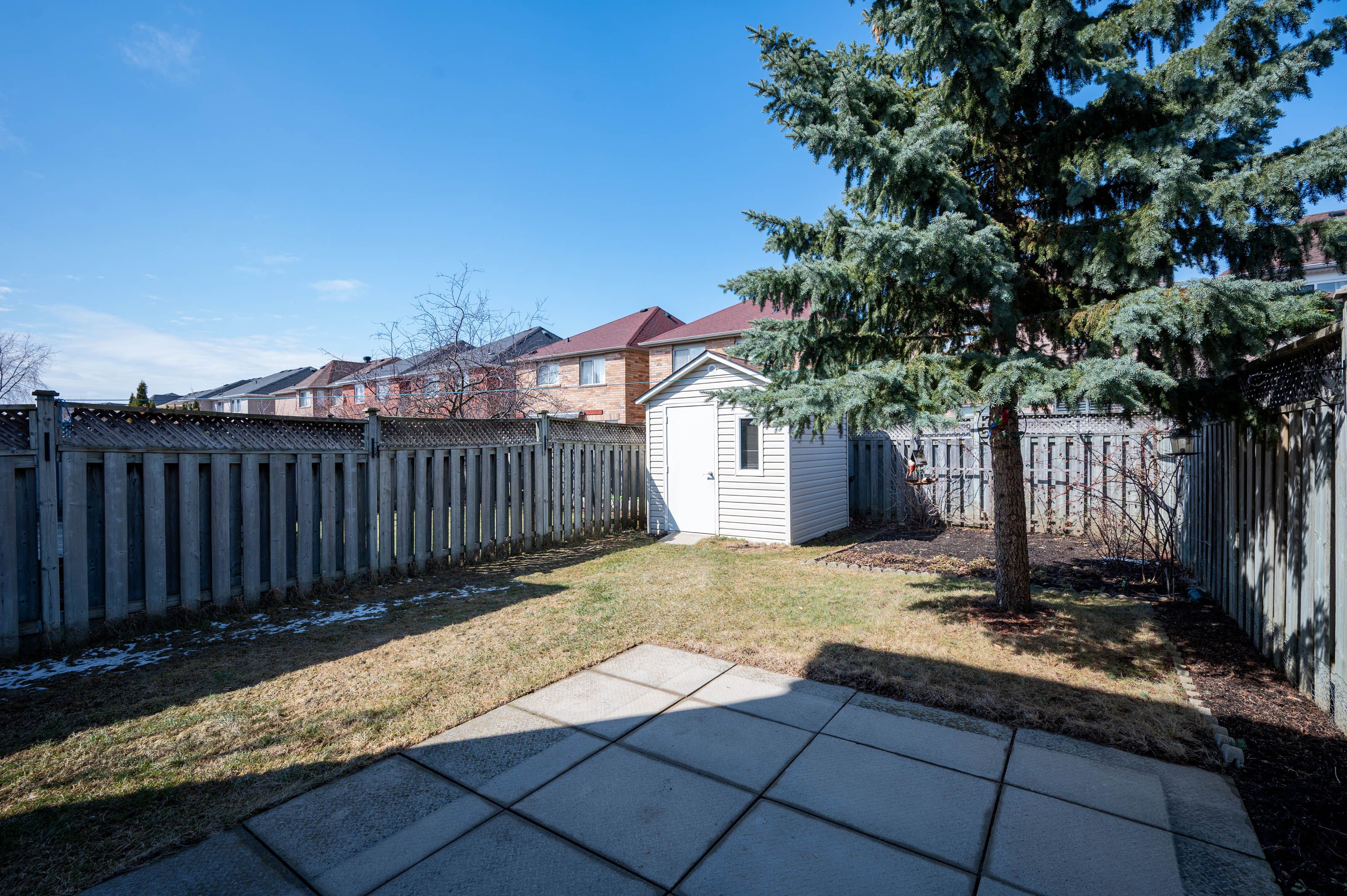 • Large, private fenced backyard with pine trees for added privacy.