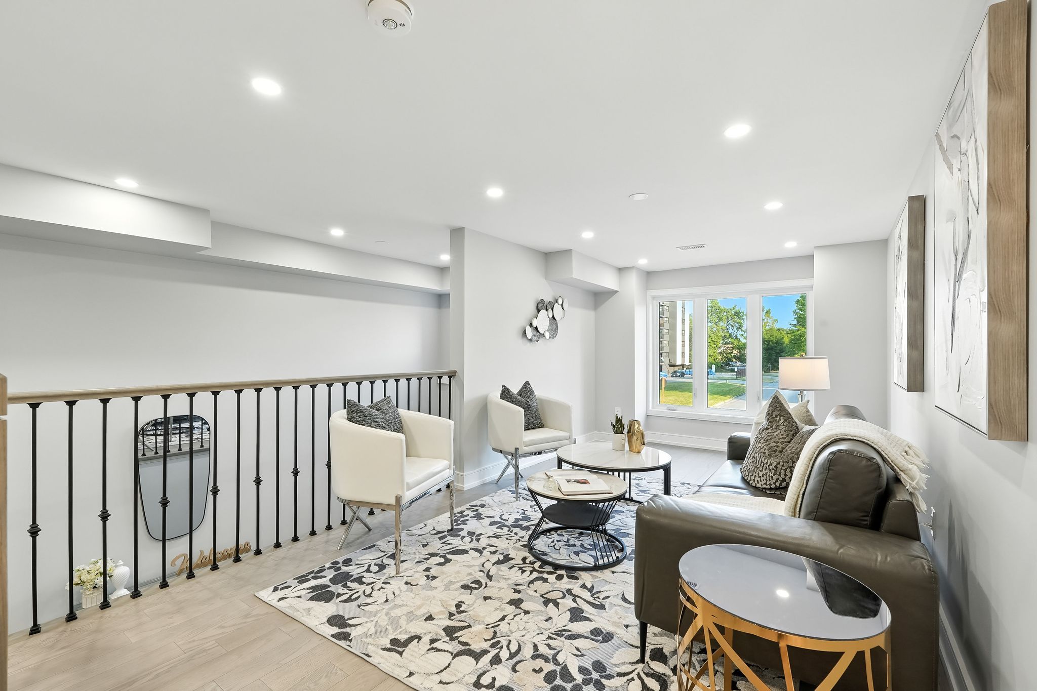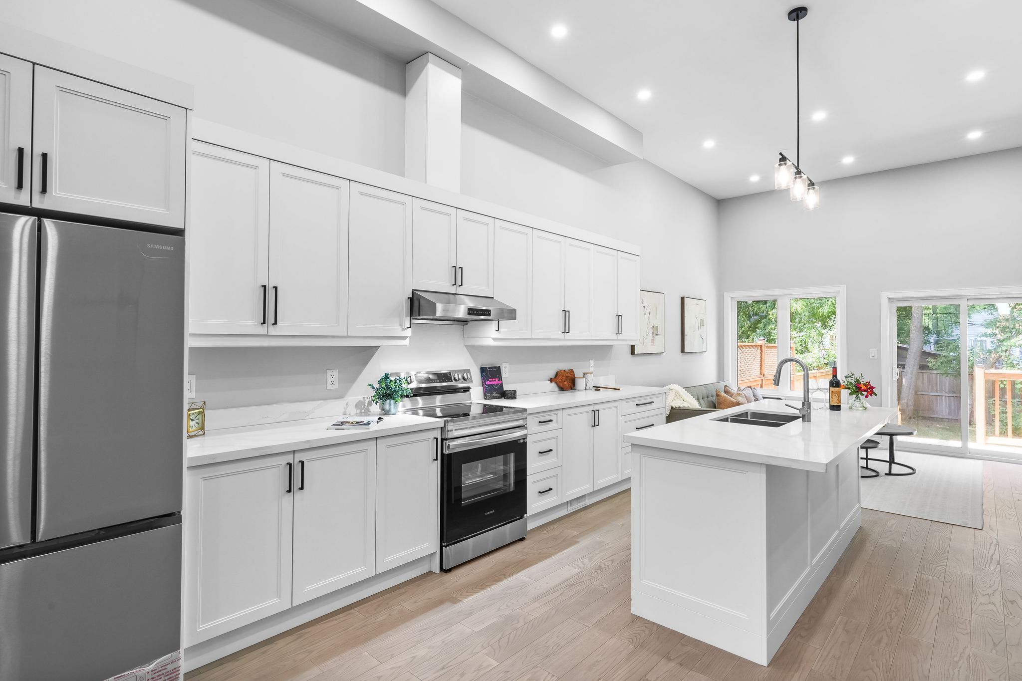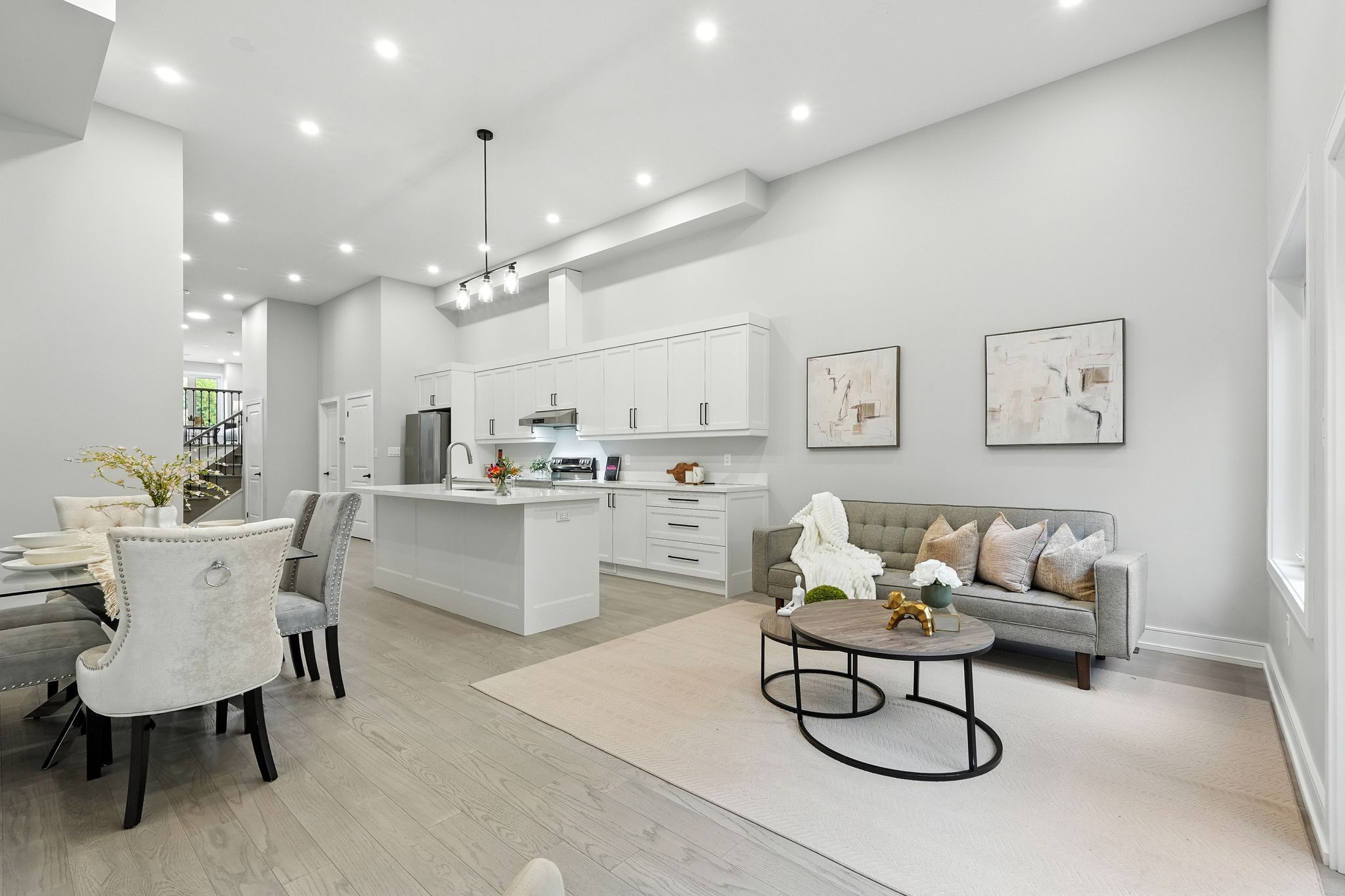 • Open-concept main level with 12-ft ceilings and large windows.