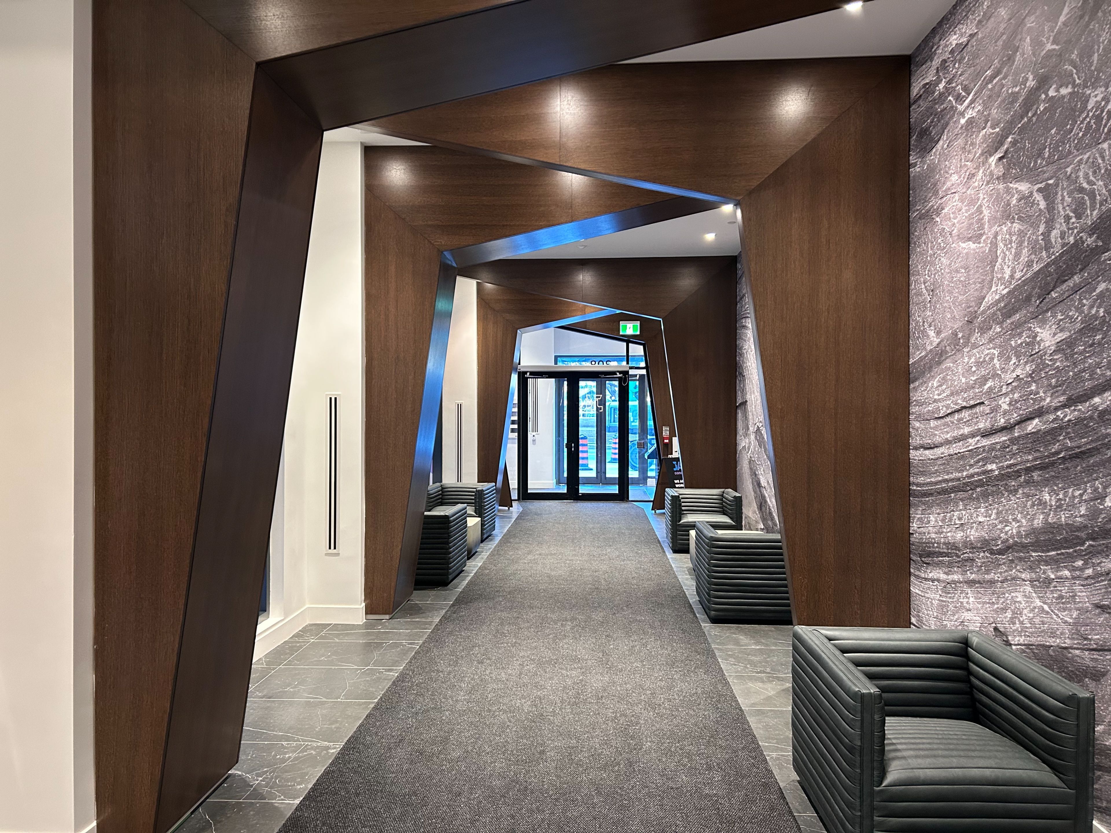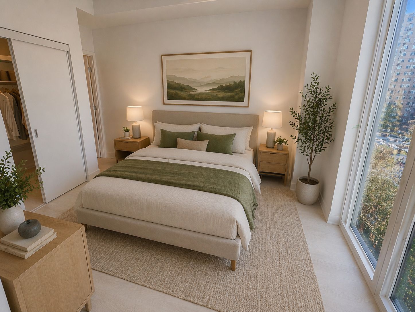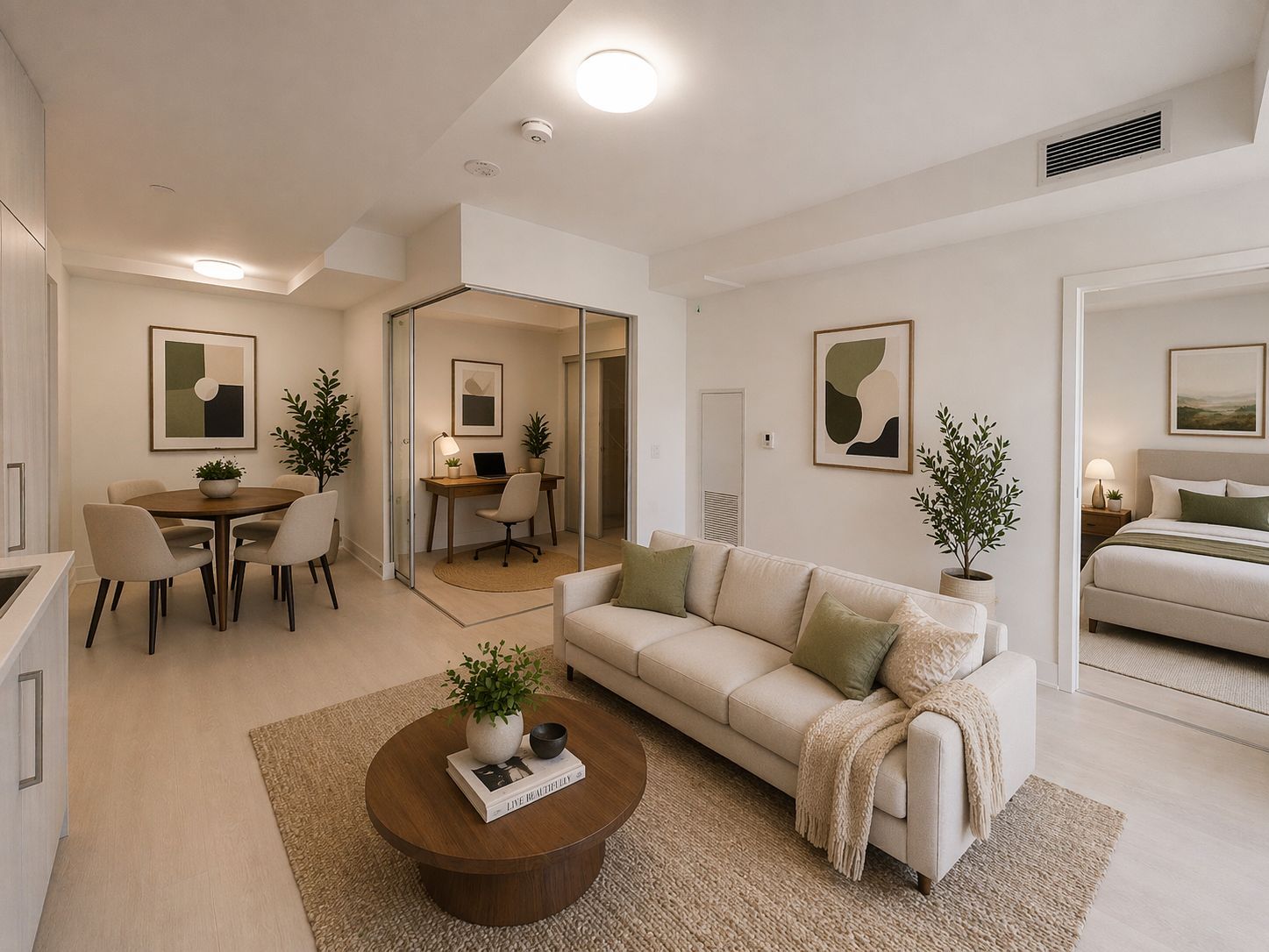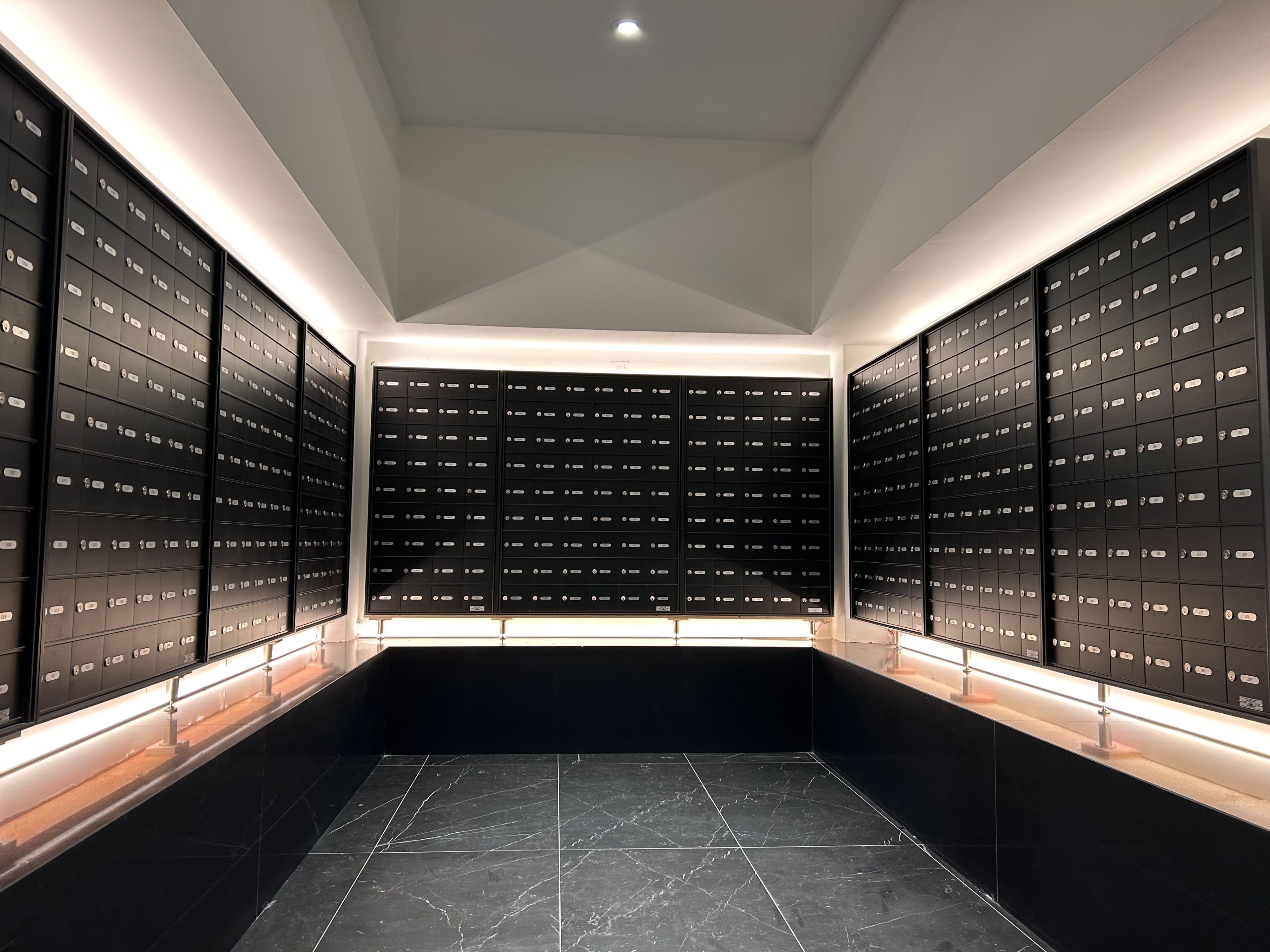 • Modern amenities include a gym, yoga studio, and media lounge.
