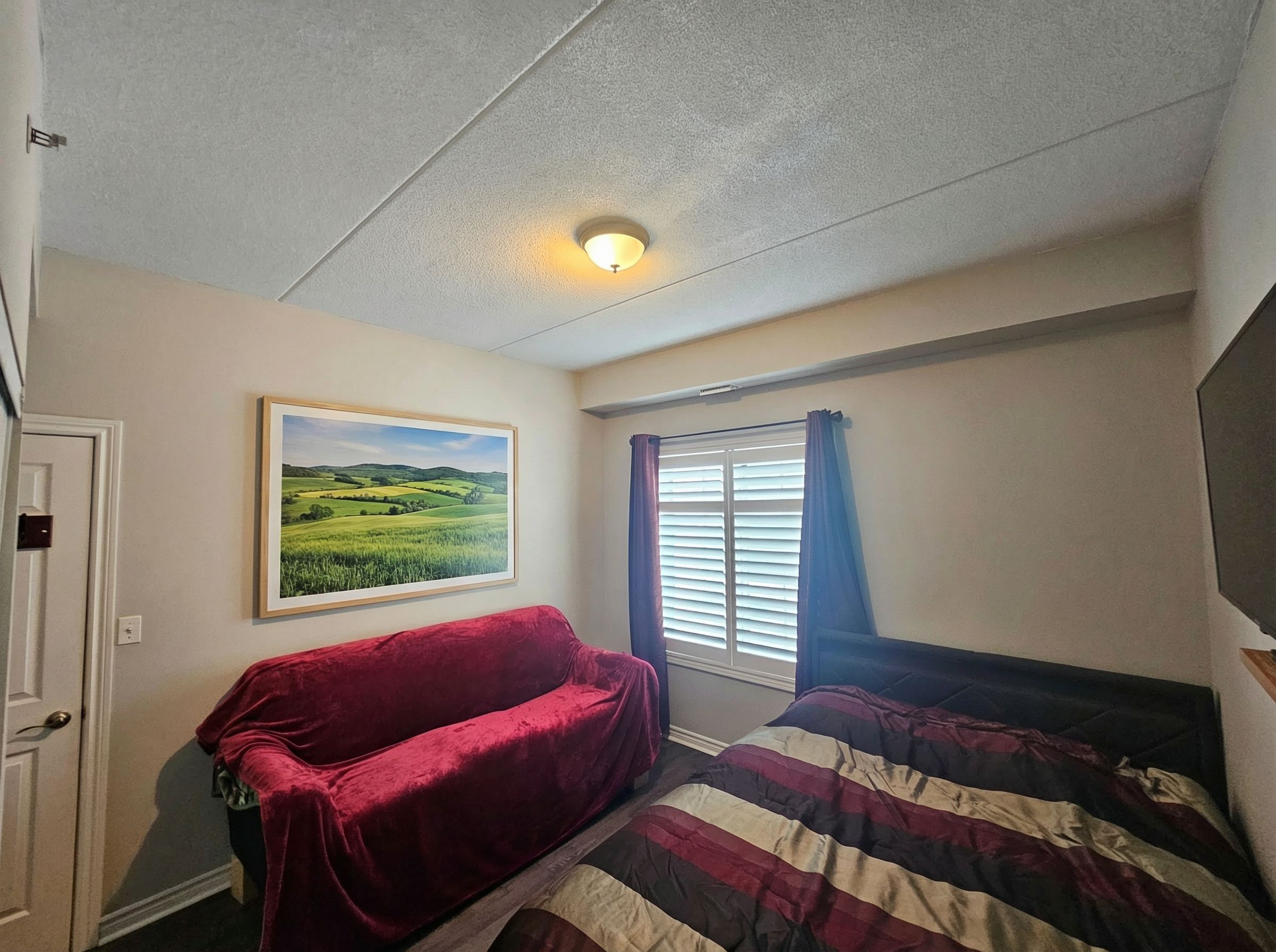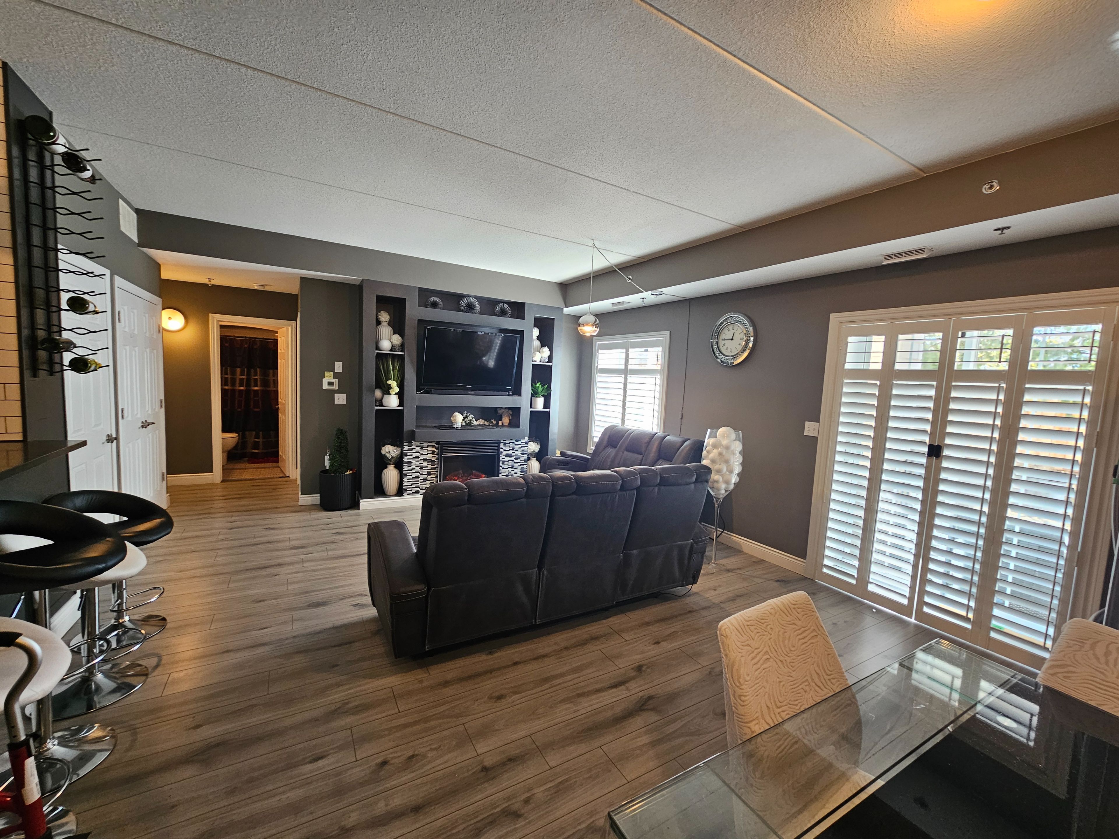 One of the best units in this pet-friendly building. Ground floor corner condo with 9 ft ceilings and extra windows for abundant natural light. Renovated unit featuring updated, luxurious flooring (this is a zero-carpet unit for those who don't like dust), quartz kitchen counters, upgraded cabinets, stainless steel appliances, stainless steel exhaust hood, and bulkhead kitchen lighting. Freshly painted in many areas with brand new california shutters (approx. $6,000) throughout. Spacious living/dining area with custom entertainment feature wall, built-in fireplace and tv mount. Primary ensuite includes recently updated $2,000 shower tower system. Both bathrooms upgraded with new sinks, faucets and backsplashes. New heating system and central a/c. Open balcony, underground parking and storage locker. Amenities include a party room. 1 underground parking spot, and ample parking above ground for a second vehicle. Other pluses are not needing the elevator to bring in groceries, sitting out on your ground floor balcony, like living in a bungalow without the maintenance. For the nature lovers and pet walkers, there are multiple trails within the local area!