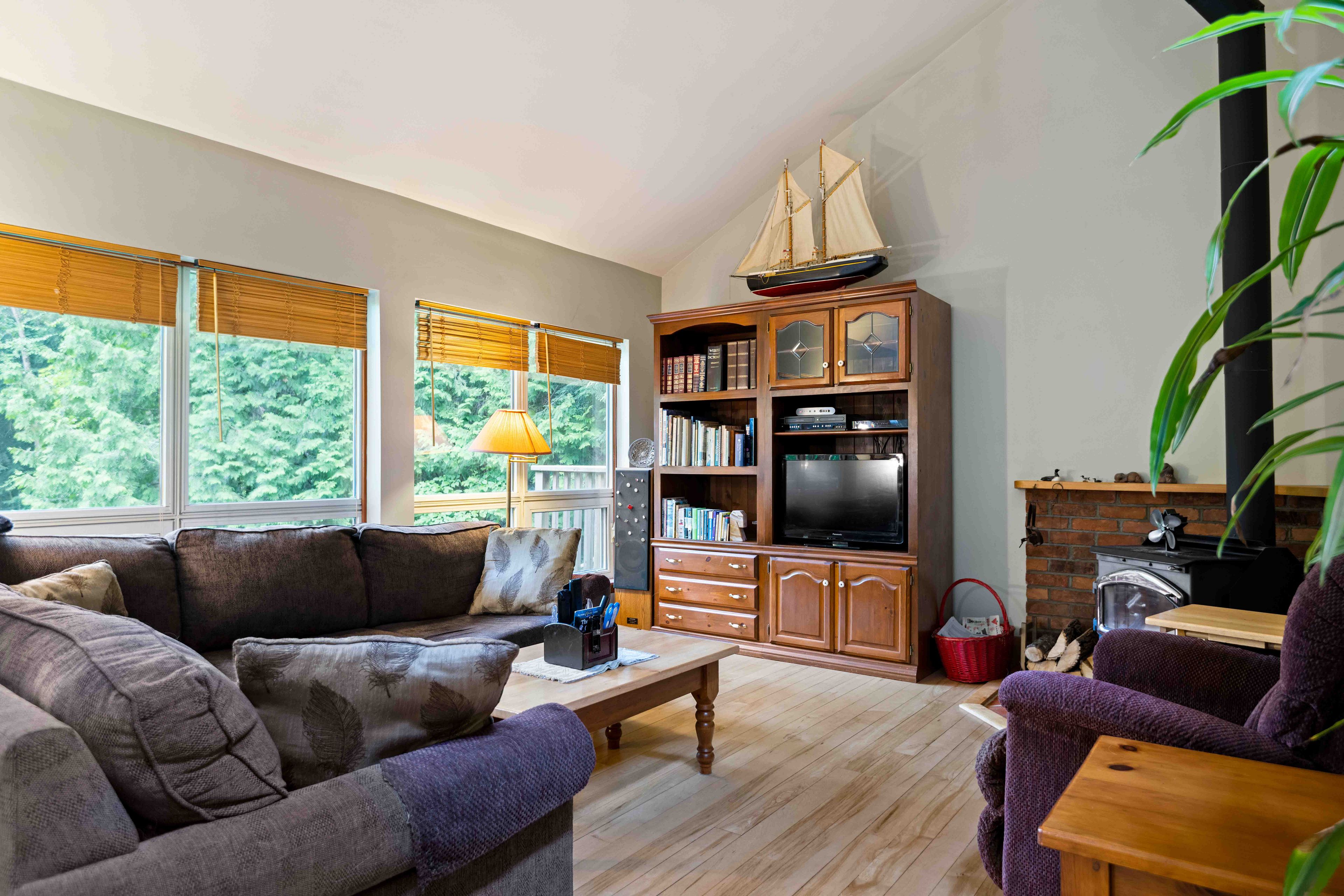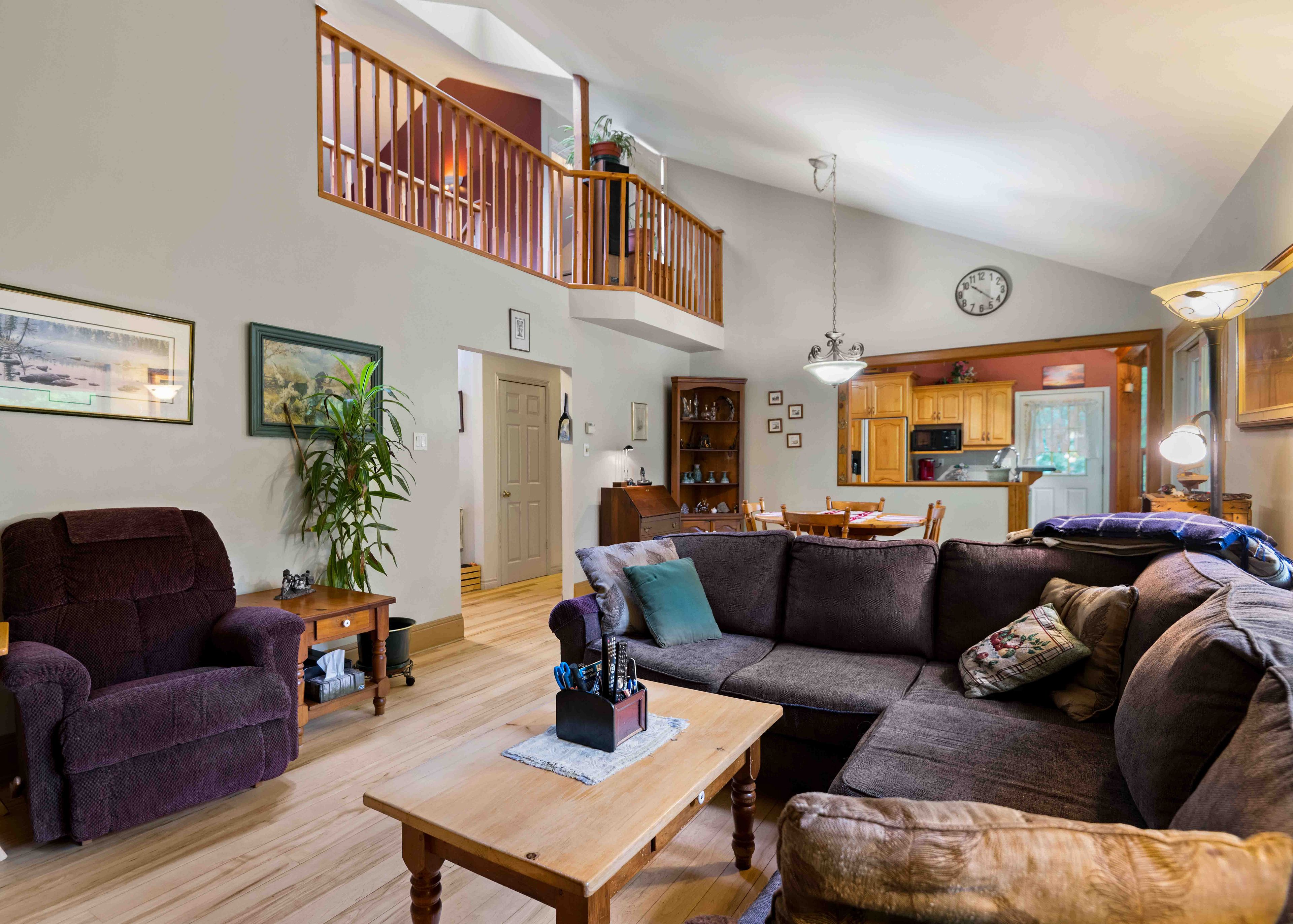 • Great room features large windows and vaulted ceiling, offering natural light.