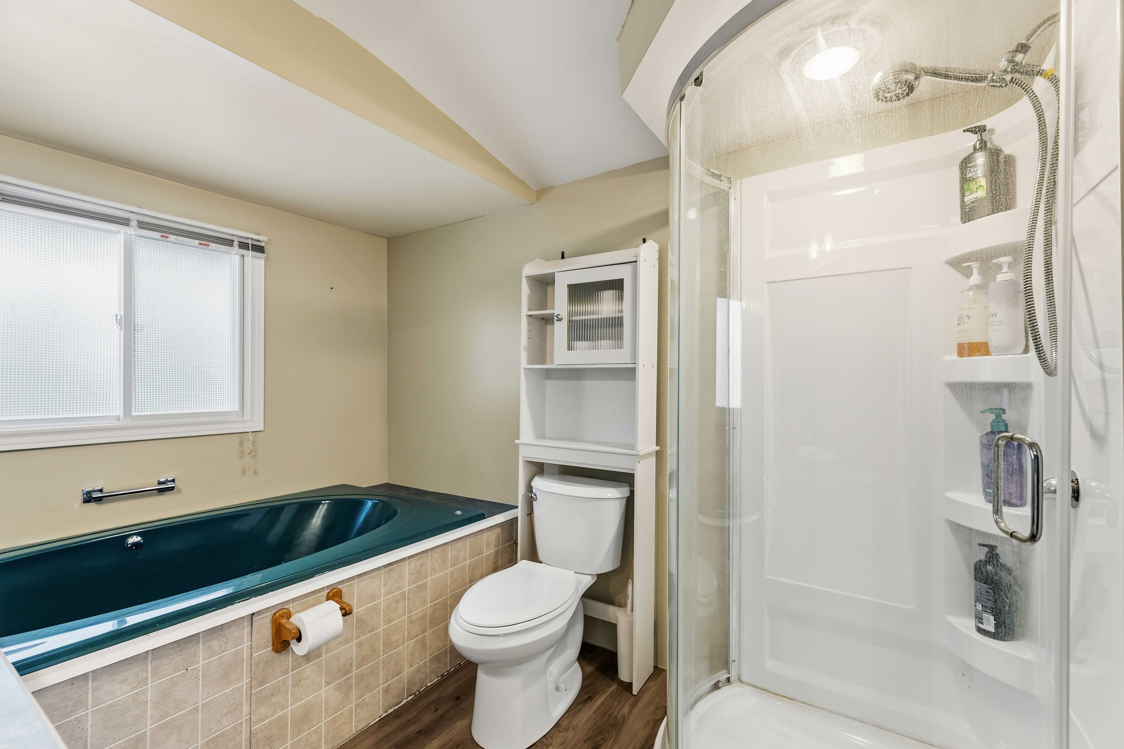 • Luxurious soaking tub and newer shower for relaxation.