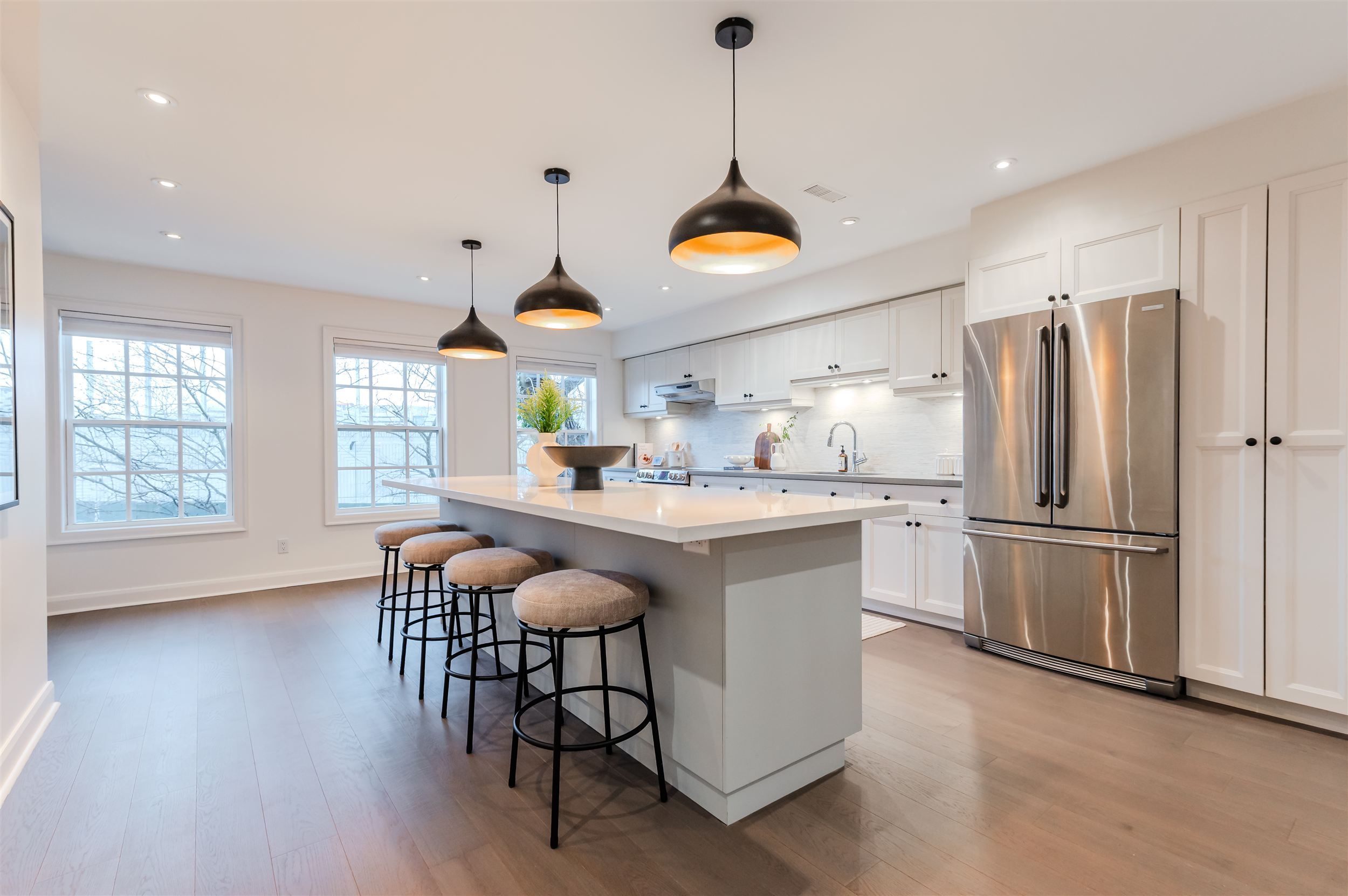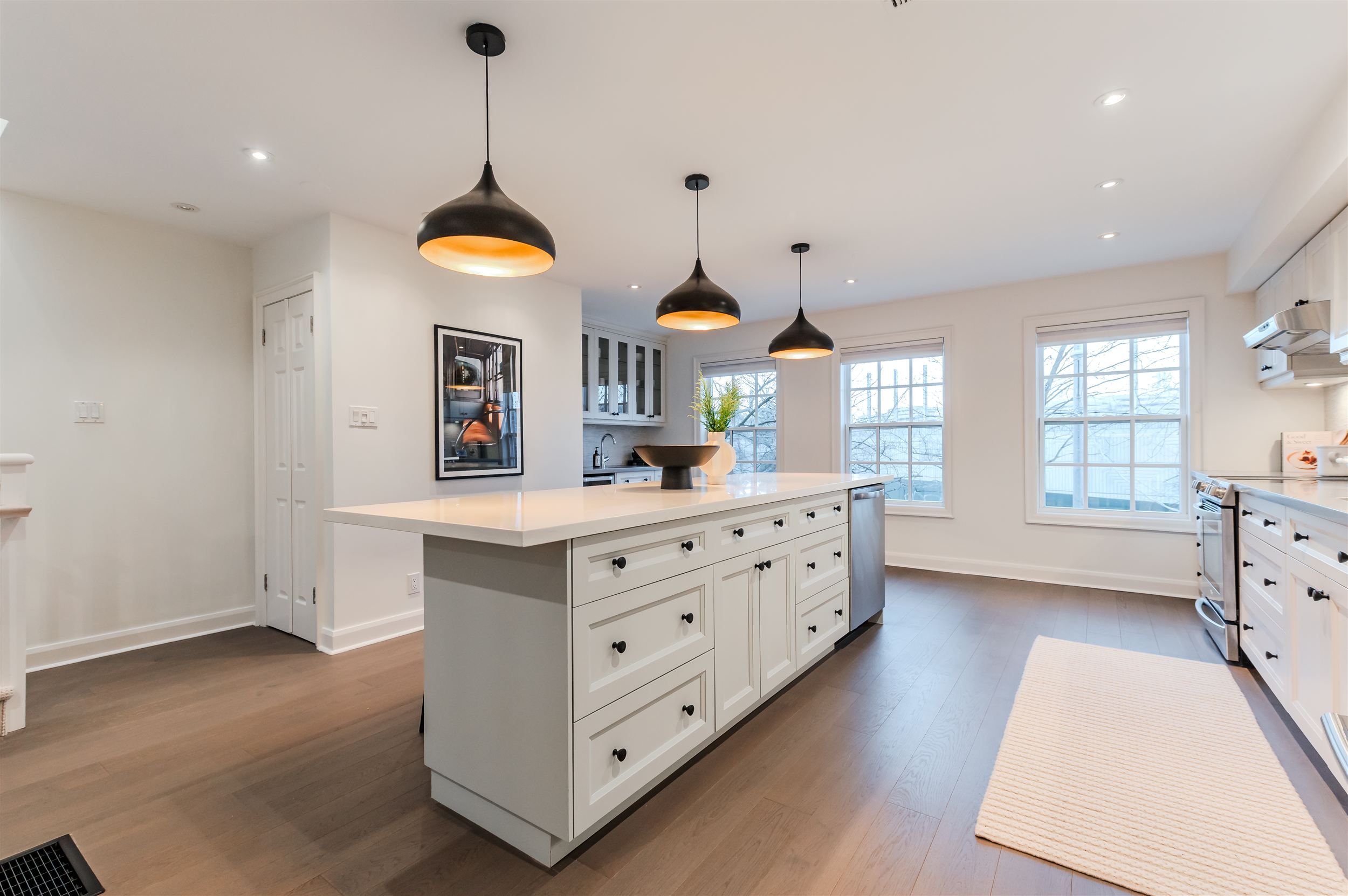• Custom gourmet kitchen with quartz countertops and oversized island.