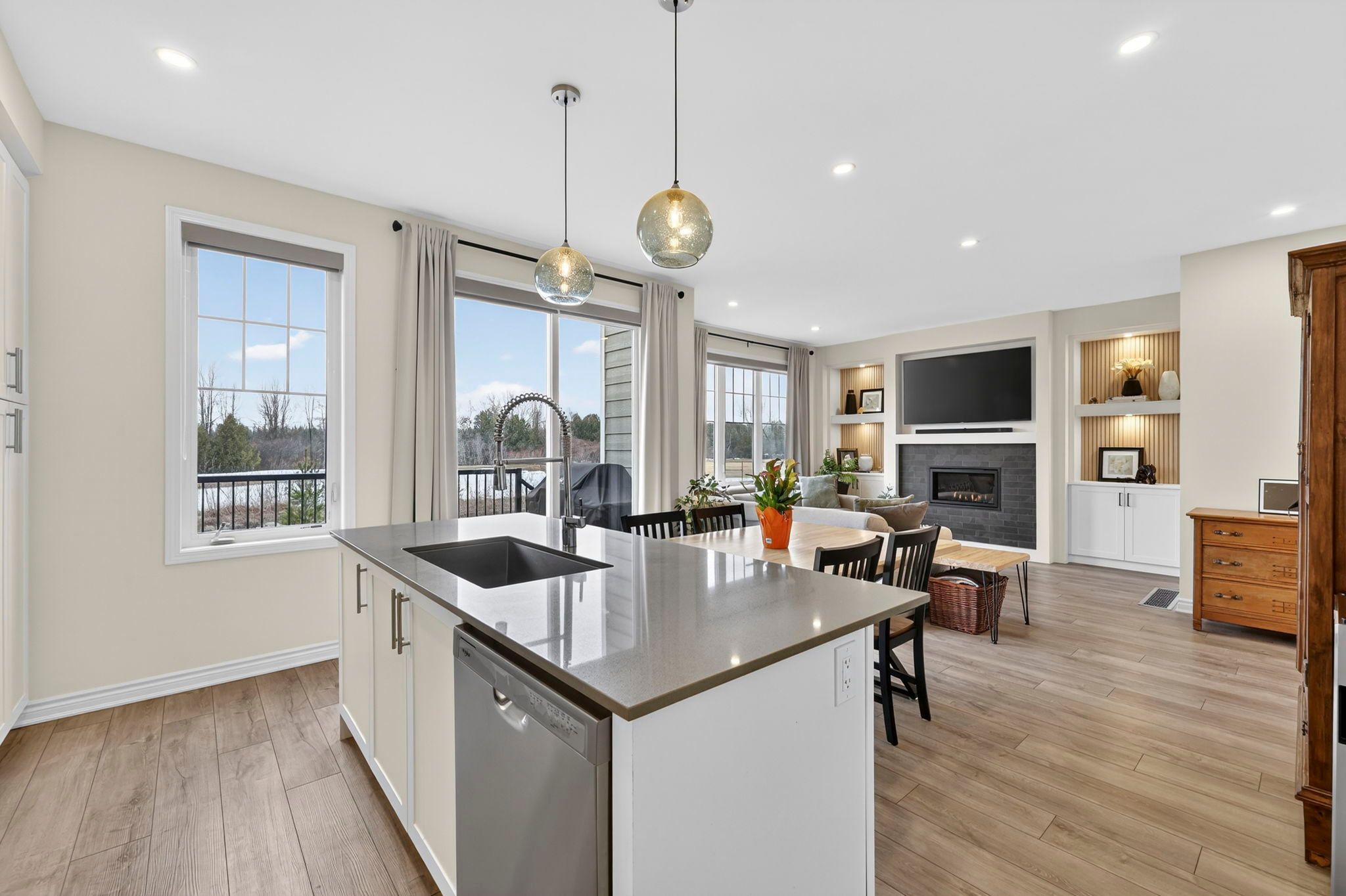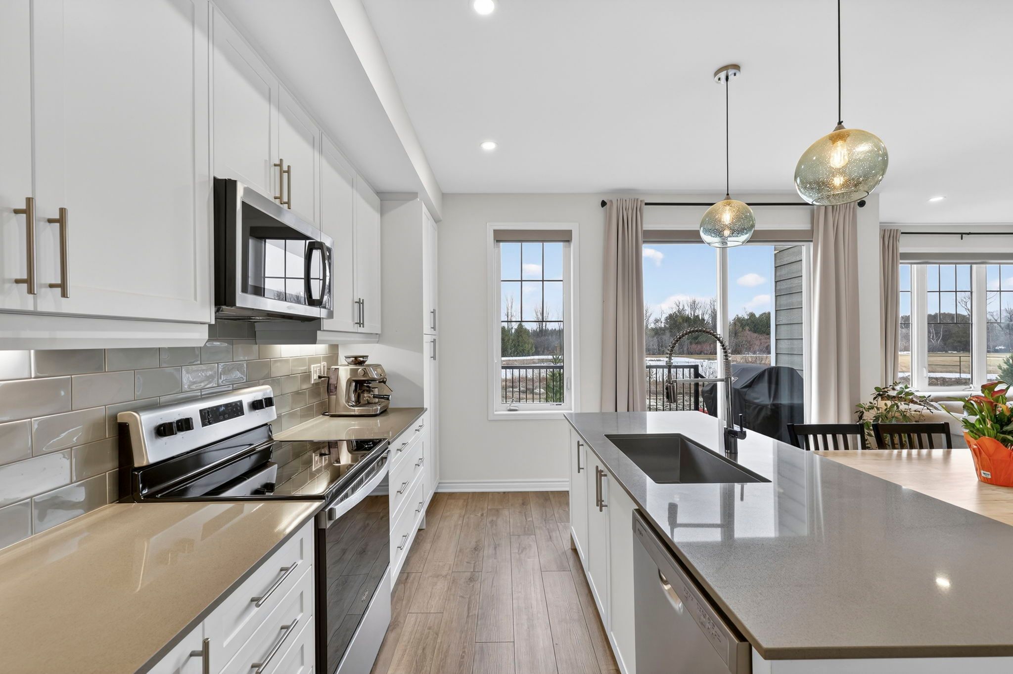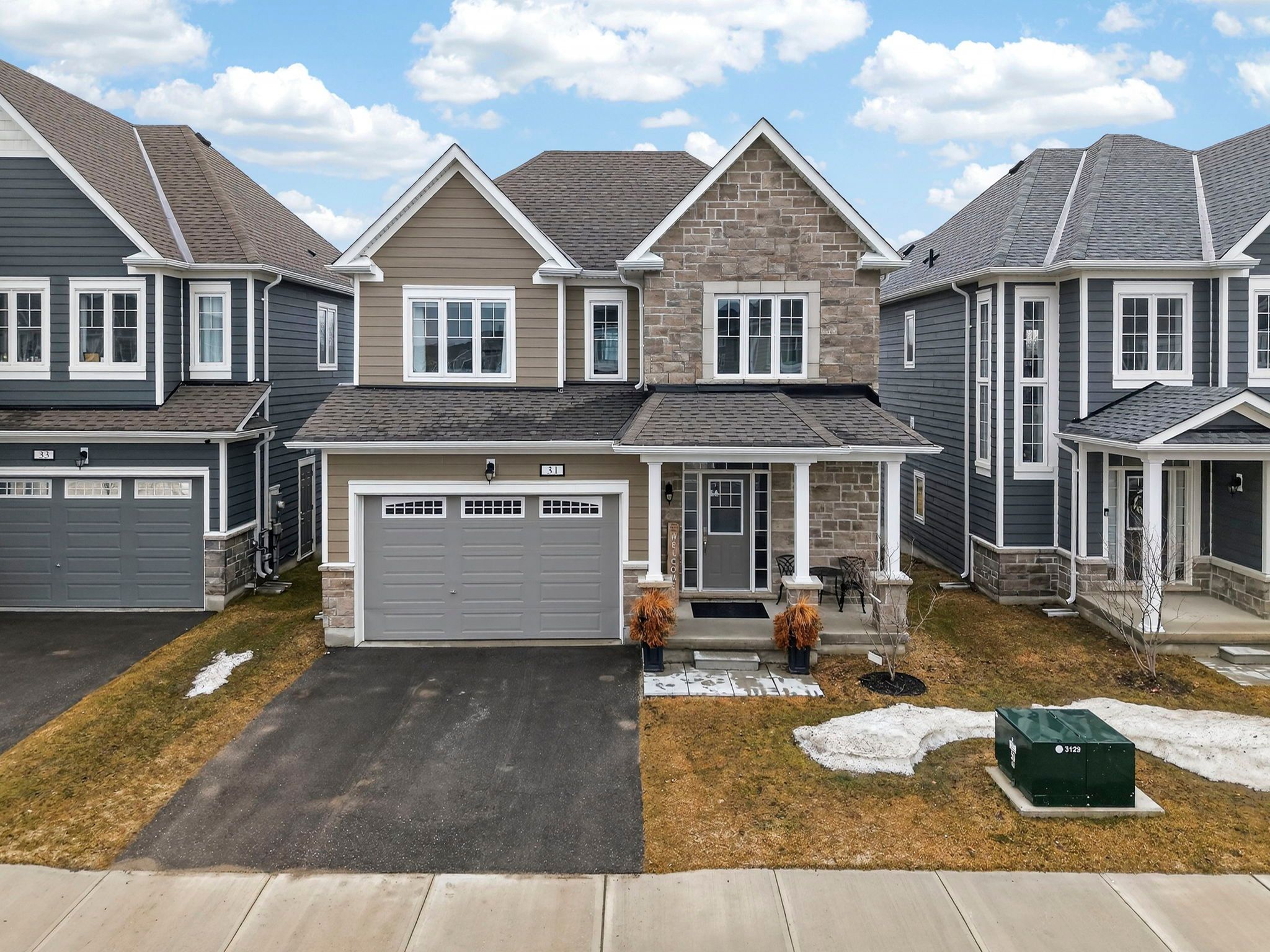 Welcome to 31 abby drive in wasaga beach-an exceptional 2023-built home backing onto the fairways and pond of georgian sands golf course. Offering 3 bedrooms, 2. 5 bathrooms and approximately 1,763 sq ft, this upgraded two-storey home combines modern design with peaceful west-facing views. The open-concept main floor features 9' ceilings and a bright, functional layout. The kitchen is beautifully finished with quartz countertops, undermount sink, custom tile backsplash, under-cabinet lighting, pantry, island with bar seating, and whirlpool appliances. Walk out from the dining area to a brand new (2025) two-tier deck with natural gas bbq hookup-perfect for entertaining or relaxing while overlooking the golf course and water. The living room offers stunning sunset views and a custom feature wall with gas fireplace, built-in shelving, and cabinetry. Upstairs, you'll find three spacious bedrooms, a full main bath, convenient laundry room, and a well-appointed primary suite with walk-in closet and private ensuite featuring double sinks, quartz counters, and a separate water closet. All bedrooms include vinyl flooring, ceiling fans, and large windows. Custom blinds and curtains are installed throughout, and the home is equipped with bell fiber internet. The unfinished basement offers excellent potential with large above-grade windows, bathroom rough-in, sump pump with backup power, hrv system, water softener with chlorine treatment, and 200 amp service. Additional features include a 1. 5 car garage with inside entry and side door, paved driveway with parking for two, and durable exterior finishes including engineered hardboard siding and manufactured stone veneer. Monthly common element fee approx. $325. Balance of tarion warranty included. A move-in ready home in a beautiful setting-ideal for golfers, nature lovers, or anyone seeking a newer home with premium upgrades and scenic views.
