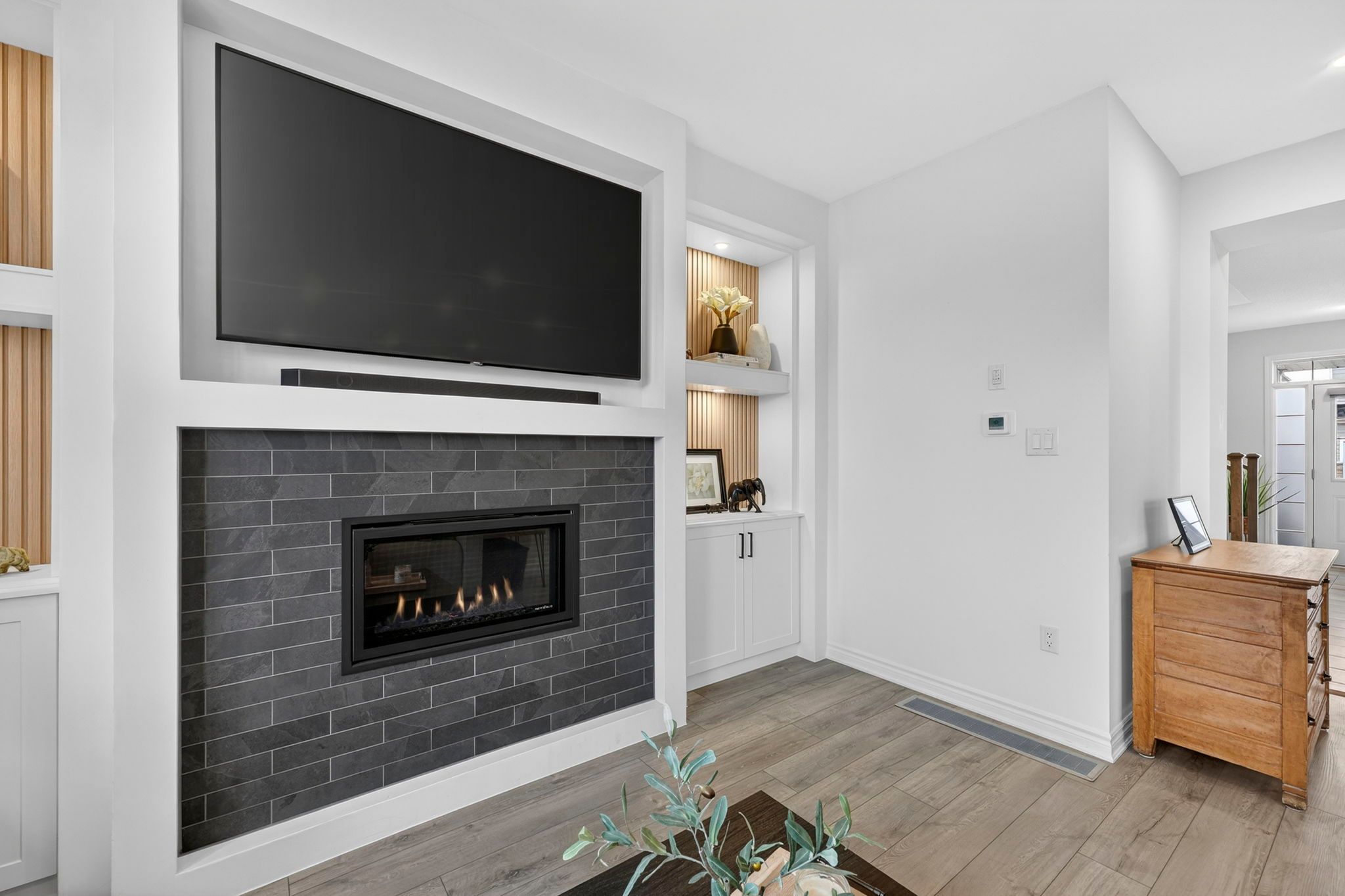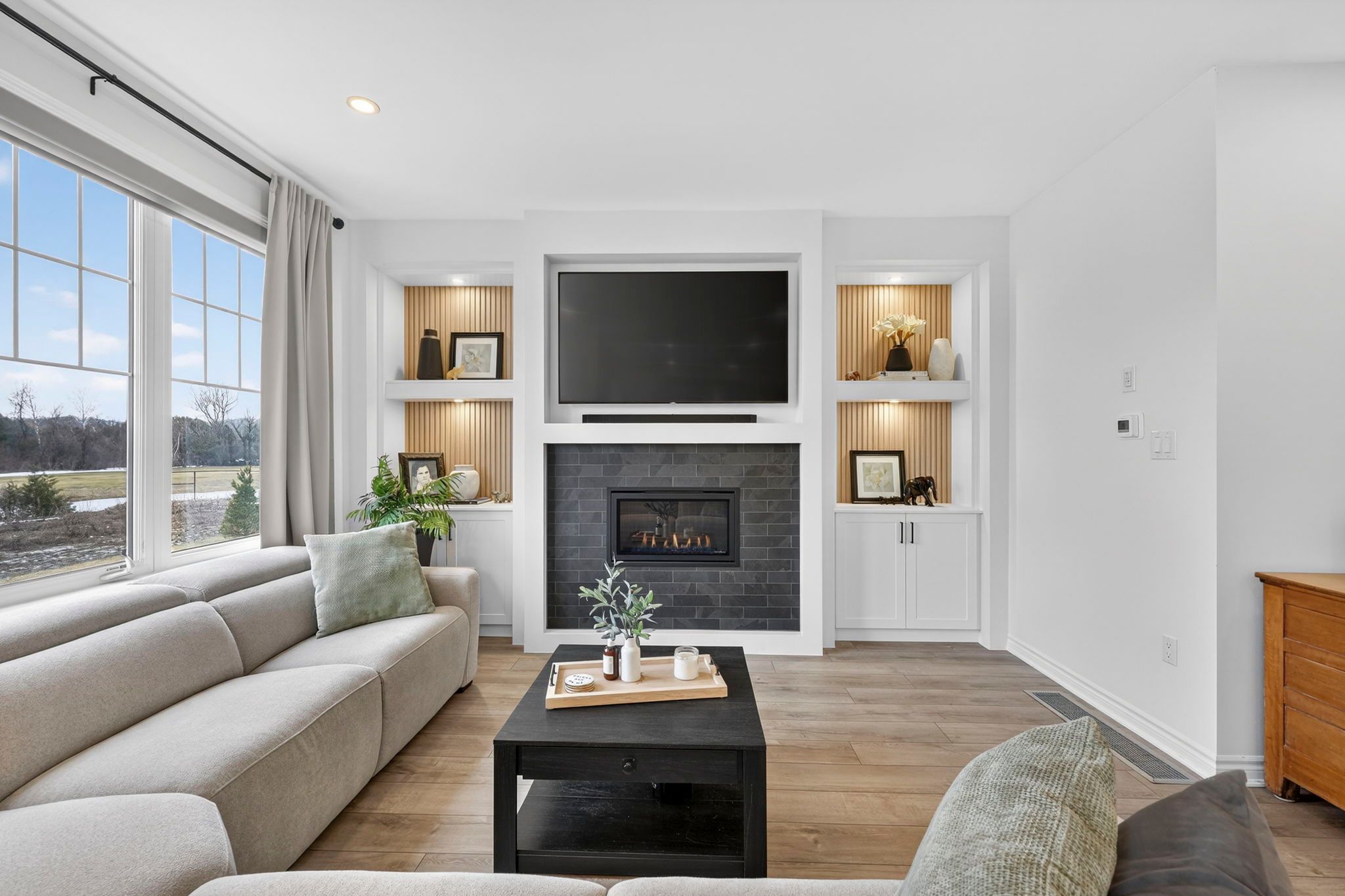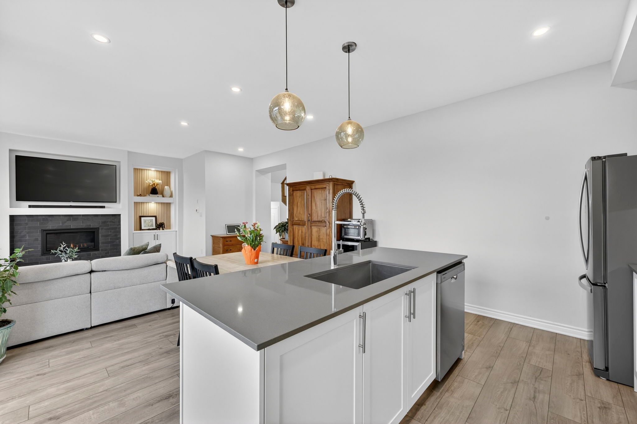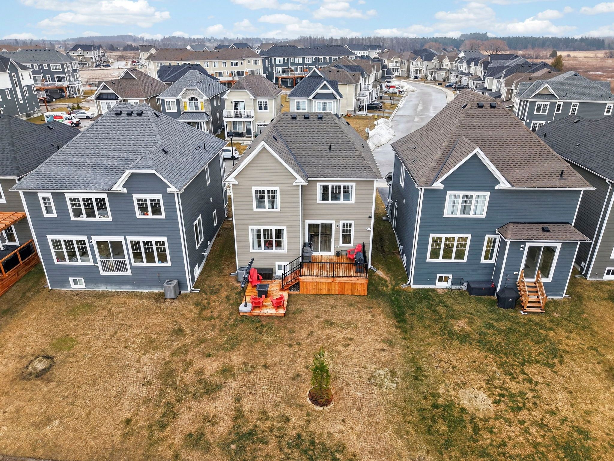 Welcome to 31 abby drive in wasaga beach-an exceptional 2023-built home backing onto the fairways and pond of georgian sands golf course. Offering 3 bedrooms, 2. 5 bathrooms and approximately 1,763 sq ft, this upgraded two-storey home combines modern design with peaceful west-facing views. The open-concept main floor features 9' ceilings and a bright, functional layout. The kitchen is beautifully finished with quartz countertops, undermount sink, custom tile backsplash, under-cabinet lighting, pantry, island with bar seating, and whirlpool appliances. Walk out from the dining area to a brand new (2025) two-tier deck with natural gas bbq hookup-perfect for entertaining or relaxing while overlooking the golf course and water. The living room offers stunning sunset views and a custom feature wall with gas fireplace, built-in shelving, and cabinetry. Upstairs, you'll find three spacious bedrooms, a full main bath, convenient laundry room, and a well-appointed primary suite with walk-in closet and private ensuite featuring double sinks, quartz counters, and a separate water closet. All bedrooms include vinyl flooring, ceiling fans, and large windows. Custom blinds and curtains are installed throughout, and the home is equipped with bell fiber internet. The unfinished basement offers excellent potential with large above-grade windows, bathroom rough-in, sump pump with backup power, hrv system, water softener with chlorine treatment, and 200 amp service. Additional features include a 1. 5 car garage with inside entry and side door, paved driveway with parking for two, and durable exterior finishes including engineered hardboard siding and manufactured stone veneer. Monthly common element fee approx. $325. Balance of tarion warranty included. A move-in ready home in a beautiful setting-ideal for golfers, nature lovers, or anyone seeking a newer home with premium upgrades and scenic views.
