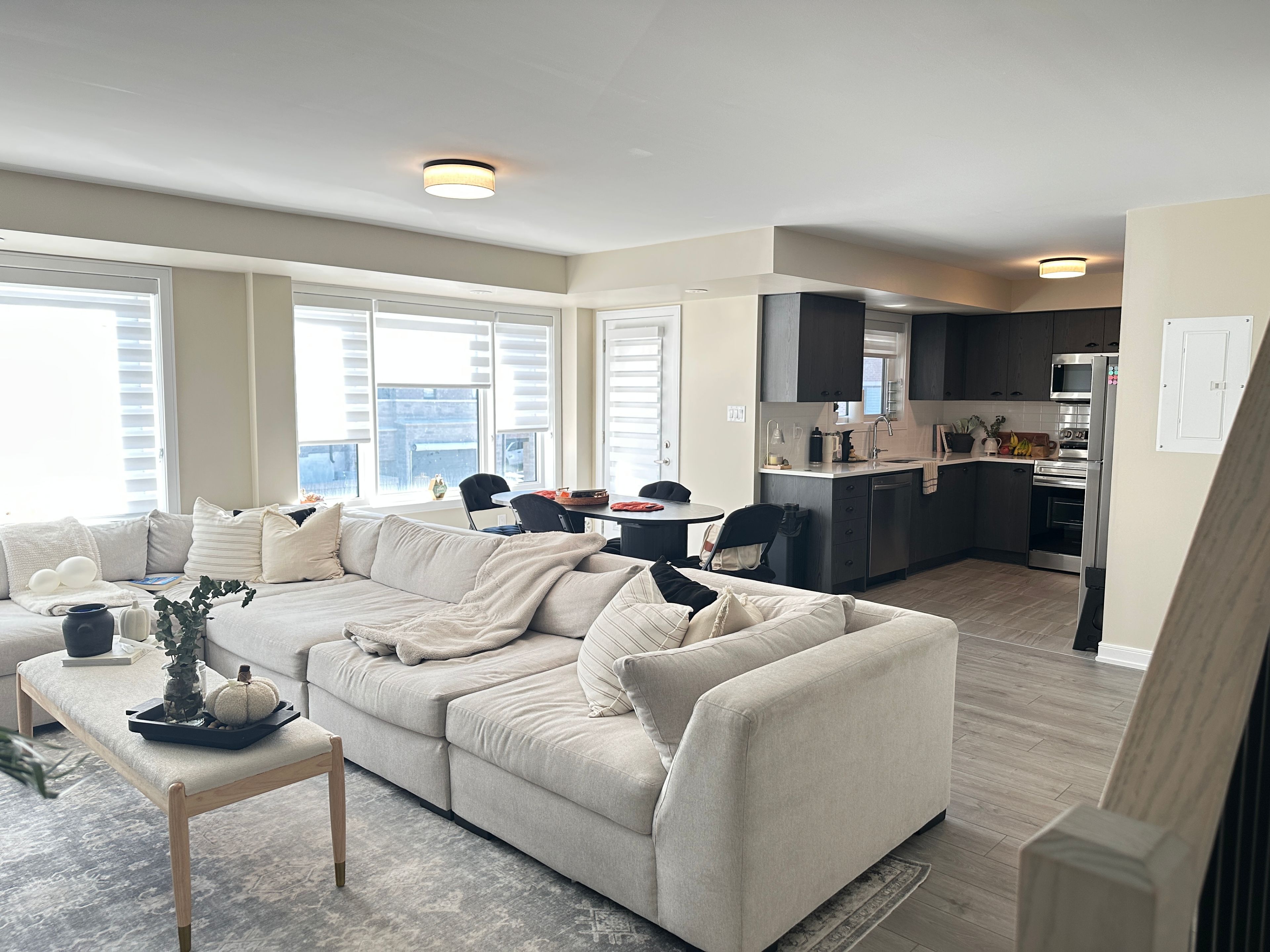 • Open-concept design with laminate floors and 9 ft ceilings throughout.