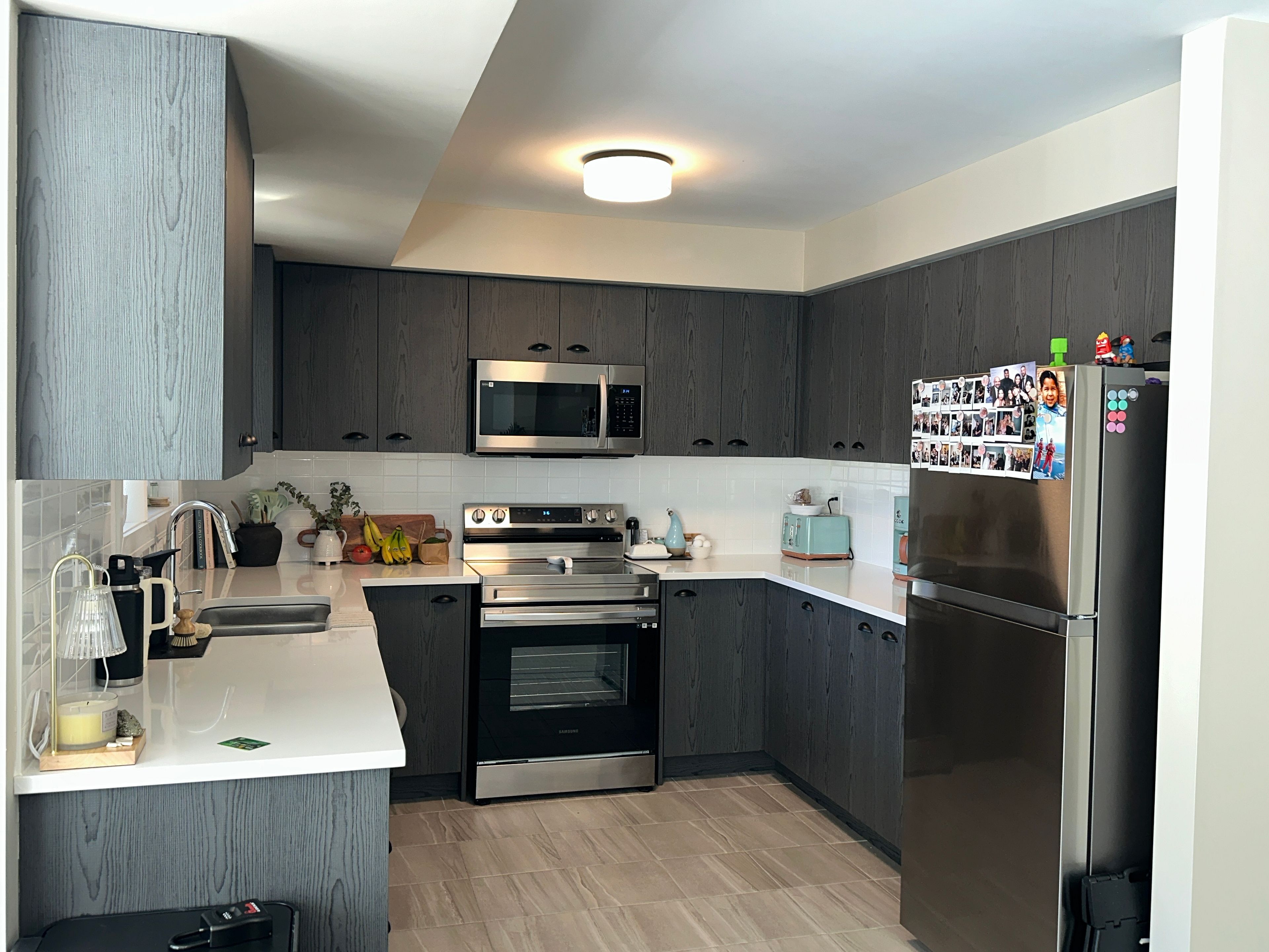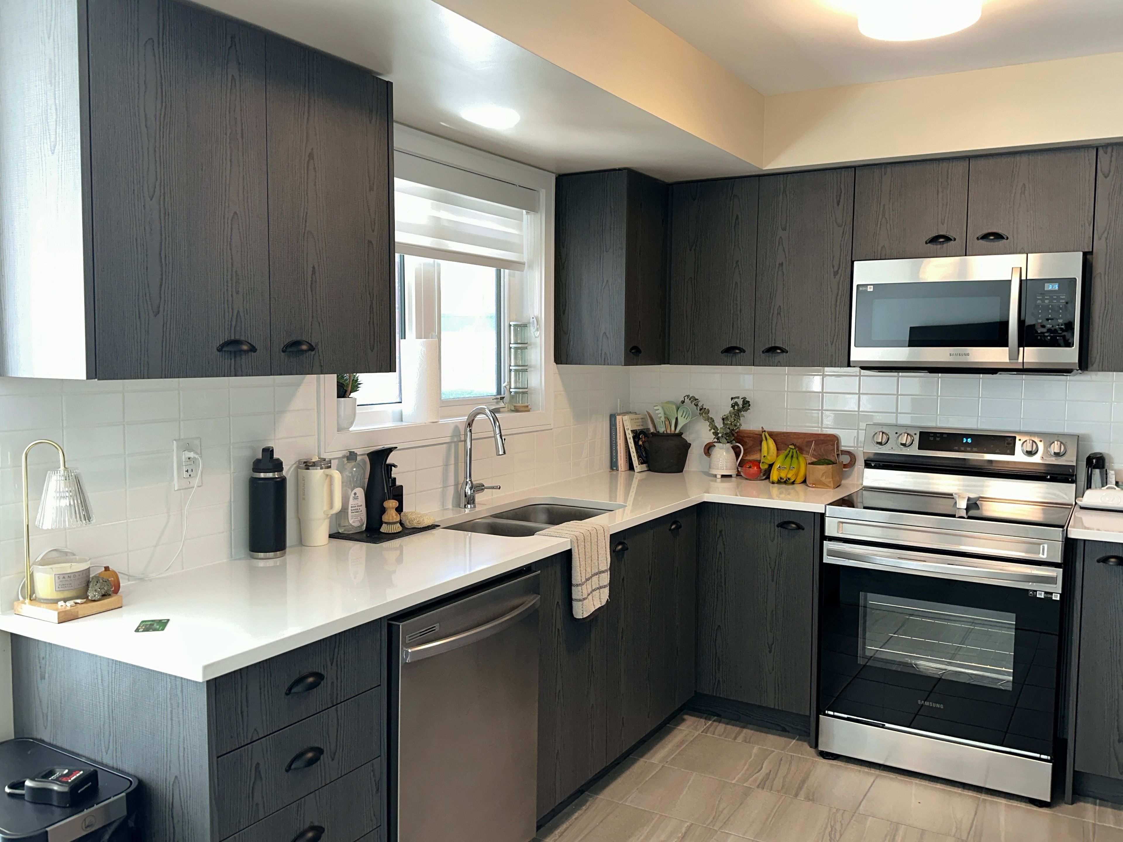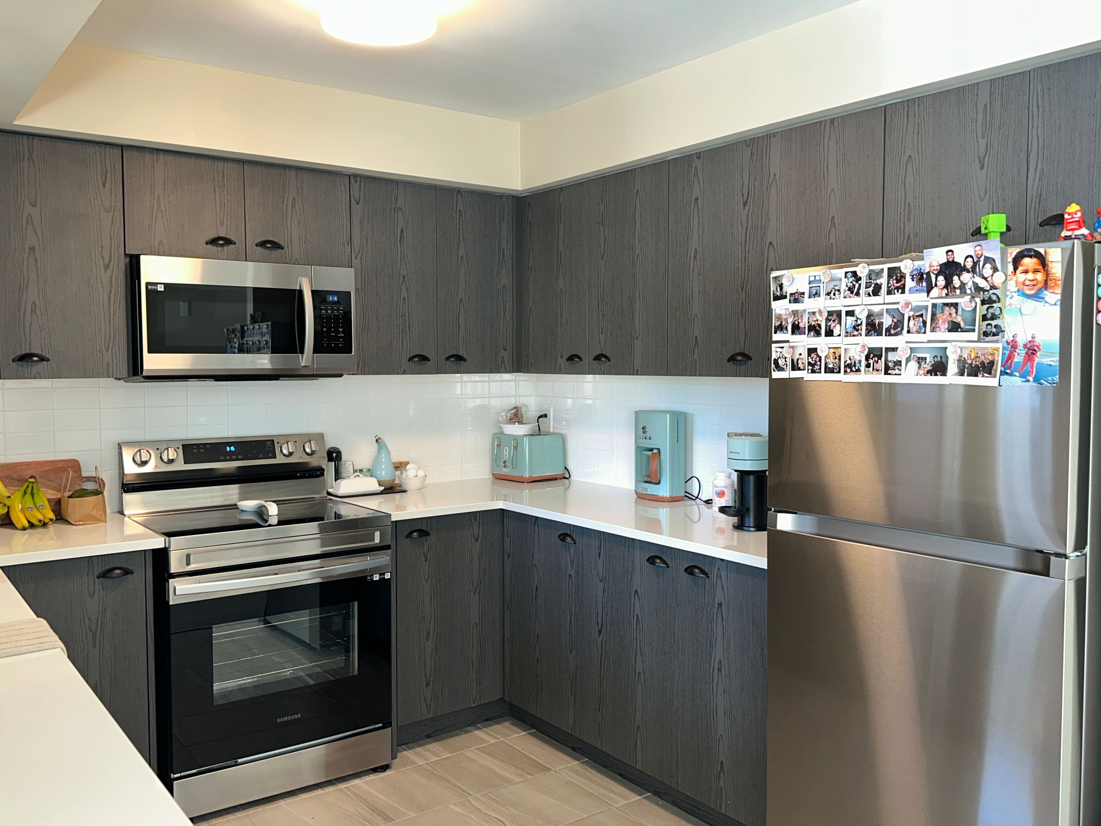 • Upgraded stainless steel appliances and quartz counters in the kitchen.