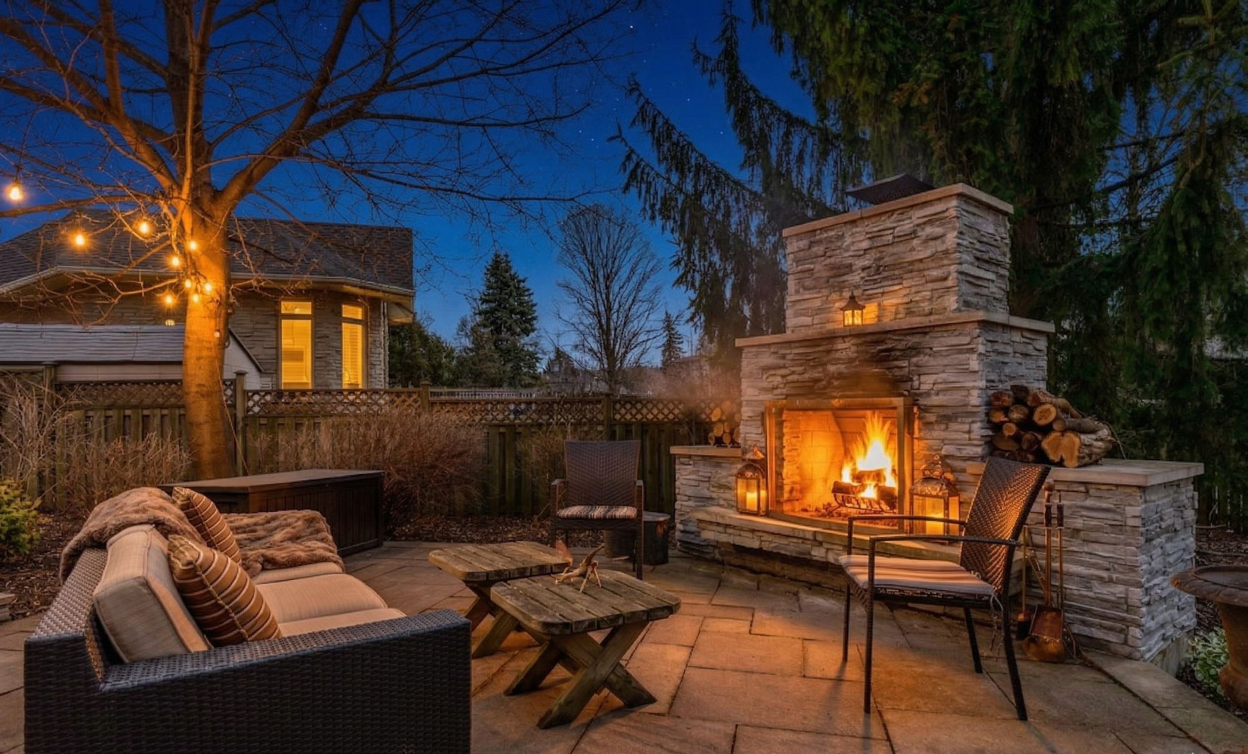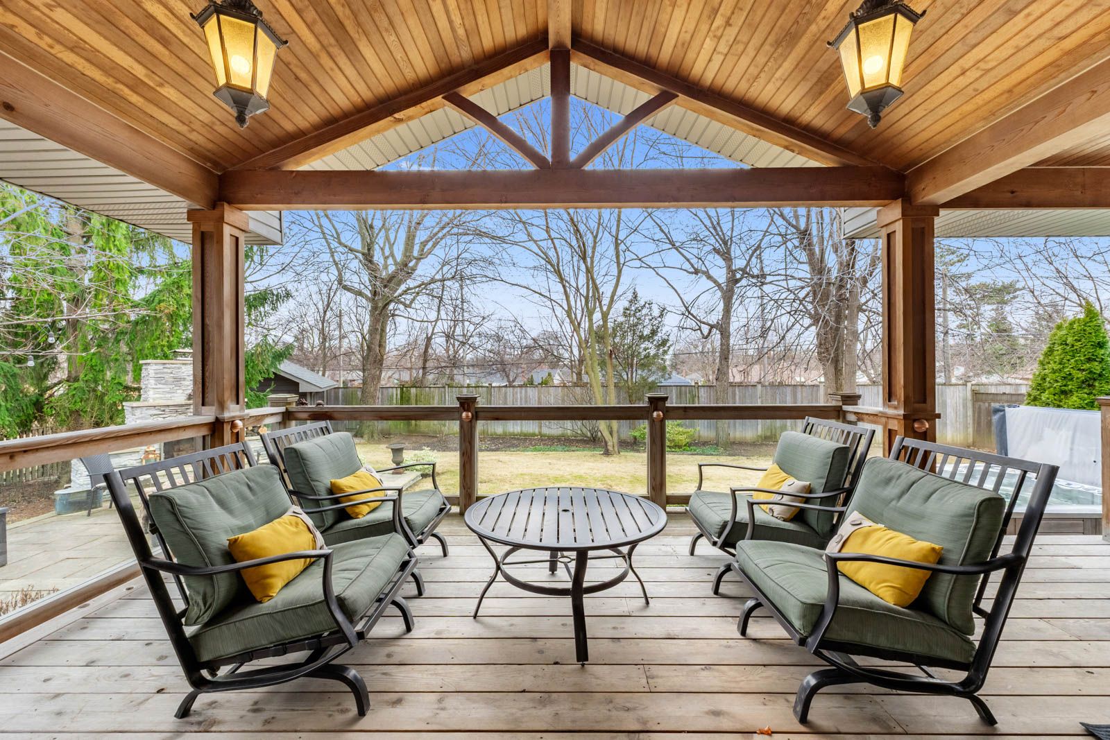 • Expansive backyard with a covered deck, hot tub, and outdoor fireplace.