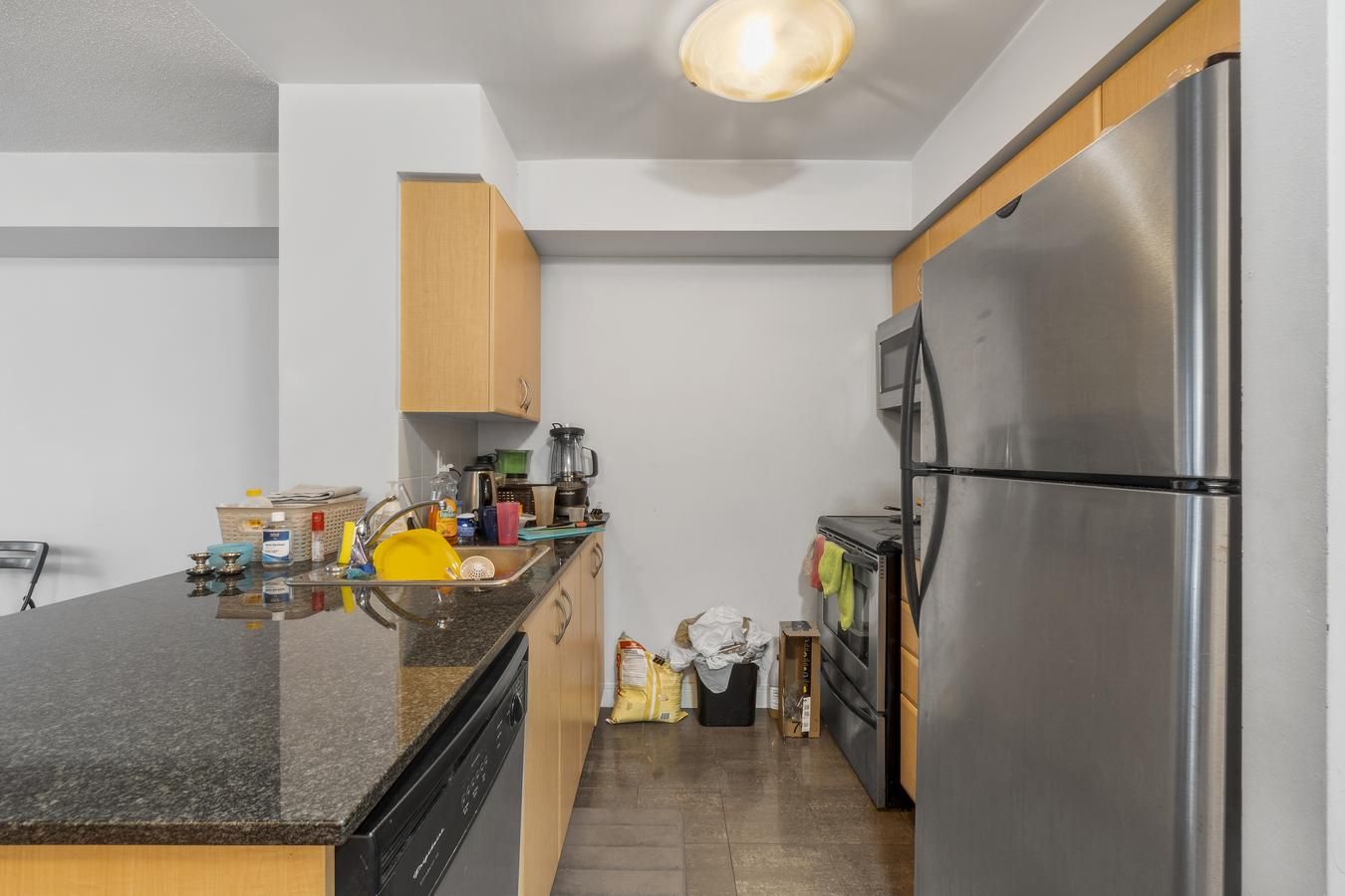 • Modern kitchen with stainless steel appliances and granite countertops.