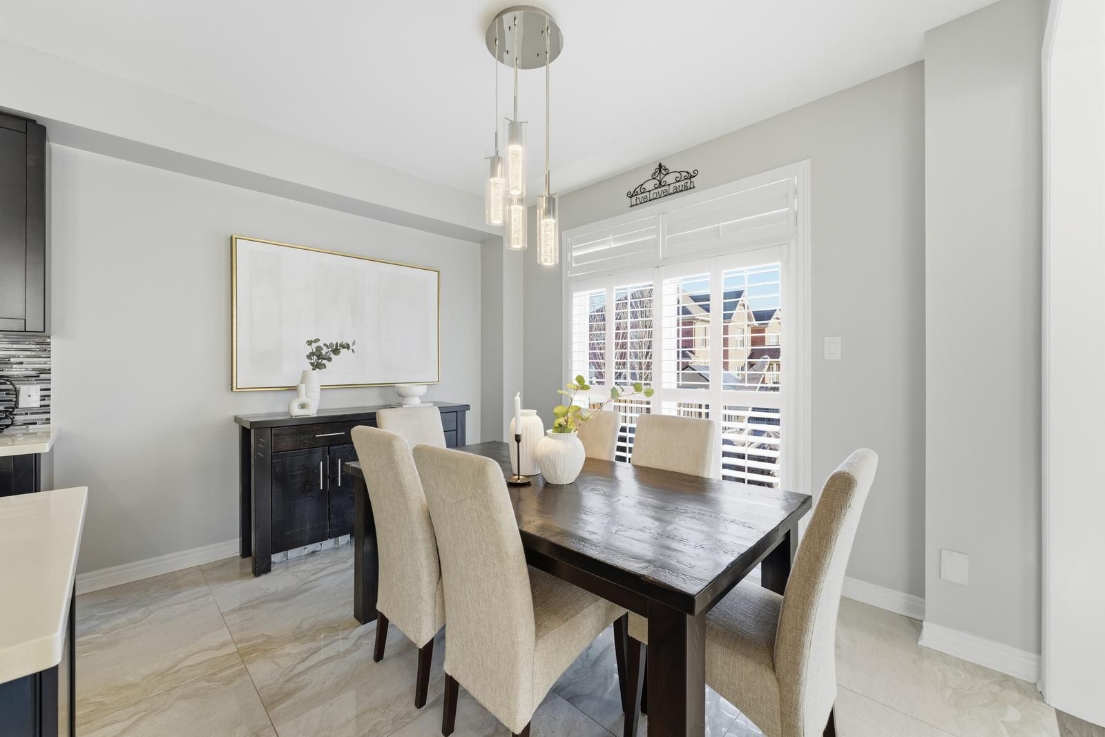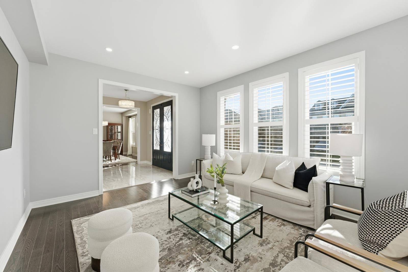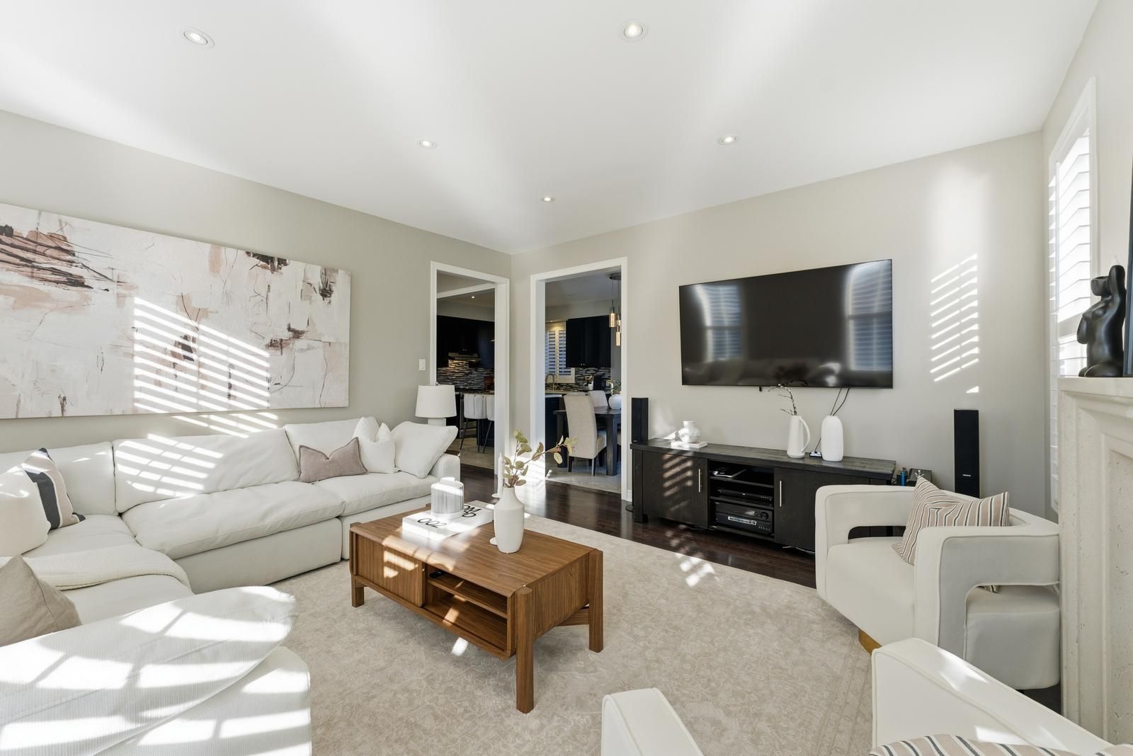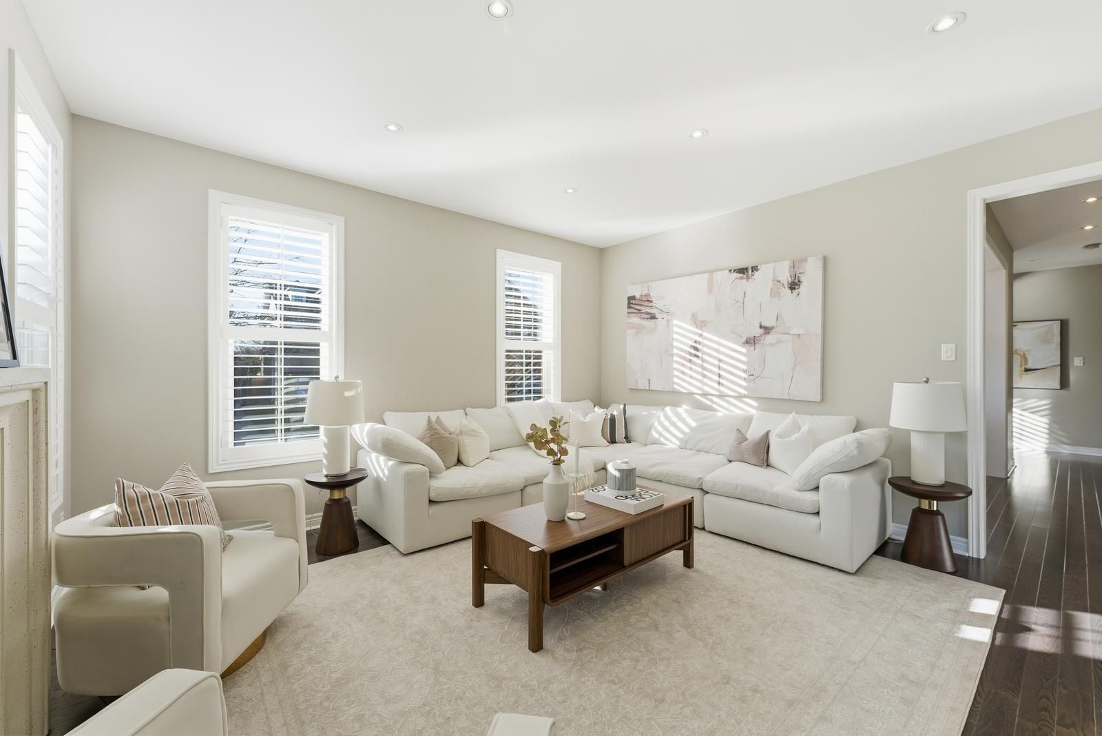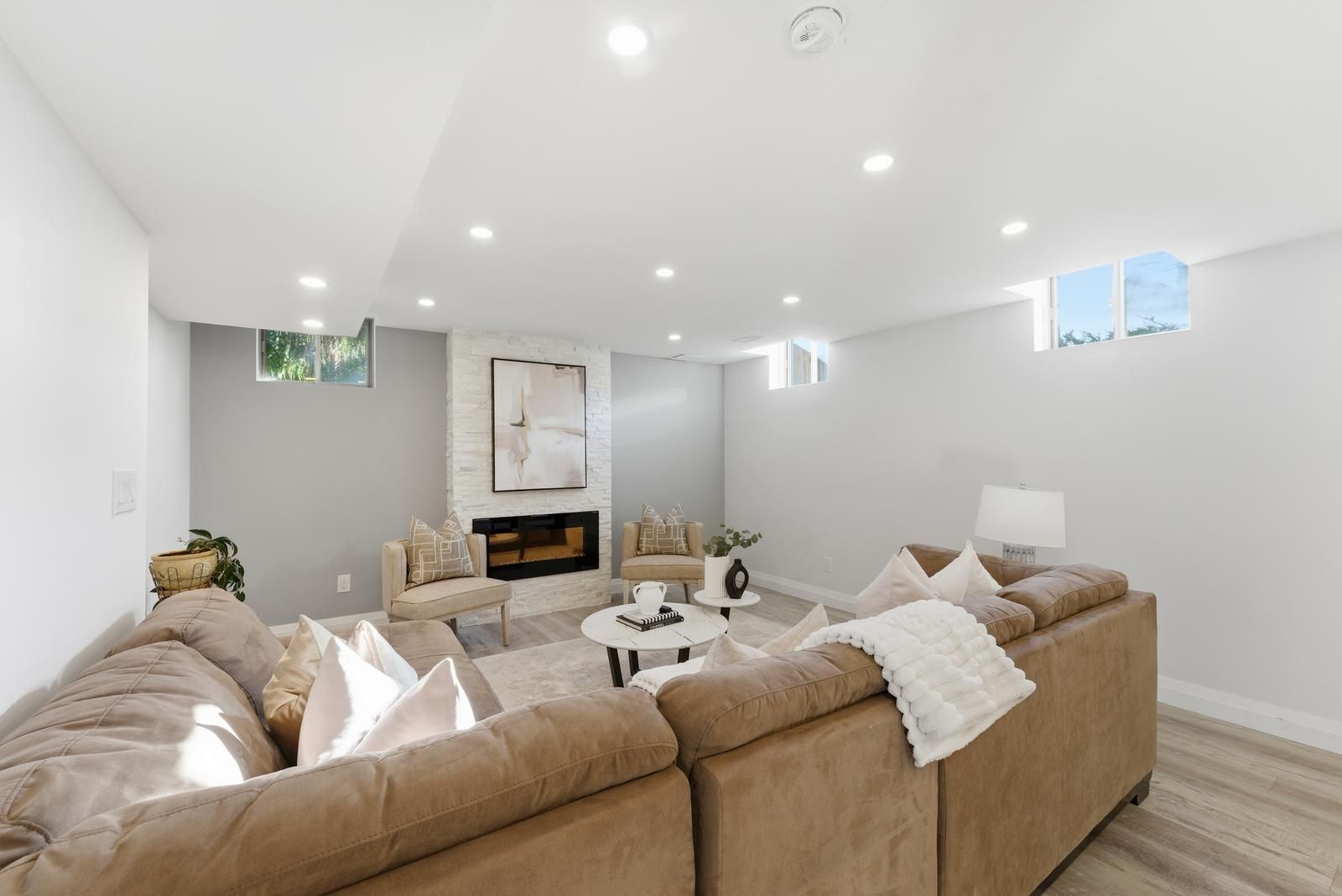 • Grand living room with gas fireplace and large windows for natural light.