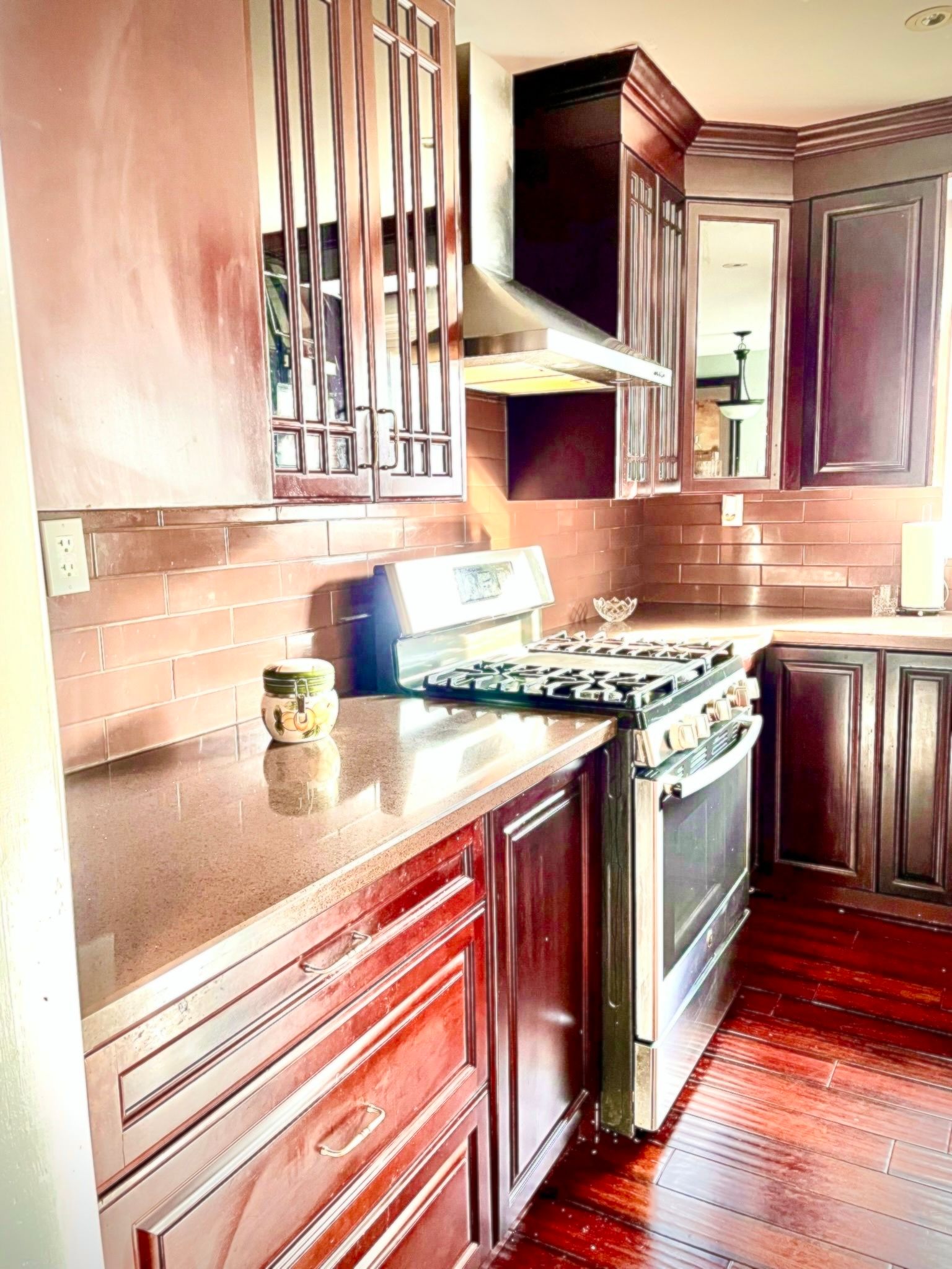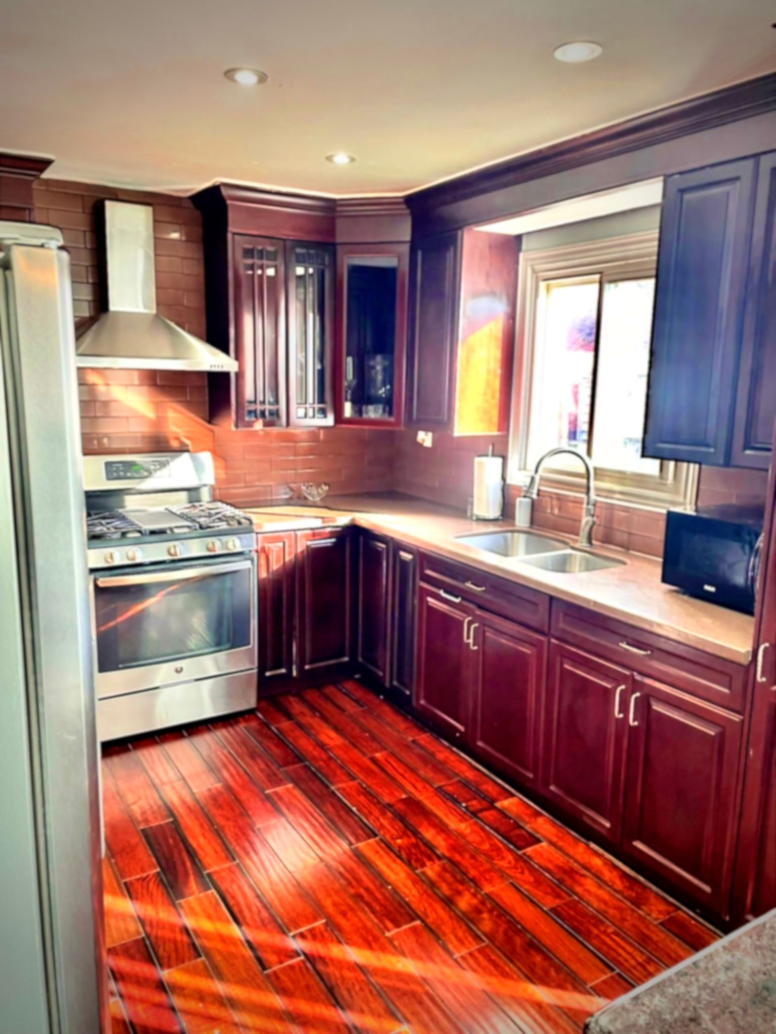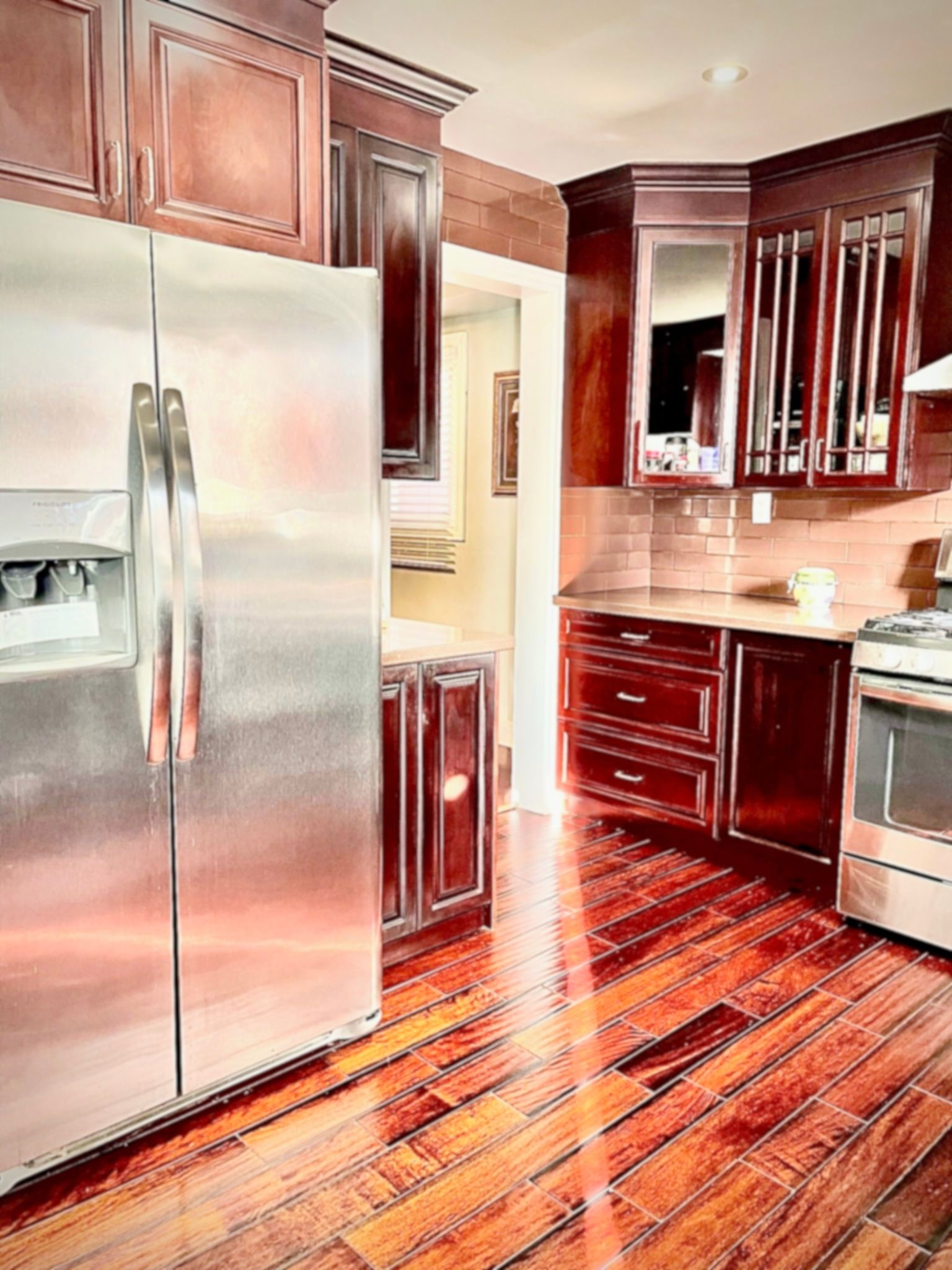 • Modern kitchen with stainless steel appliances and granite countertops.