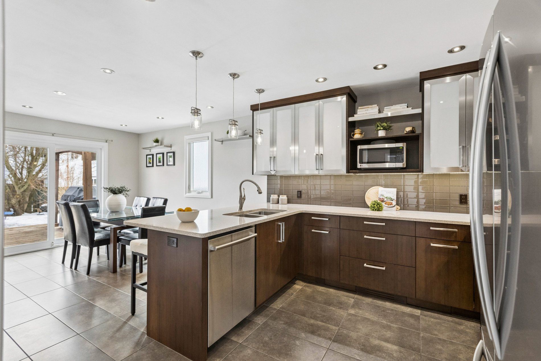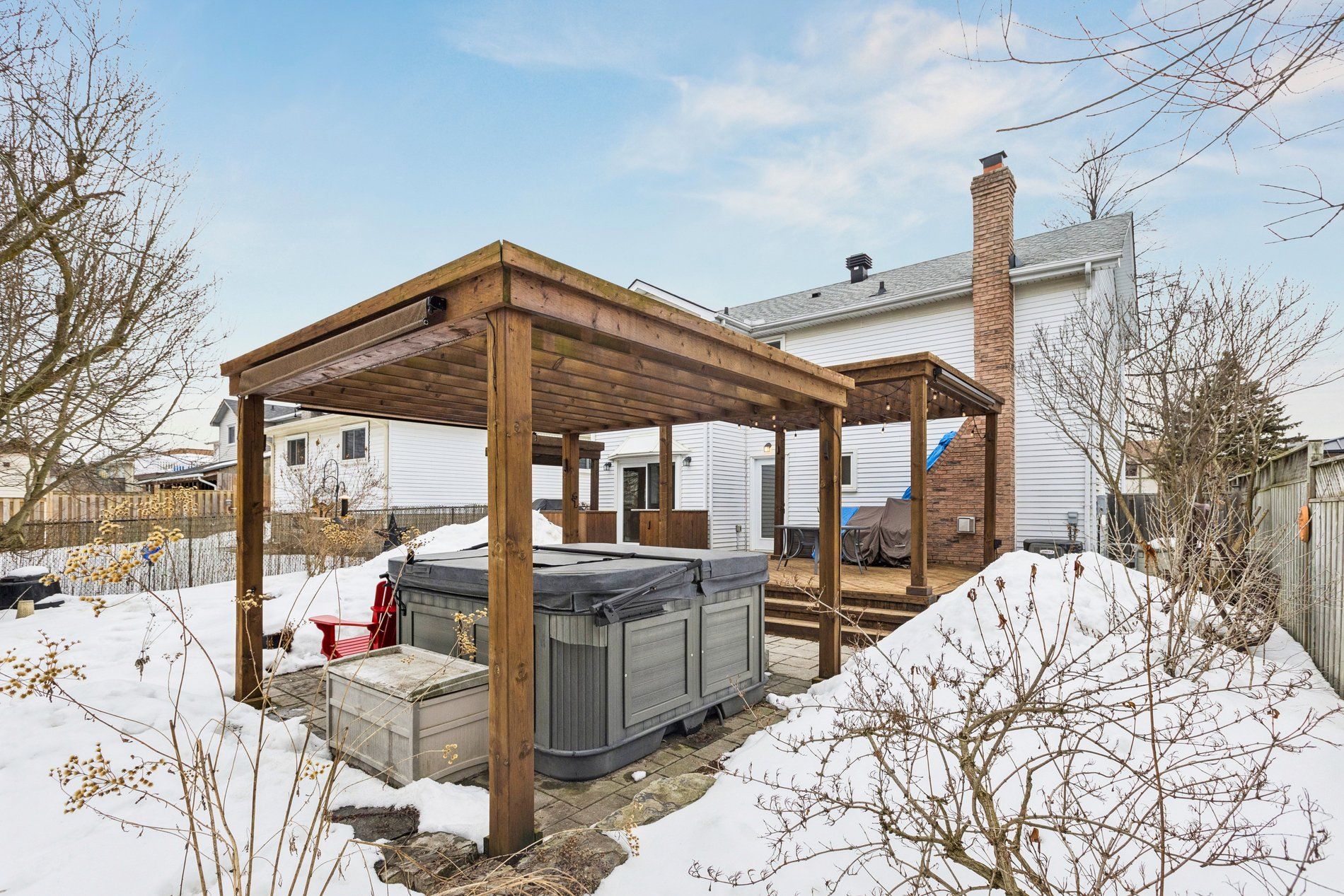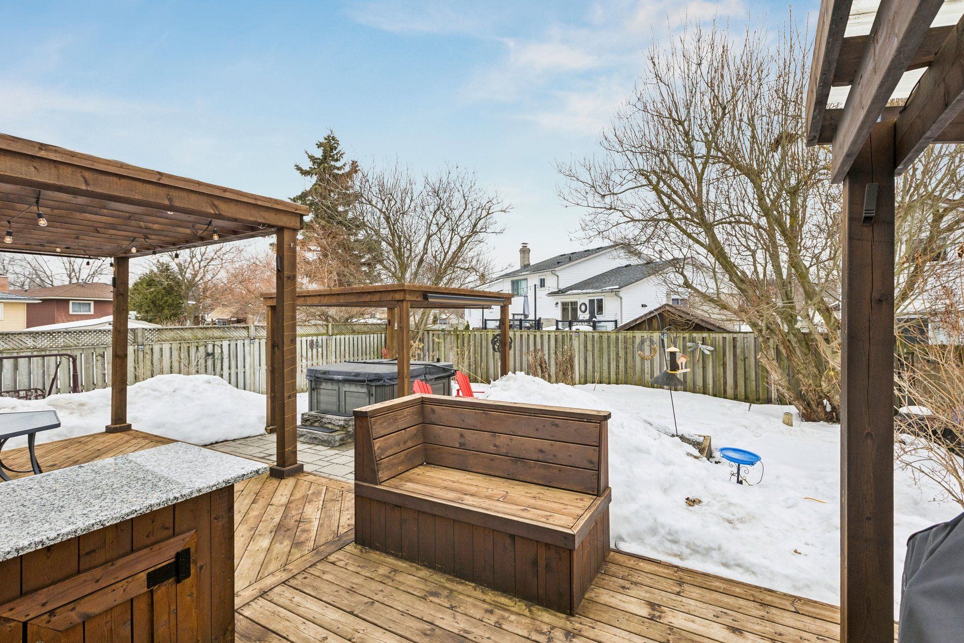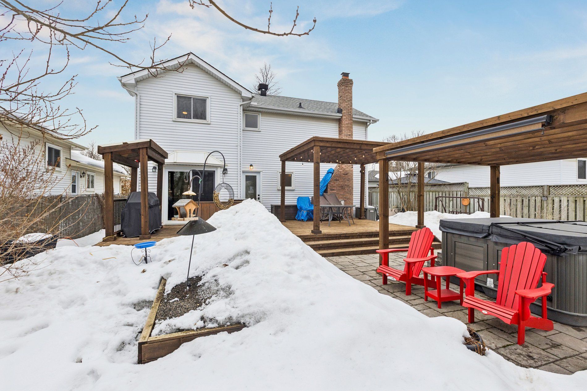 Stylish, thoughtfully updated, and completely move-in ready - this home is a standout from top to bottom. Every space has been refreshed with a cohesive, timeless design that feels both modern and warm, including updated trim and interior doors that give the home a polished finish throughout. The beautifully remodelled kitchen is as sophisticated as it is functional, featuring bamboo cabinetry, quartz countertops, stainless steel appliances, and exceptional storage - including clever kick-plate drawers that maximize every inch. A breakfast bar provides the perfect place for casual meals or entertaining, while the open-concept layout flows seamlessly into the dining area. The dining space features impressive built-in cabinetry for additional storage and display, and a walkout to the backyard deck - creating an ideal connection between indoor and outdoor living. The main floor living room is warm and inviting, anchored by a gas fireplace and complemented by rich flooring and elegant finishes that carry throughout the home. Upstairs, you'll find a spacious primary bedroom along with two additional well-appointed bedrooms. The second-level bathroom has been beautifully updated and features a stylish double vanity, modern fixtures, and finishes that match the home's refined aesthetic. The fully finished basement continues the home's thoughtful design with pocket doors that maintain openness while maximizing space. Enjoy a cozy rec room/tv area, a stylish wet bar, and a full bathroom with heated floors - adding a touch of everyday luxury. The laundry area is equipped with an energy-efficient heat pump dryer. Step outside to your private backyard retreat - expansive decking, a pergola, built-in outdoor prep station, saltwater hot tub, and beautiful perennial gardens combine to create a true outdoor oasis. Nothing to do but move in and enjoy .----> be sure to click on the multi media link to view interactive 3d tour, more photos and walk through video.