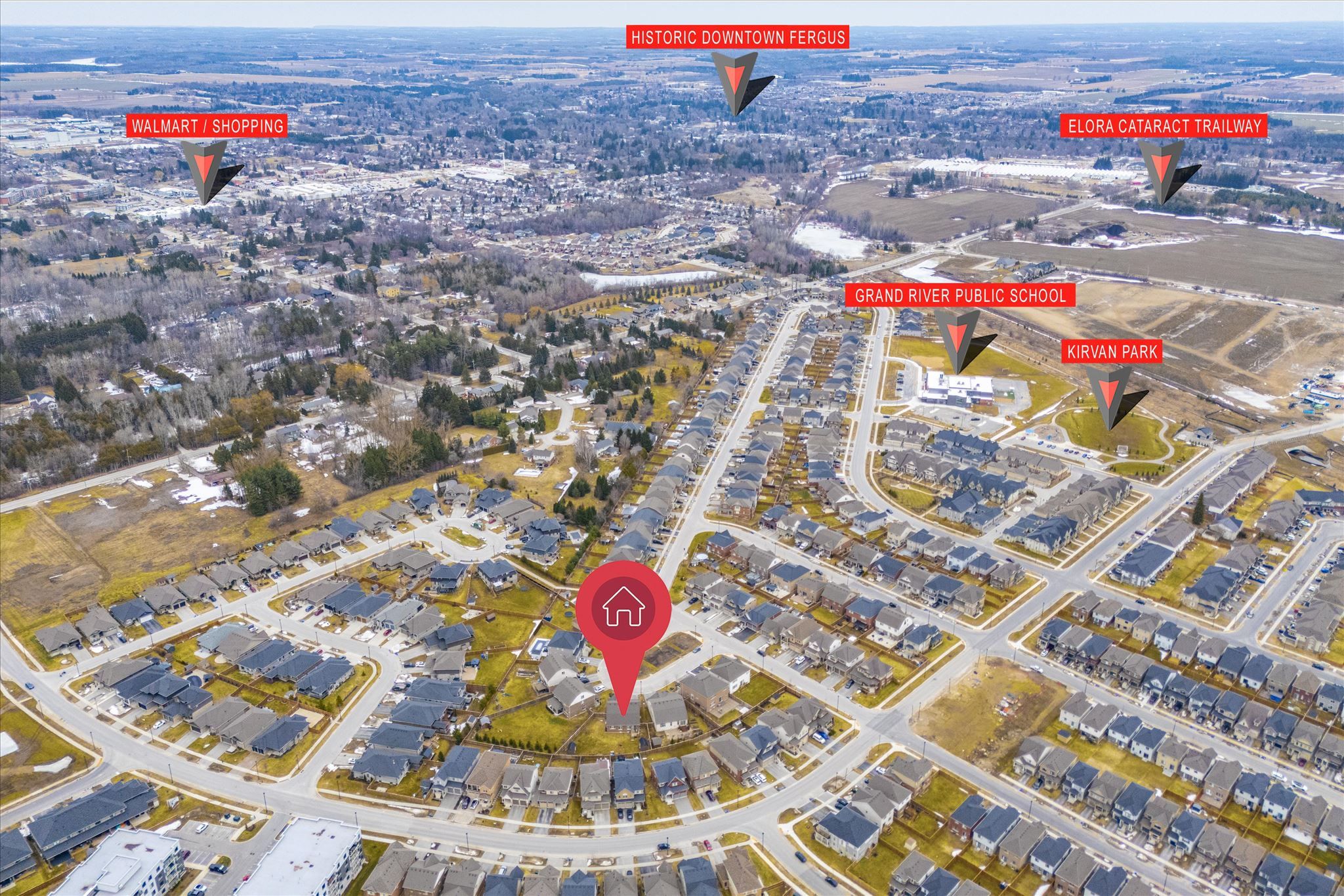 Welcome to your next chapter on one of storybrook's largest & most desirable lots. Tucked into a premium court, this luxury bungaloft offers 4,000+ sqft on a rare, pool-sized property. This 4 bed / 3 bath home is far from cookie-cutter, featuring wide plank flooring, elevated trim, recessed lighting, & california shutters throughout. Construction impresses with 10' ceilings on the main level, 9' ceilings upstairs & in the basement, and a 12' ceiling in the double garage allowing for a lift. The main living space is designed for everyday living & entertaining, with a vaulted ceiling & elegant gas fireplace as a warm focal point. The gourmet kitchen features full-height cabinetry with under-cabinet lighting, beveled-edge granite countertops, a gas range, pot filler, & a large island with bar seating overlooking the living and dining areas. Double french doors lead to the rear deck, ideal for summer bbqs. The oversized backyard offers space to garden, play, or envision your future pool oasis. The mud / laundry room blends function & style with built-in bench seating & custom storage. The main-floor primary suite is a private retreat with two walk-in closets & a spa-like 5-piece ensuite with double vanity & soaker tub. A second bedroom / den sits beside the guest powder room. Upstairs offers another 5-piece bathroom, 3rd & 4th bedrooms, plus a bright flex space. The 1,600+ sqft lower level is a blank canvas with rough-in plumbing for a future bathroom-ideal for a gym, media room, or in-law suite. Located in a family-friendly neighbourhood, you're steps from kirvan park and grand river public school, with trails to elora, downtown fergus shops & restaurants, and nearby amenities including the new hospital. You won't find another home in storybrook (or fergus) with this lot size, layout, and level of finish. This is the perfect canvas for your next chapter!