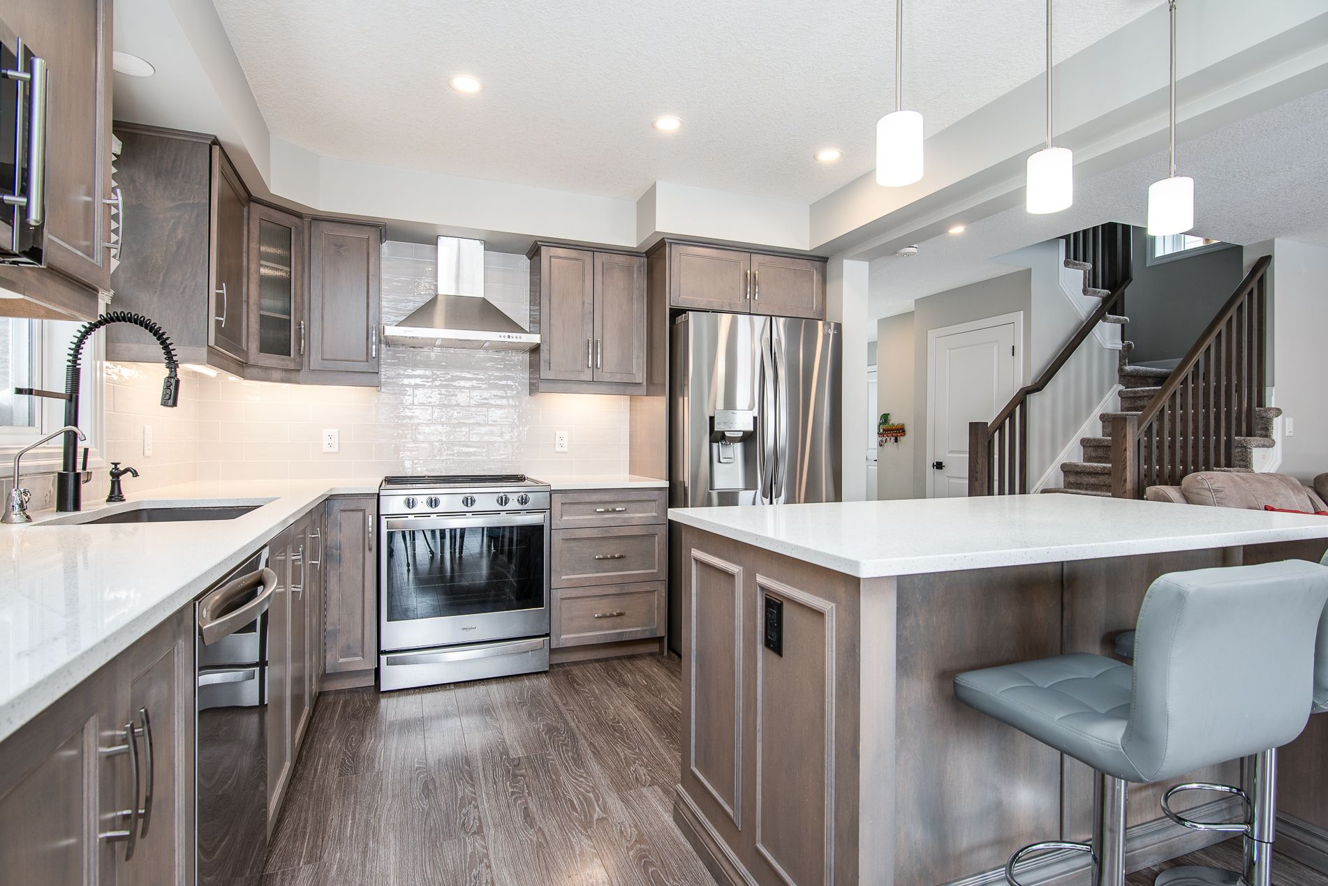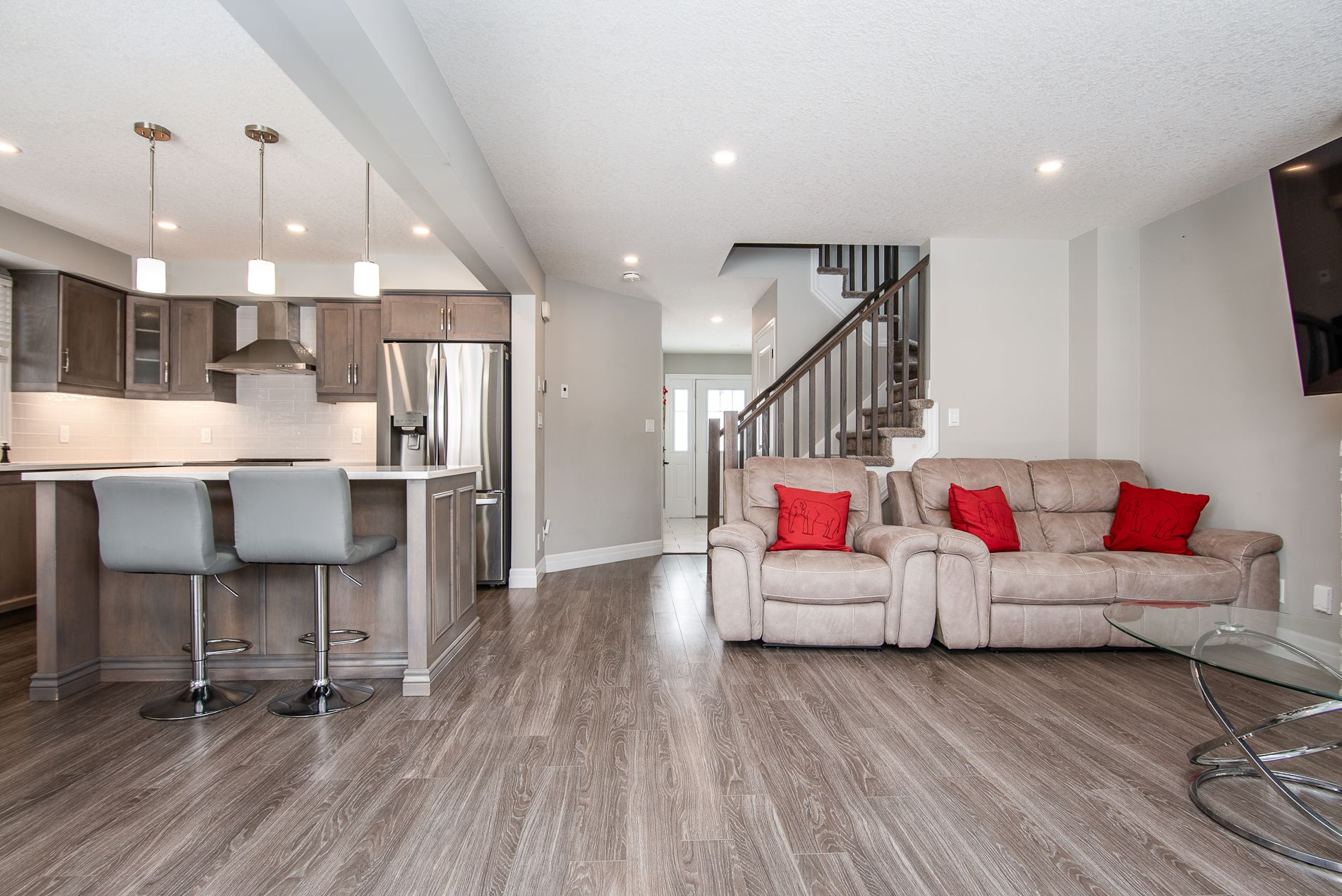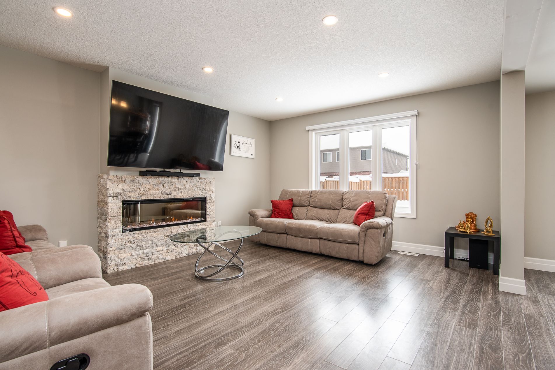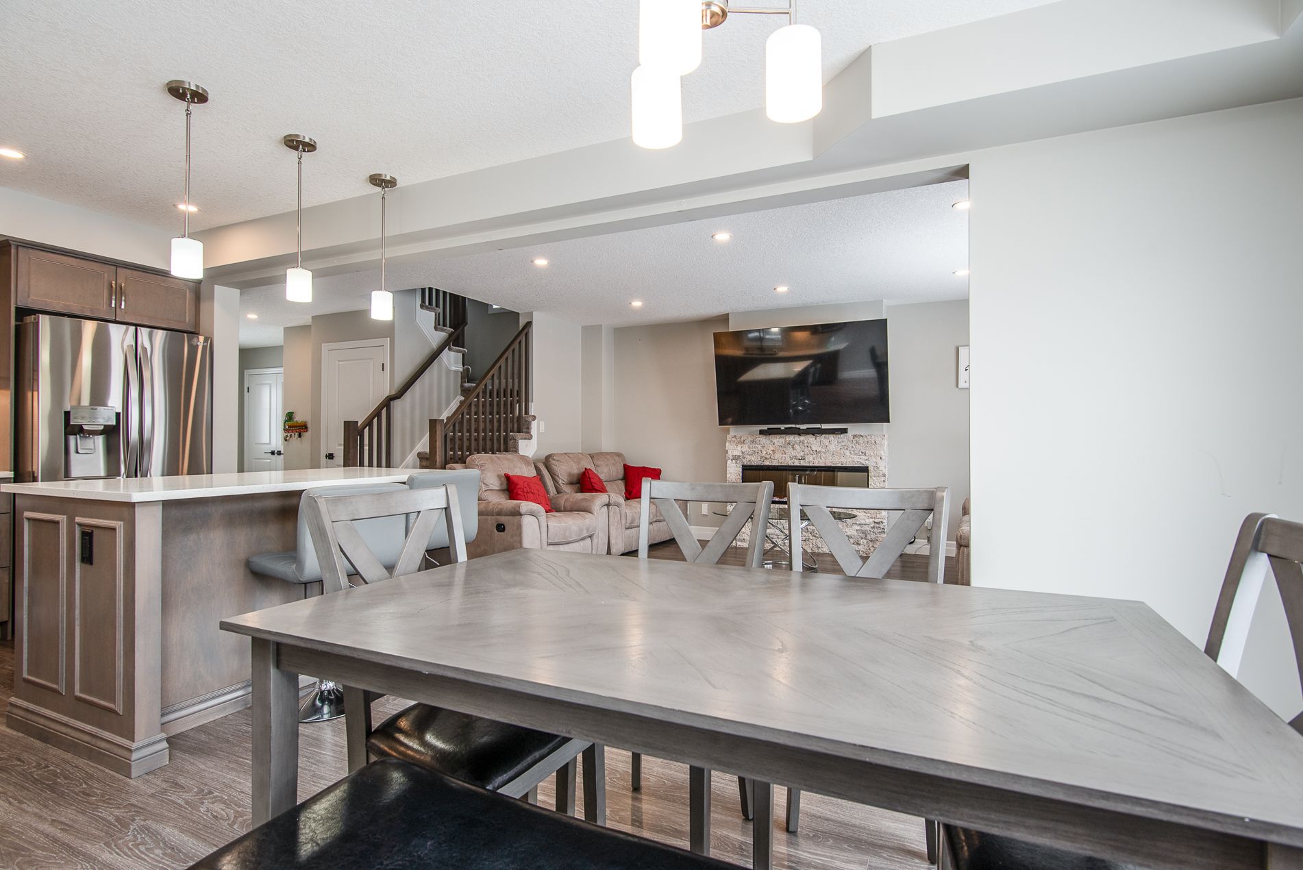 This beautiful, immaculate 5-year-old, 1,630 sq. Ft. Family home is located in a highly desirable neighbourhood. The main floor features a bright open-concept layout with an abundance of windows that flood the home with natural light. The family room showcases an electric fireplace surrounded by elegant stonework, creating a warm and inviting space. The kitchen offers a spacious island, ample upgraded cabinetry, quartz countertops, stainless-steel appliances, and a sliding door with walk-out to the fully fenced backyard. The main floor also includes a powder room, a generously sized dining/living area, and a large number of upgraded pot lights throughout . Upstairs, you will find three spacious bedrooms, including a primary bedroom with a large closet and a 3-piece ensuite featuring an upgraded glass shower door. A second 4-piece bathroom completes the upper level. This lovely residence offers numerous upgrades, including: subway tile backsplash, extended kitchen cabinetry, brushed cabinet hardware, blanco kitchen sink, soft-close drawers, additional pot lights, steel range hood, laminate flooring, black faucets throughout, upgraded bathroom and foyer tiles, railings and plush shag carpeting, black shower heads and door handles, two bidets, water line to fridge, built-in soap dispenser, owned water softener, water purification and water heater system. The large basement features oversized windows and a bathroom rough-in, offering endless possibilities for future development. Additional highlights include a large garage, very generous concrete driveway, concreate sidewalk all the way to the backyard and patio -2025 plus heat pump that acts like a heat and central air. . Conveniently located close to a community center, farmers' market, public transit, schools, and shopping. Flexible closing