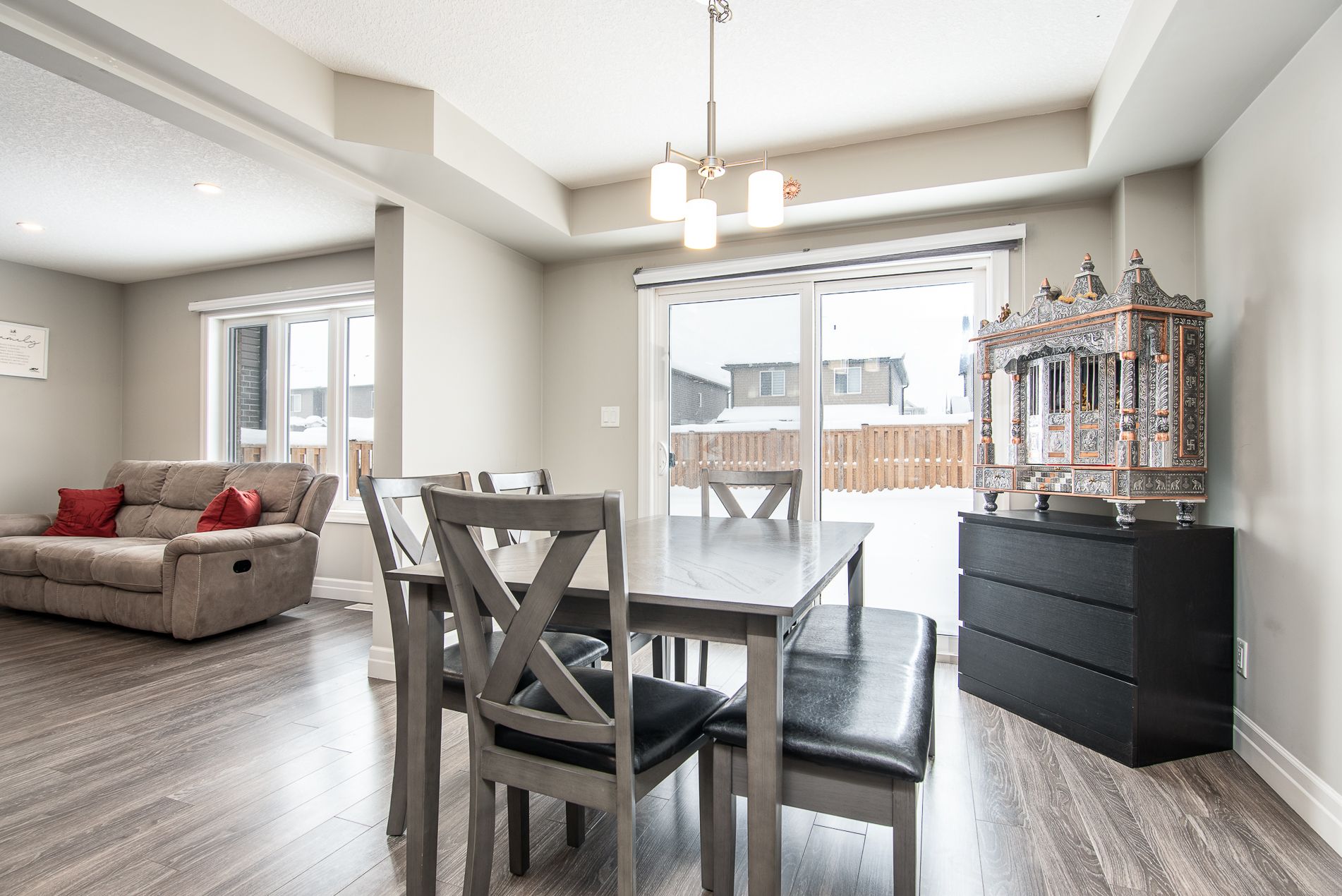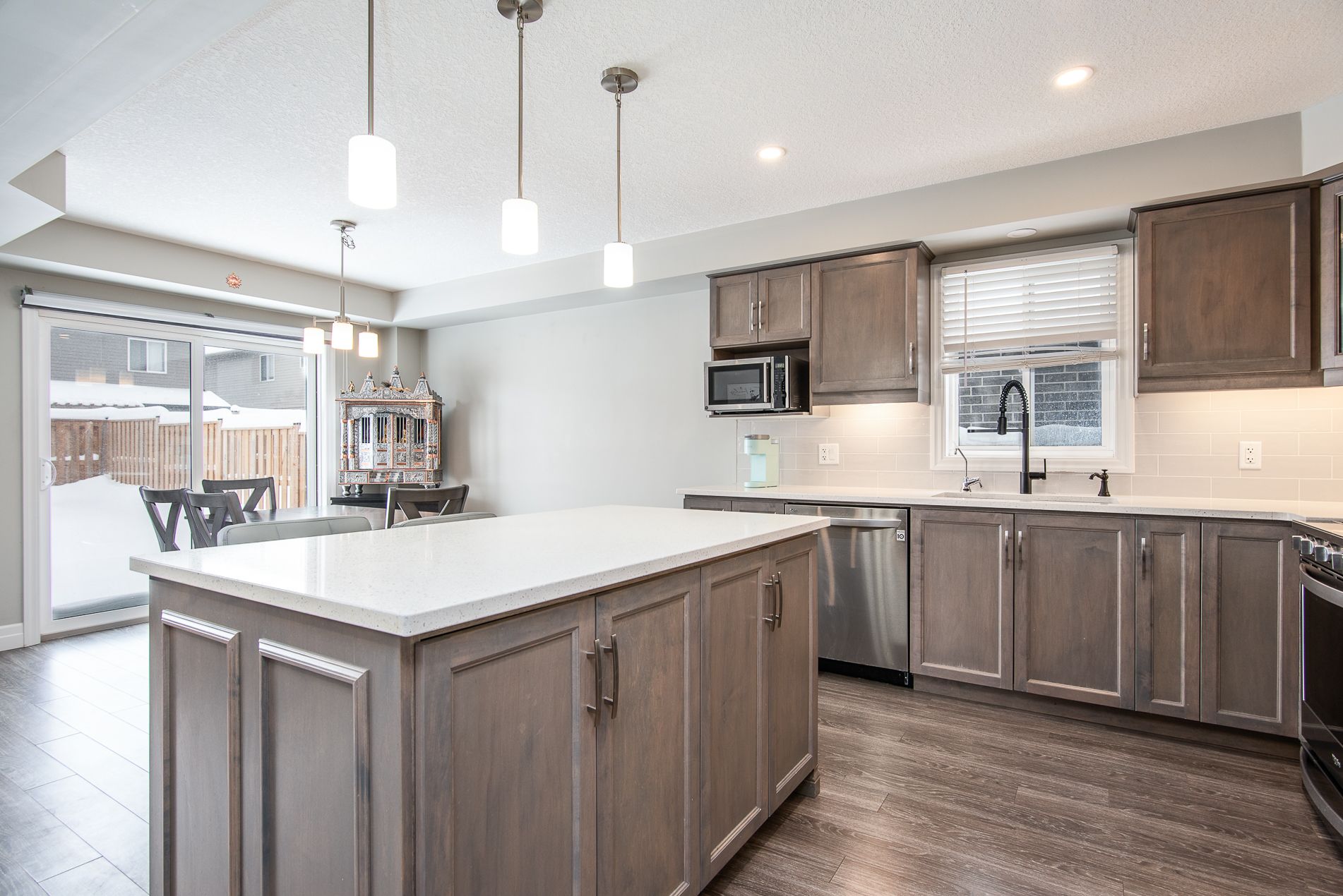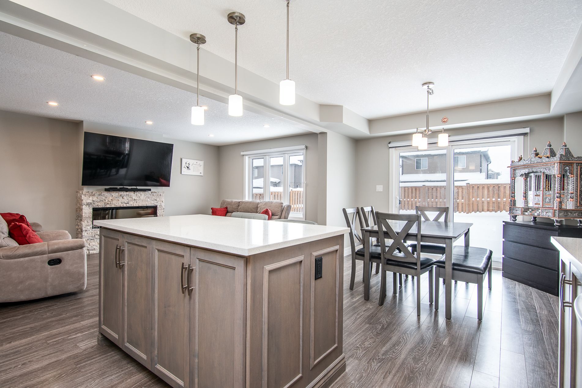 This beautiful, immaculate 5-year-old, 1,630 sq. Ft. Family home is located in a highly desirable neighbourhood. The main floor features a bright open-concept layout with an abundance of windows that flood the home with natural light. The family room showcases an electric fireplace surrounded by elegant stonework, creating a warm and inviting space. The kitchen offers a spacious island, ample upgraded cabinetry, quartz countertops, stainless-steel appliances, and a sliding door with walk-out to the fully fenced backyard. The main floor also includes a powder room, a generously sized dining/living area, and a large number of upgraded pot lights throughout . Upstairs, you will find three spacious bedrooms, including a primary bedroom with a large closet and a 3-piece ensuite featuring an upgraded glass shower door. A second 4-piece bathroom completes the upper level. This lovely residence offers numerous upgrades, including: subway tile backsplash, extended kitchen cabinetry, brushed cabinet hardware, blanco kitchen sink, soft-close drawers, additional pot lights, steel range hood, laminate flooring, black faucets throughout, upgraded bathroom and foyer tiles, railings and plush shag carpeting, black shower heads and door handles, two bidets, water line to fridge, built-in soap dispenser, owned water softener, water purification and water heater system. The large basement features oversized windows and a bathroom rough-in, offering endless possibilities for future development. Additional highlights include a large garage, very generous concrete driveway, concreate sidewalk all the way to the backyard and patio -2025 plus heat pump that acts like a heat and central air. . Conveniently located close to a community center, farmers' market, public transit, schools, and shopping. Flexible closing