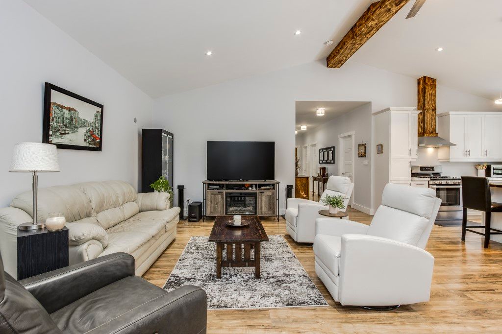 • Bright open-concept design with a vaulted ceiling and generous kitchen island.