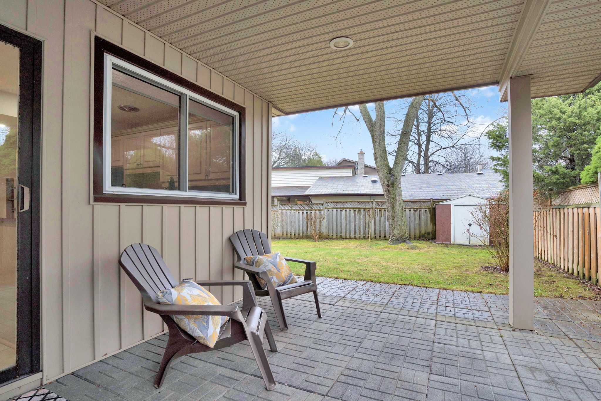 • Private fenced backyard with a covered patio, perfect for relaxing outdoors.