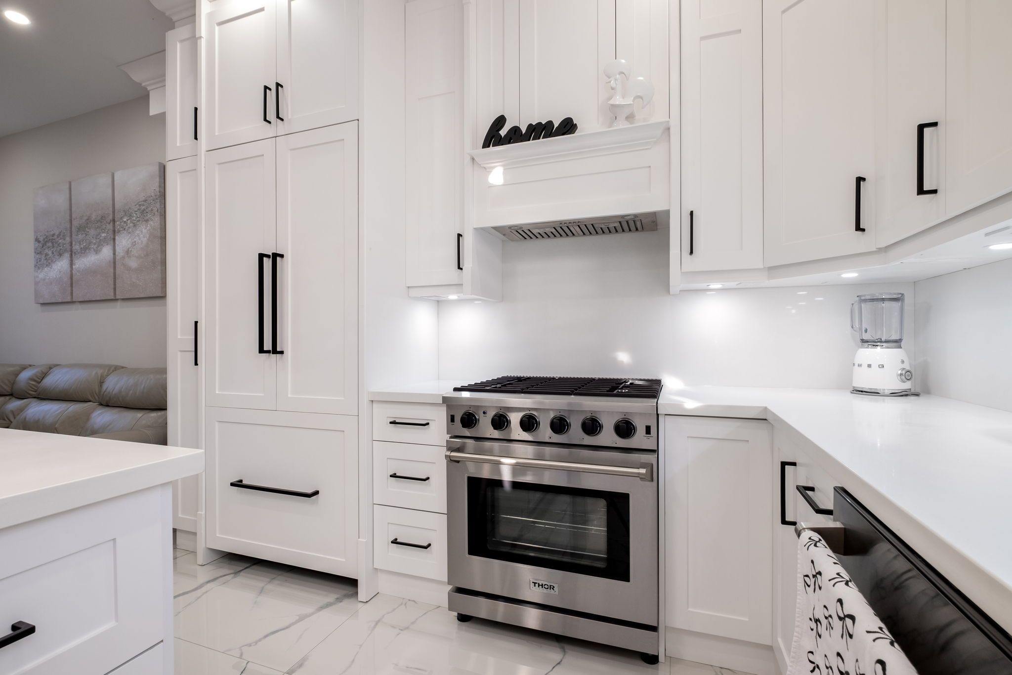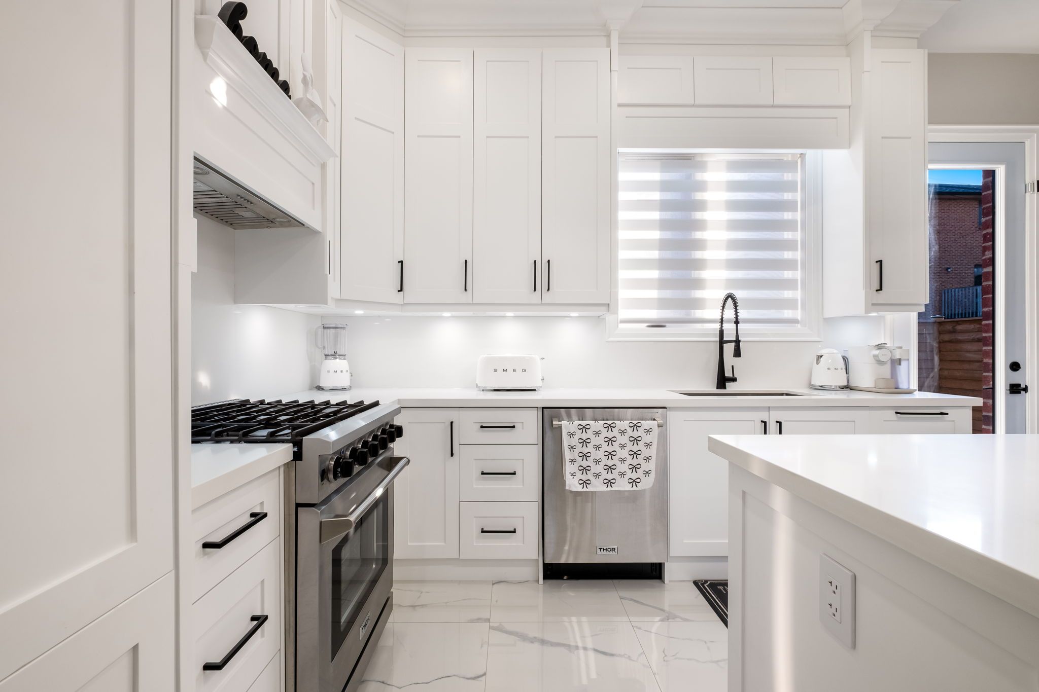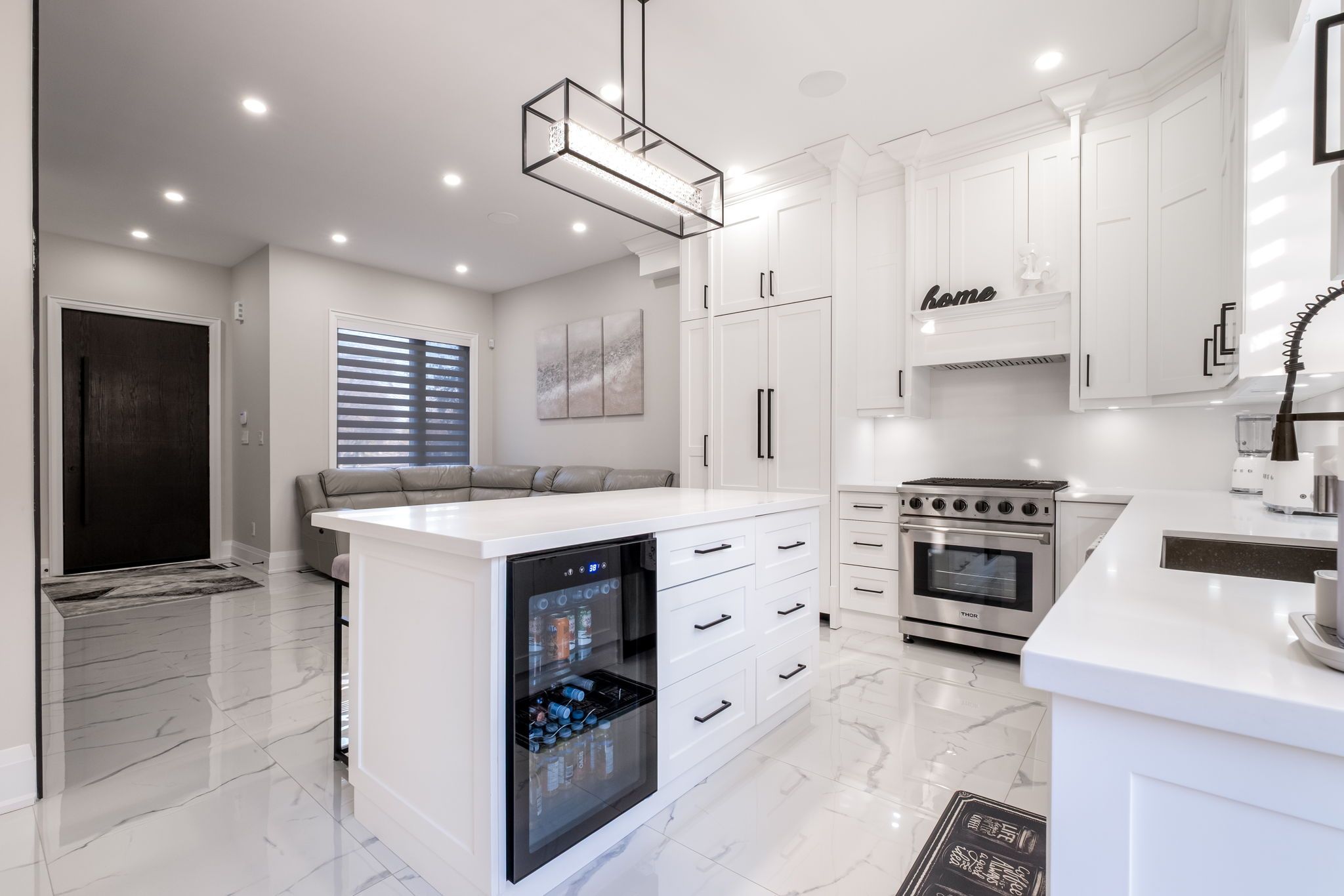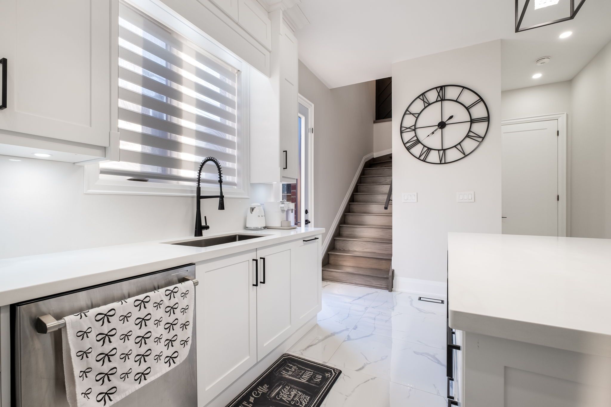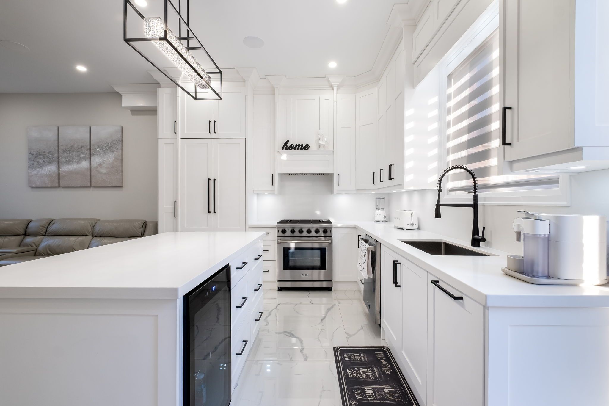 • Modern kitchen features built-in appliances and a touchless faucet.