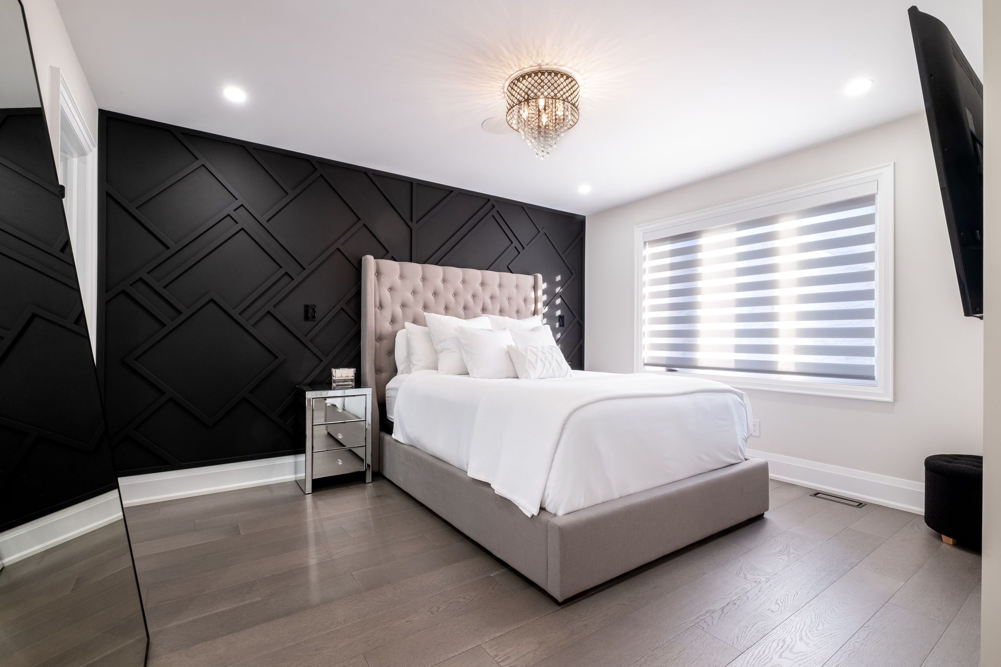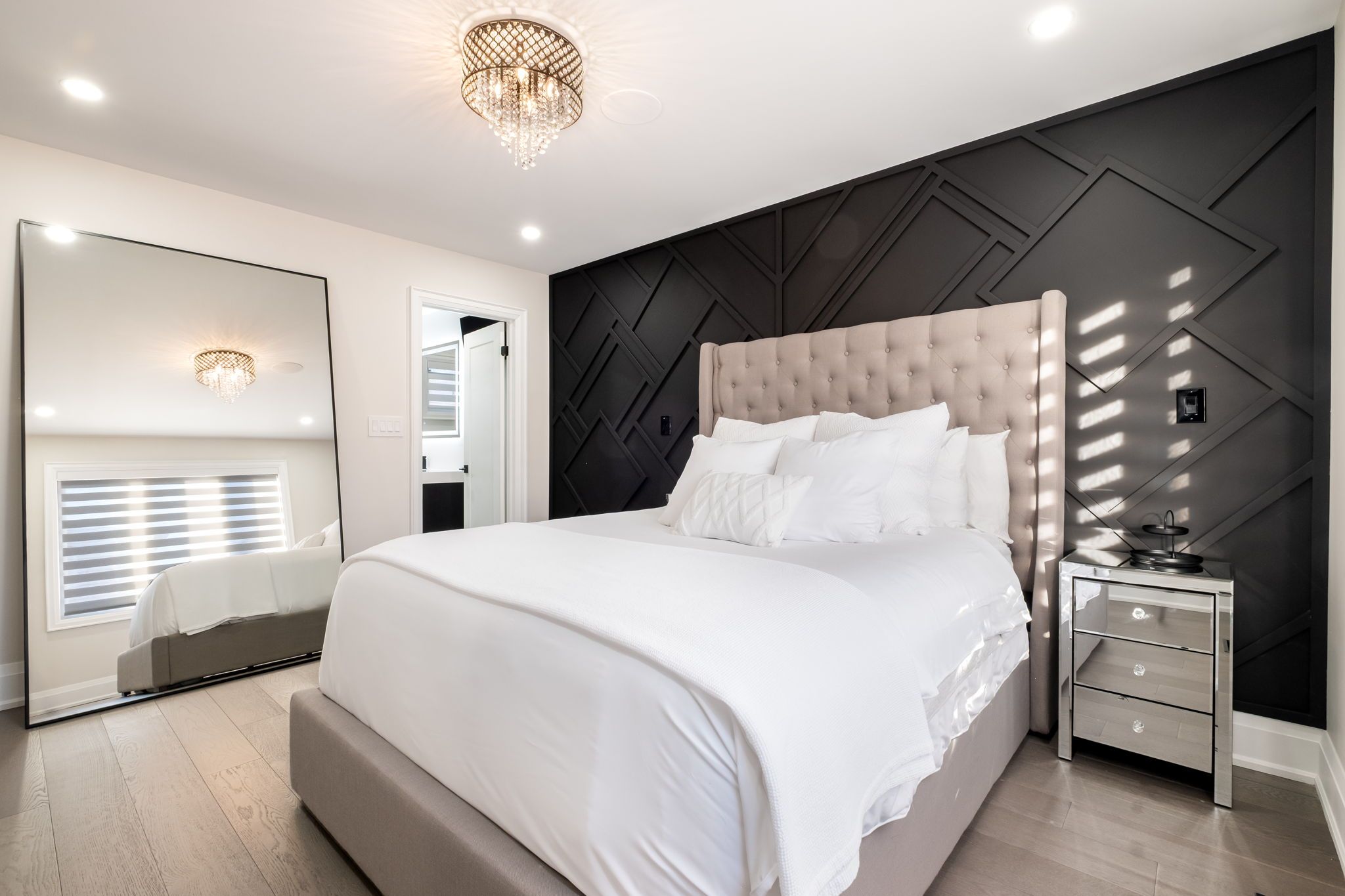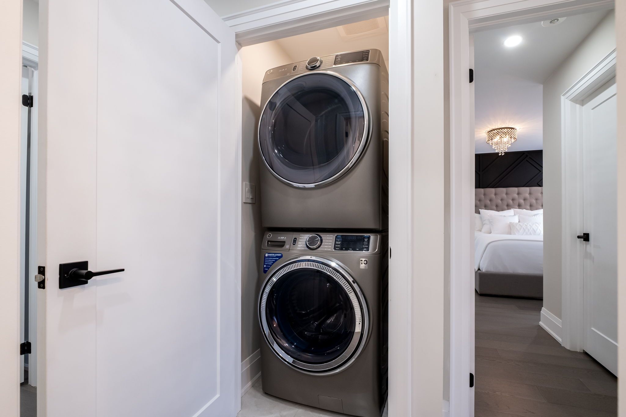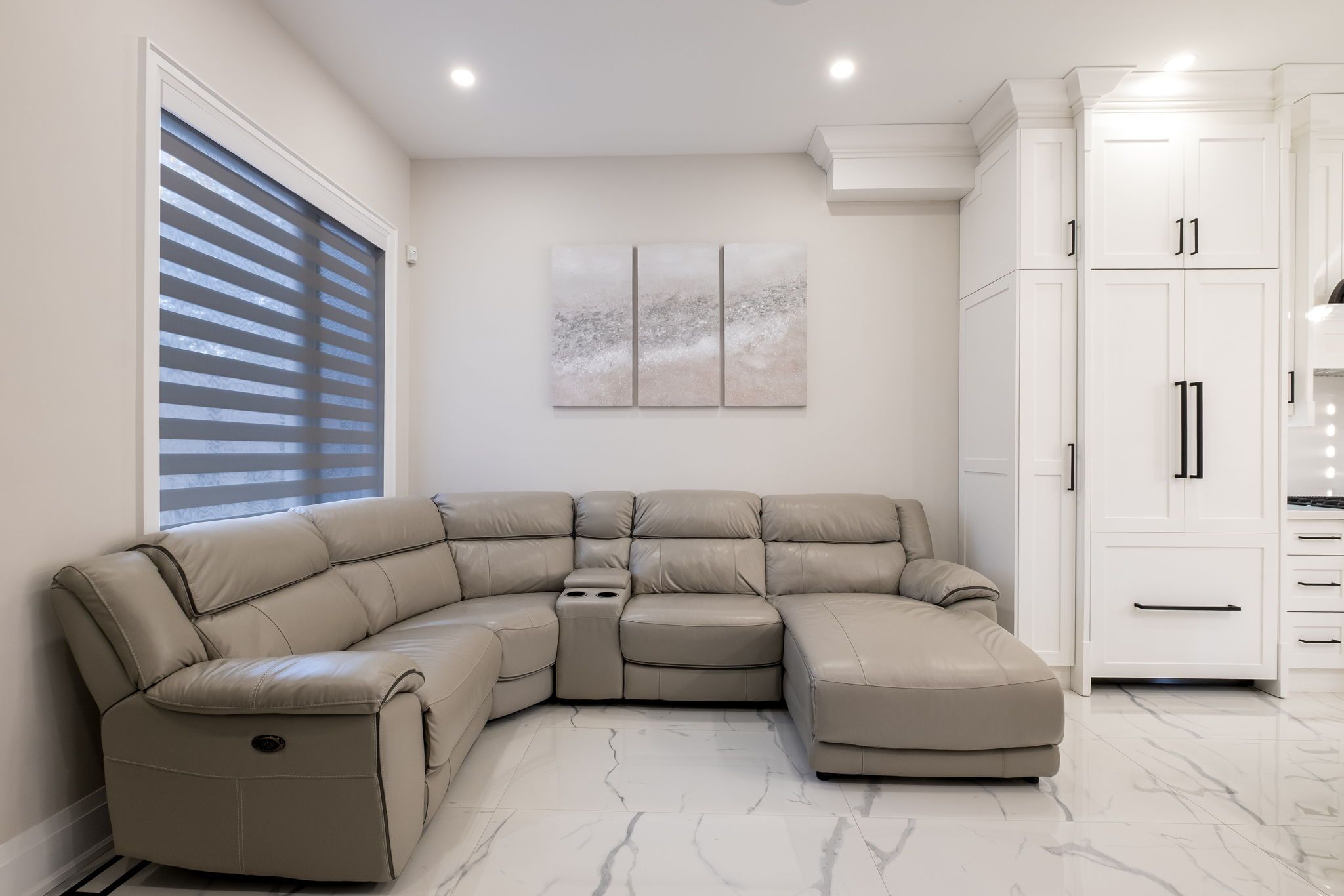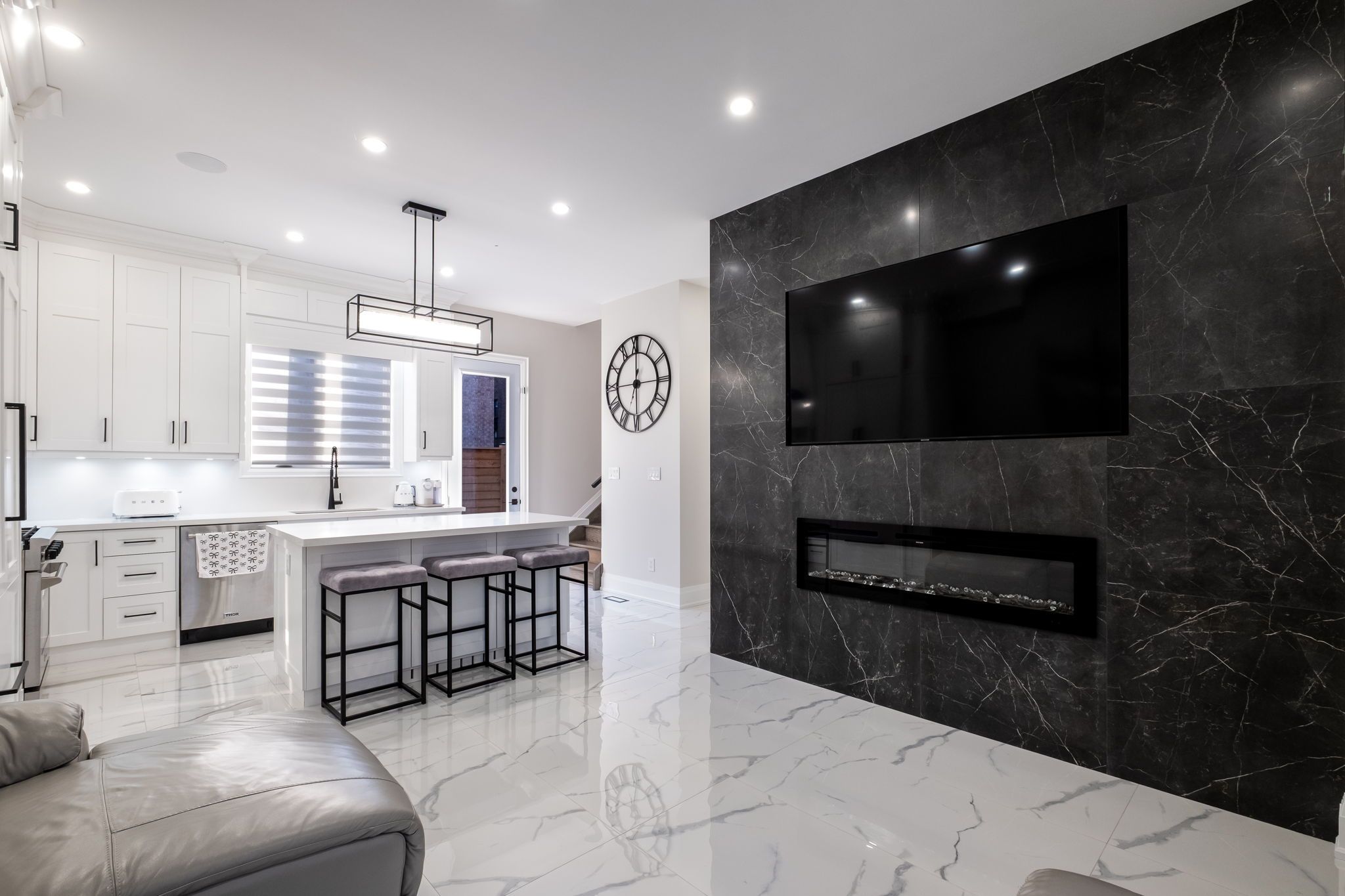 • Modern kitchen features built-in appliances and a touchless faucet.