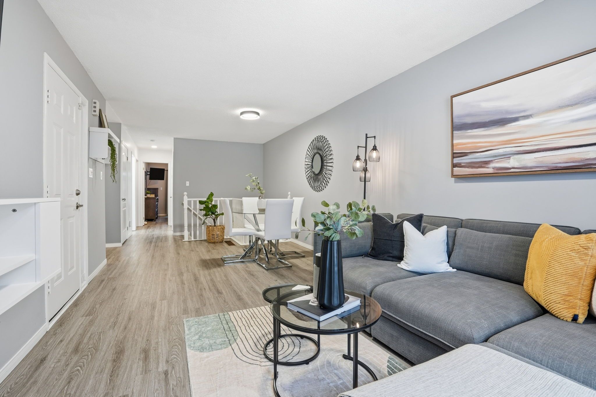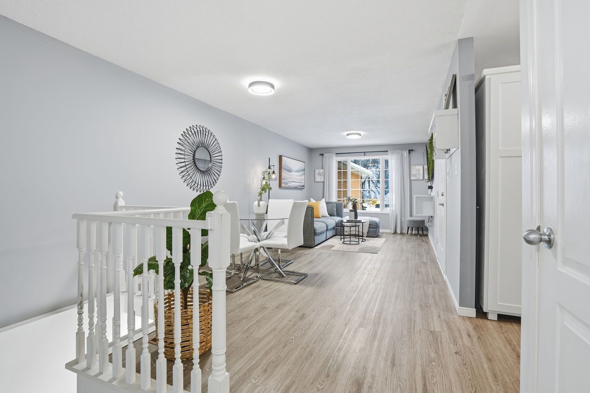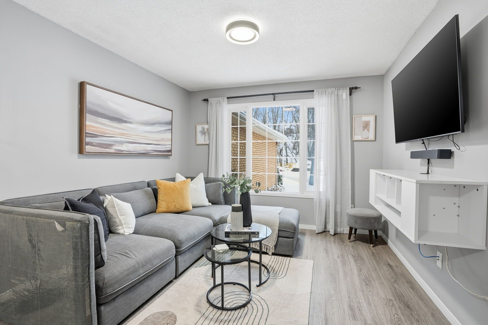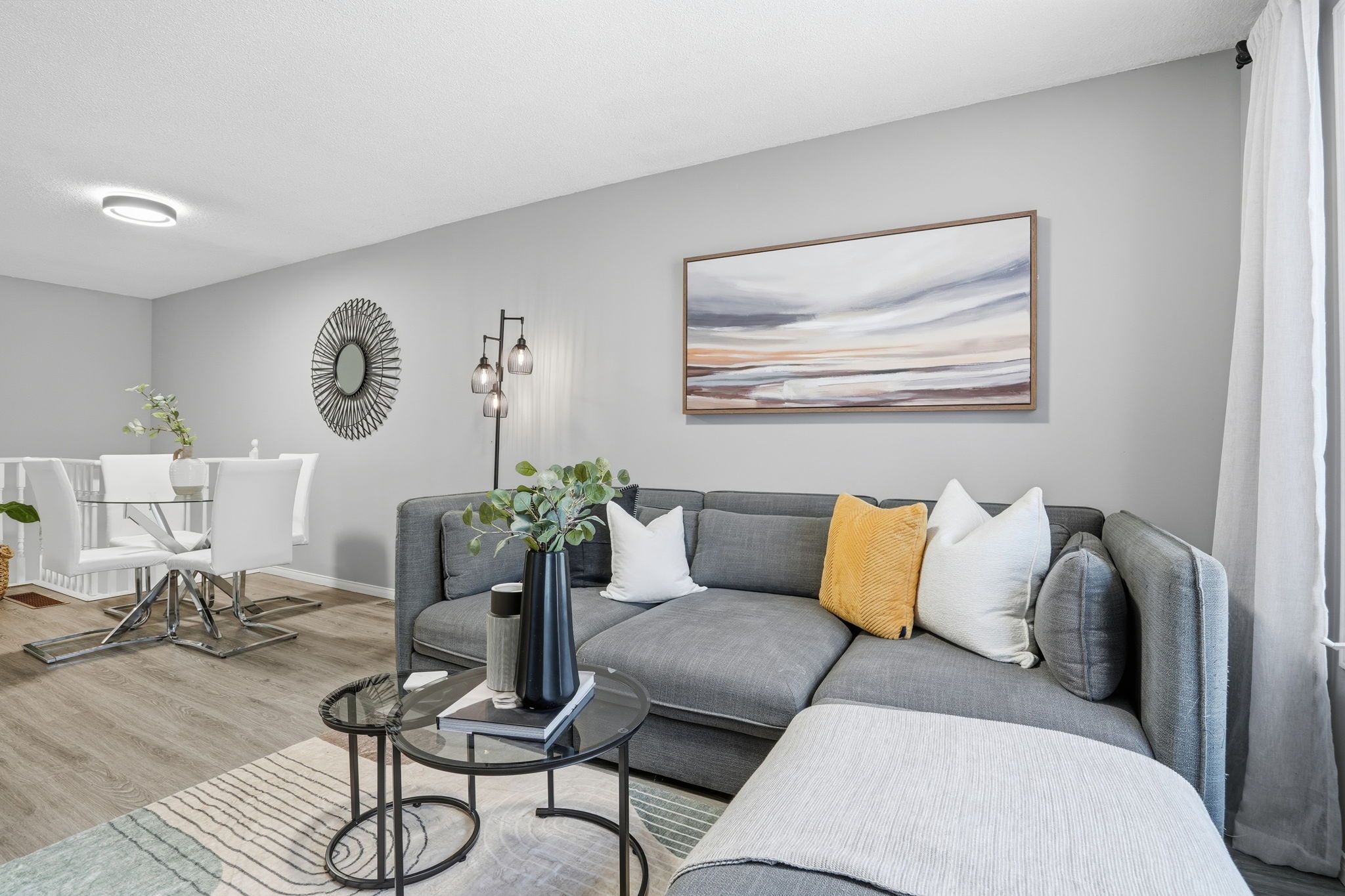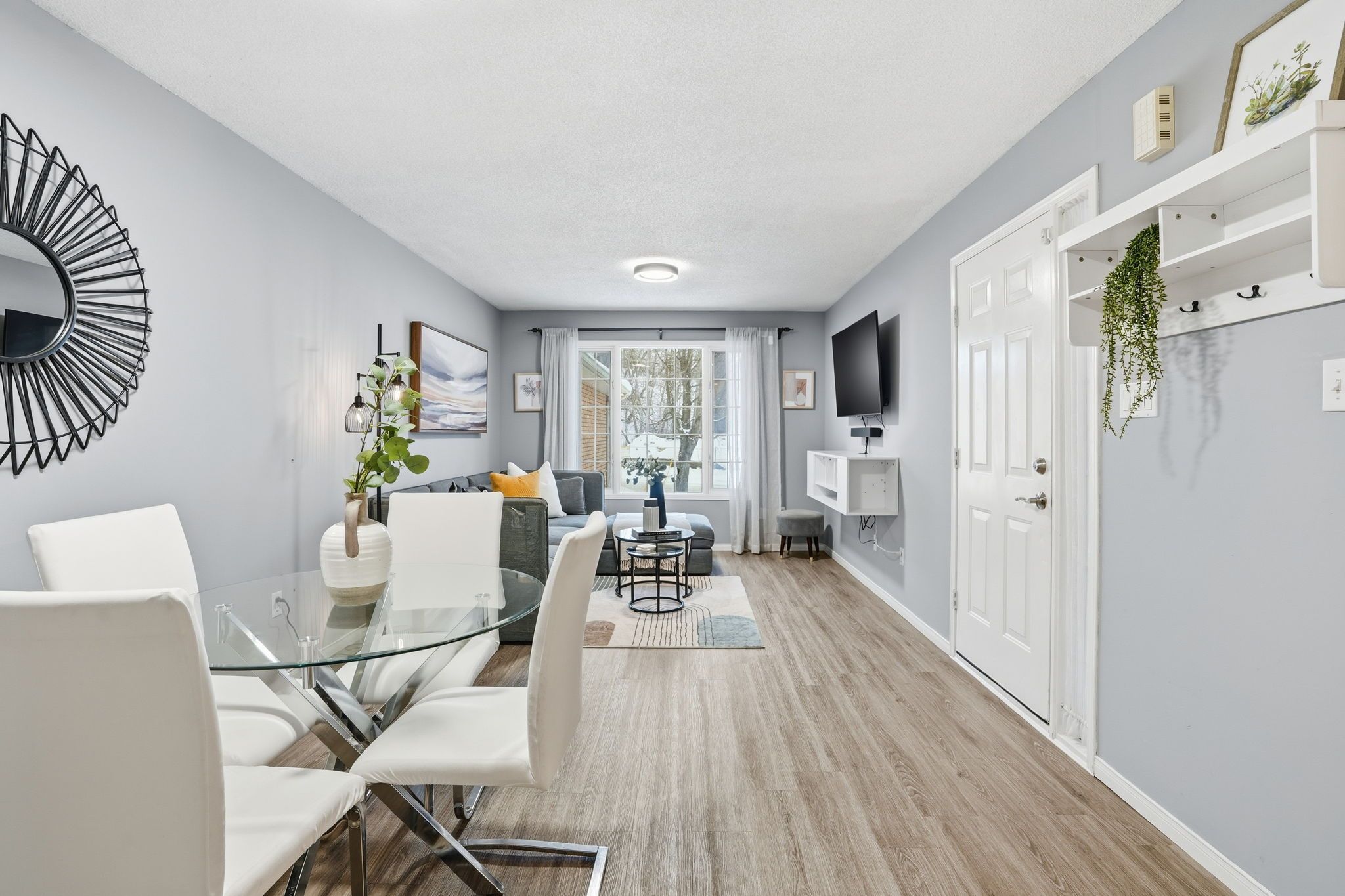• Bright living room with expansive window, leading to dining area.