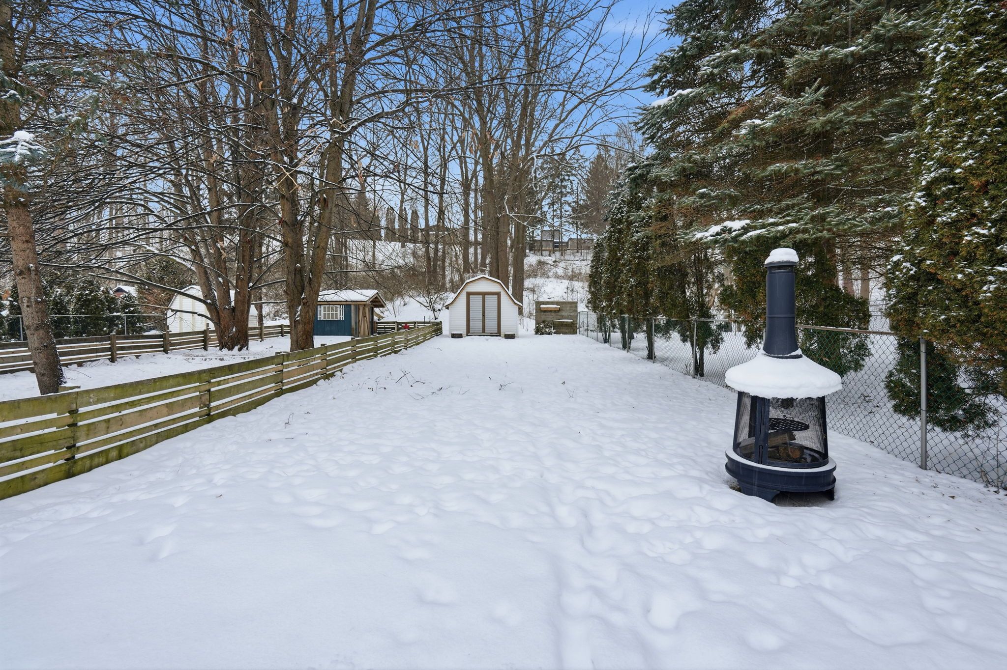 • Spacious backyard with an expansive deck, gazebo, and mature trees.