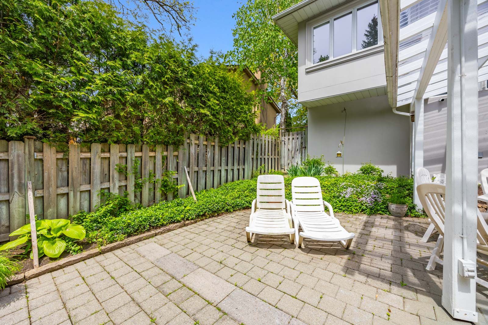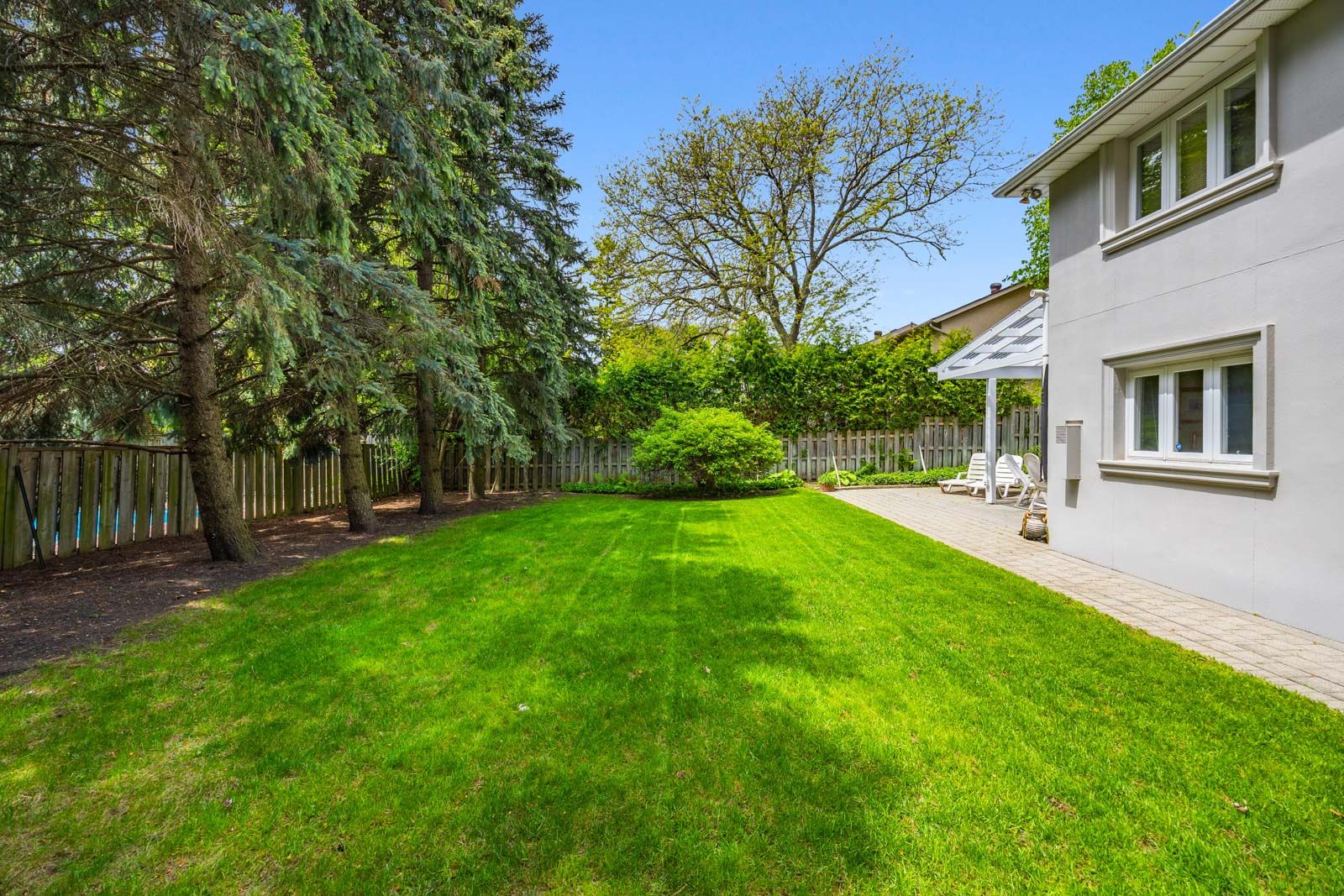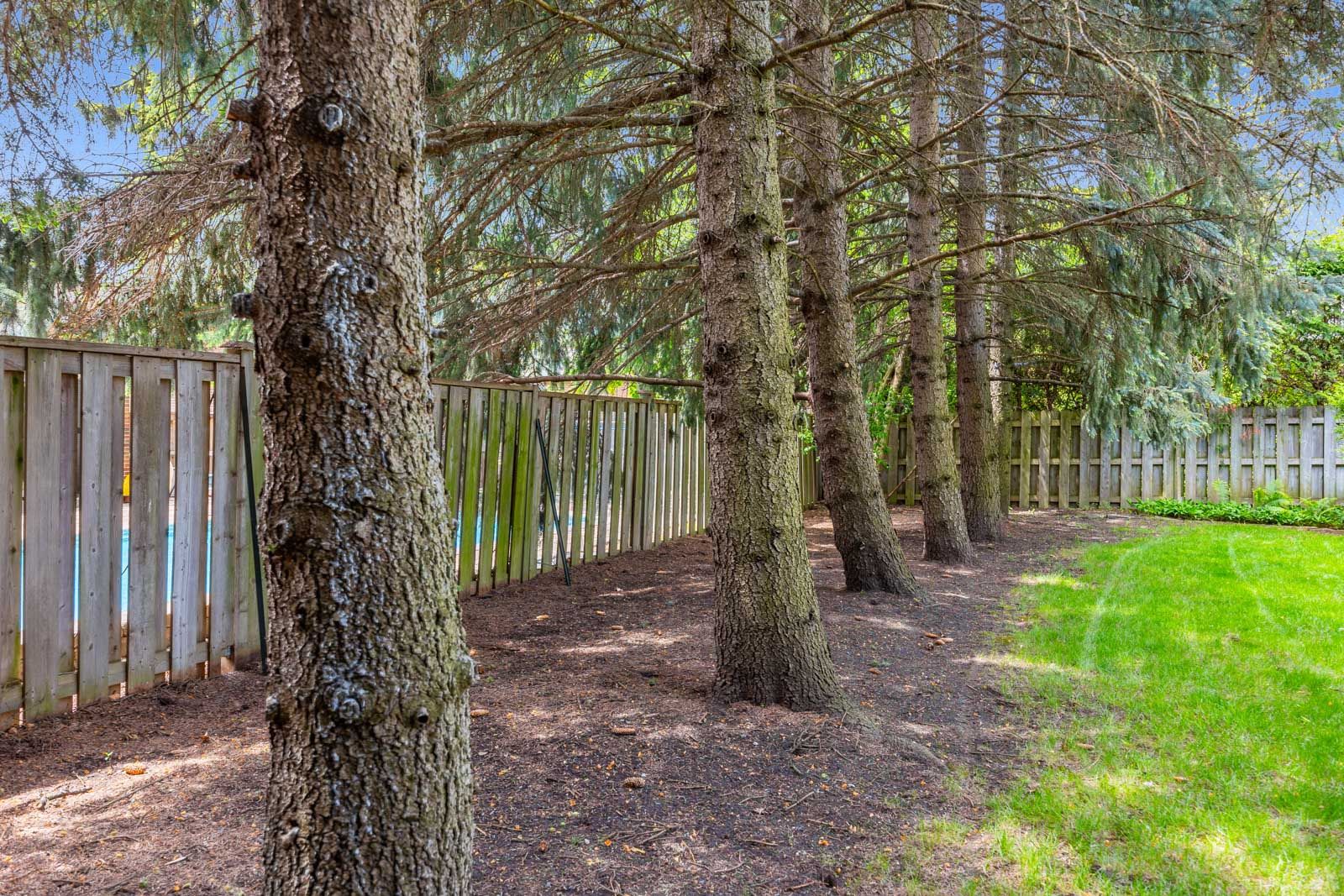 • Private fully fenced backyard featuring large evergreens.