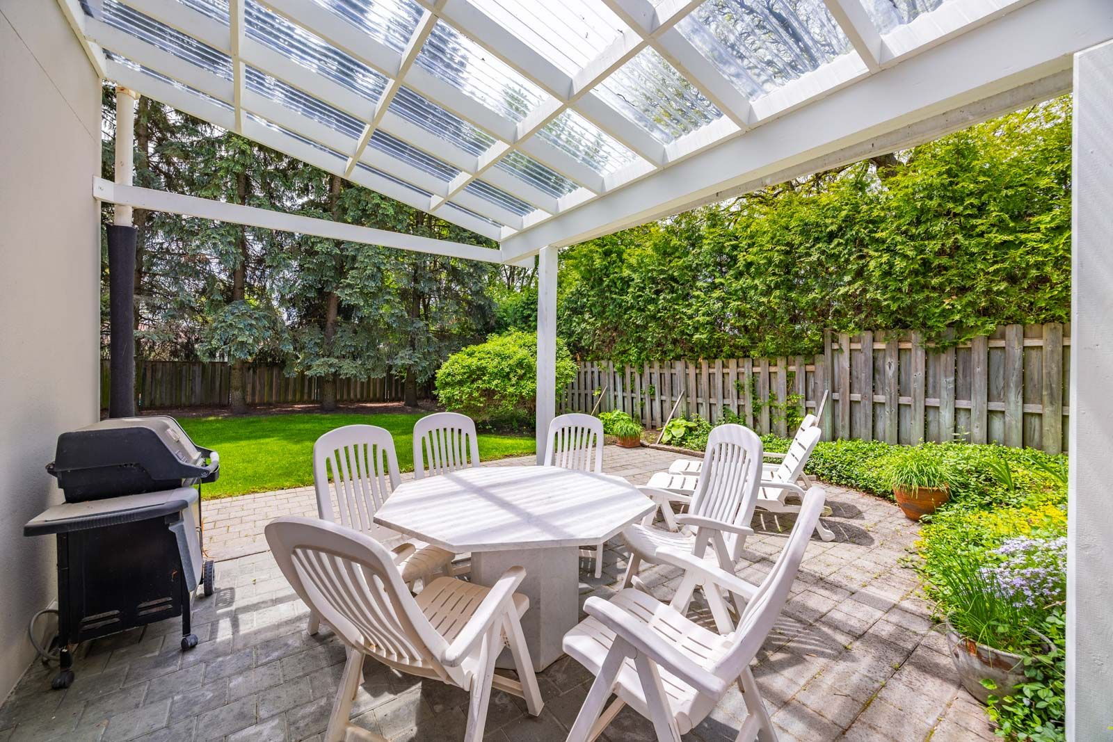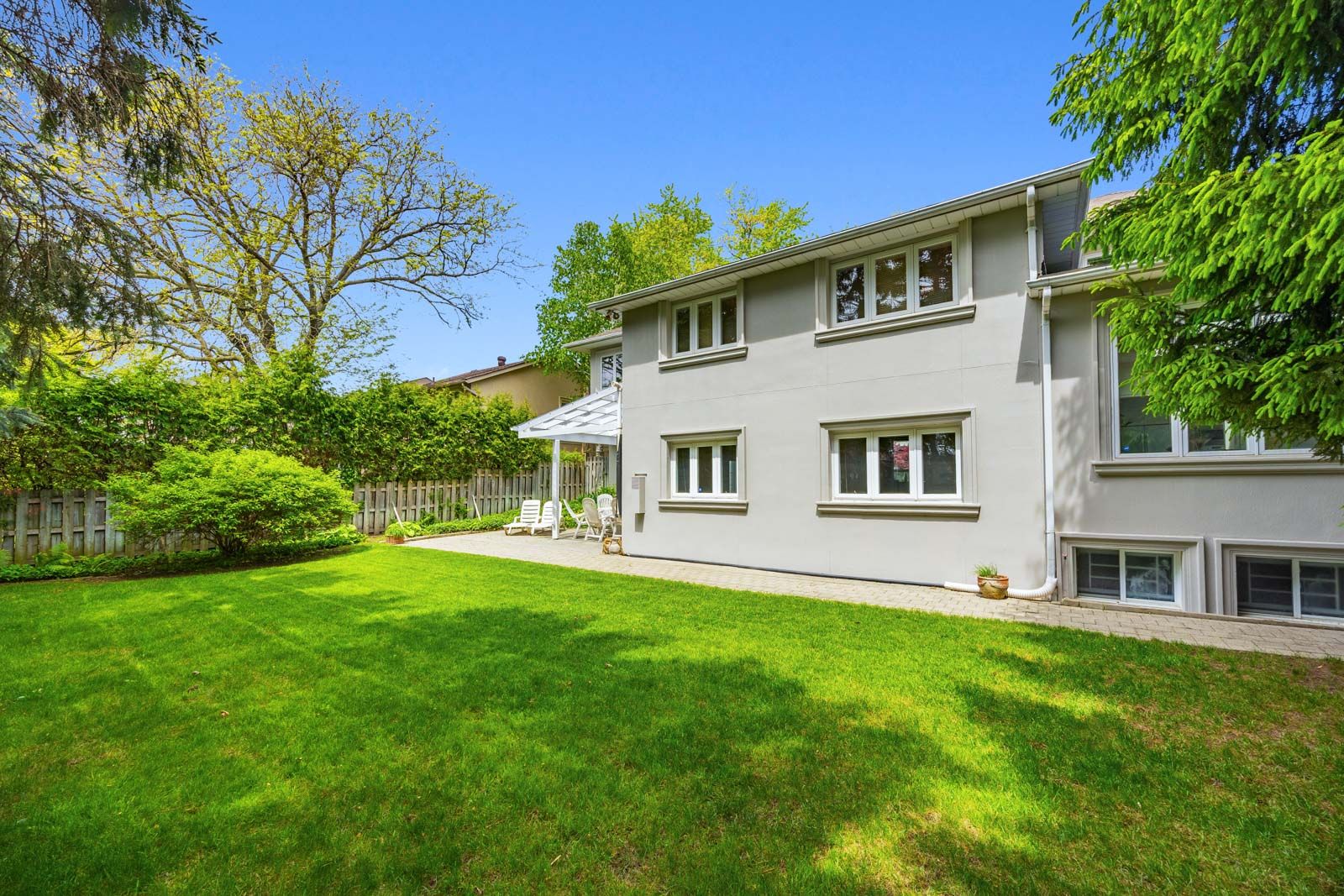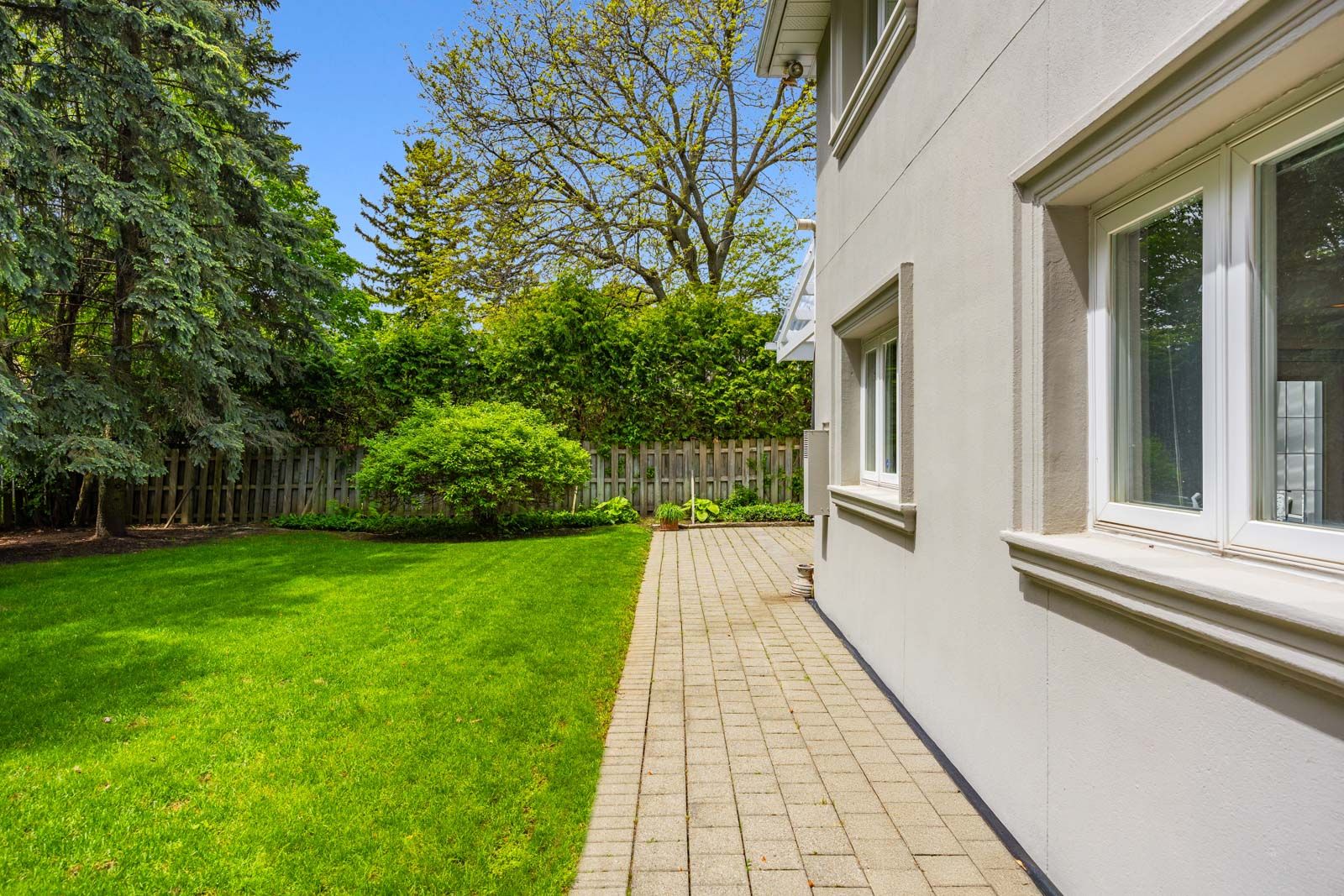• Private fully fenced backyard featuring large evergreens.