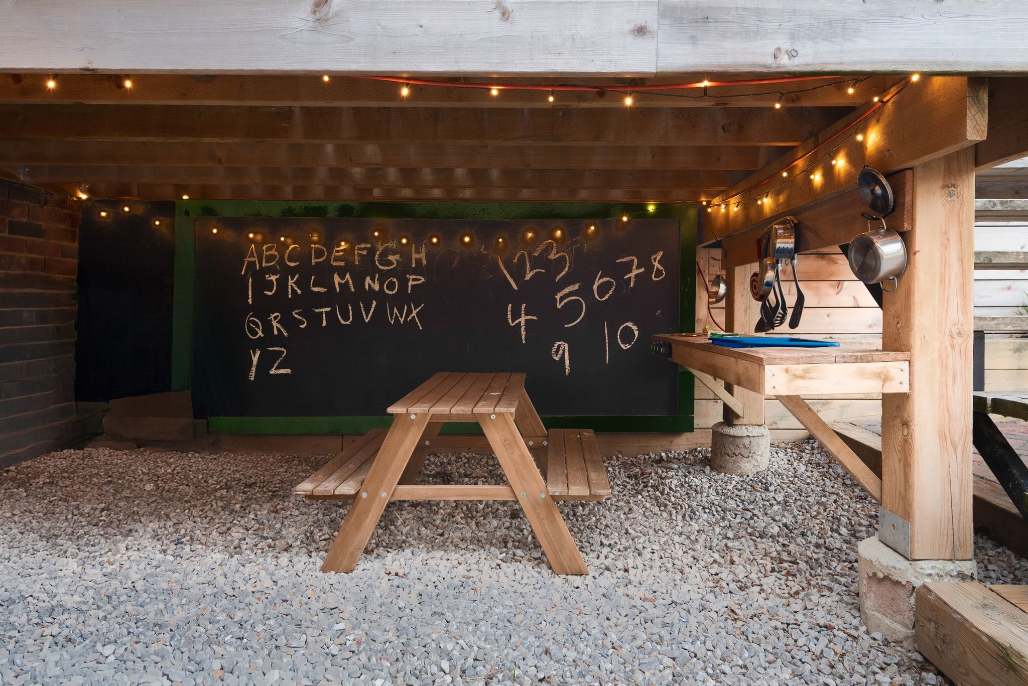 • Private backyard with trees, fire pit, and string lights for relaxing.