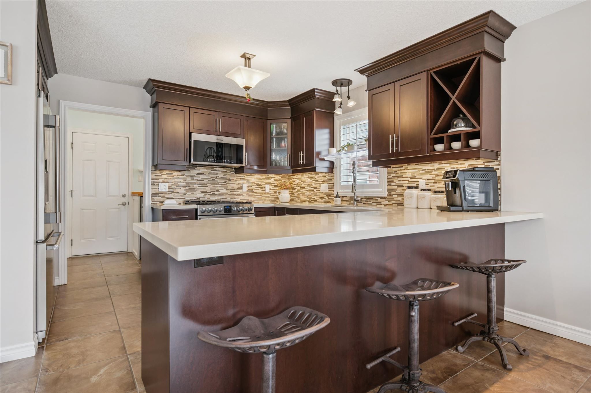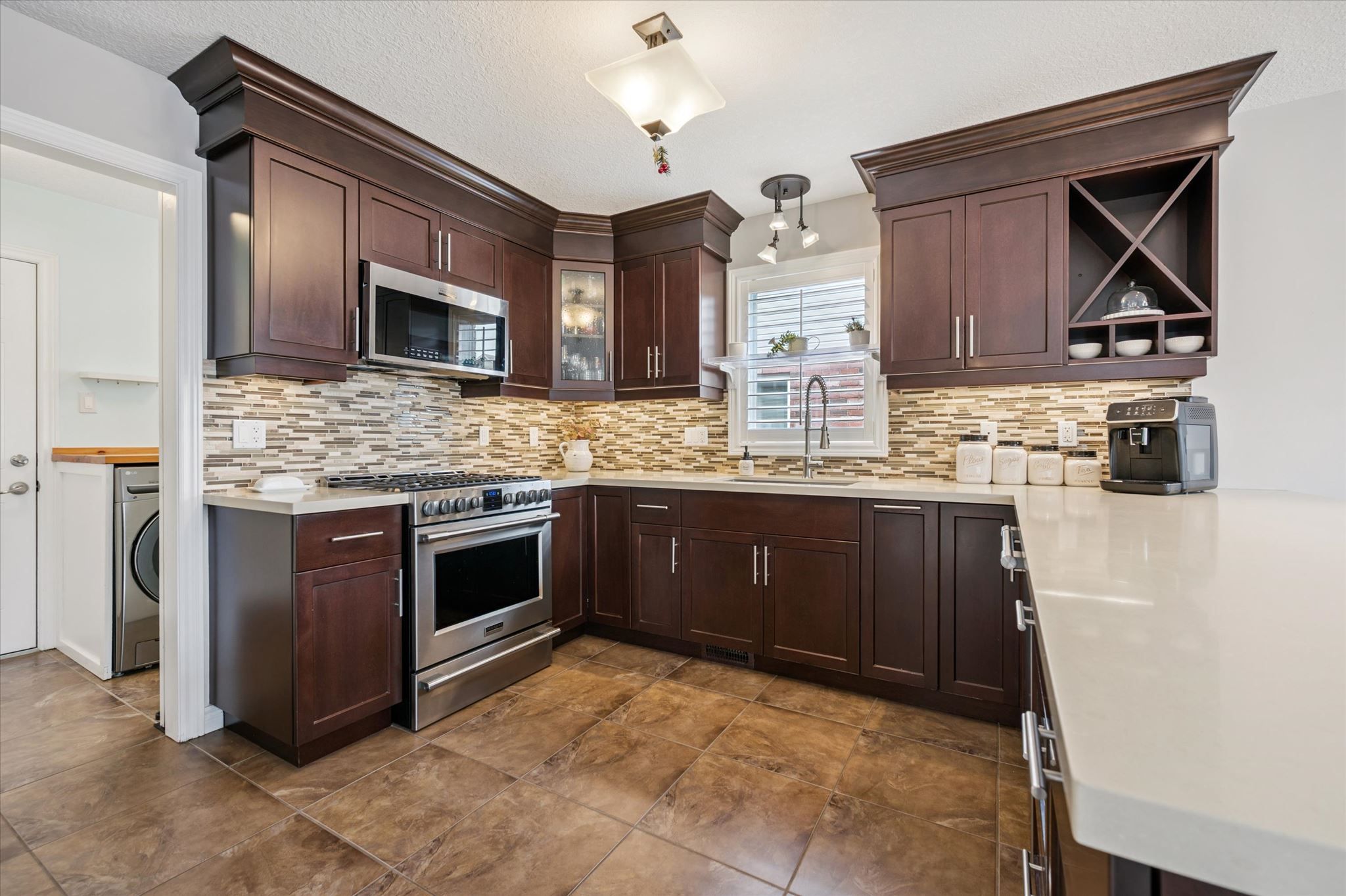 • Spacious kitchen featuring extended cabinetry and quartz countertops.